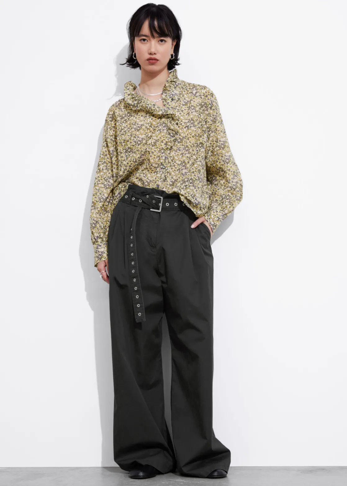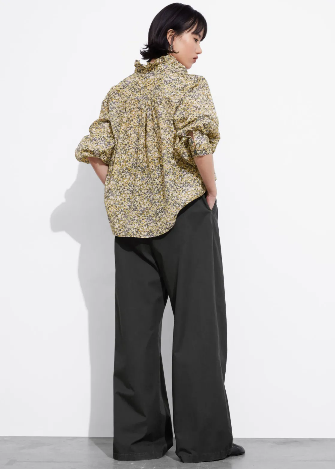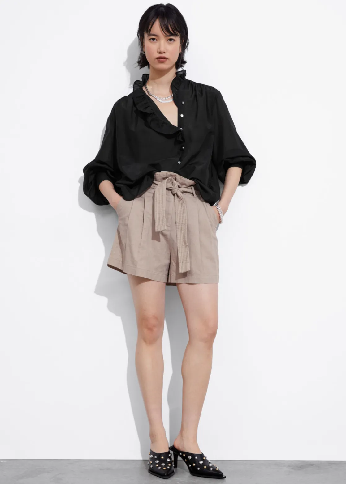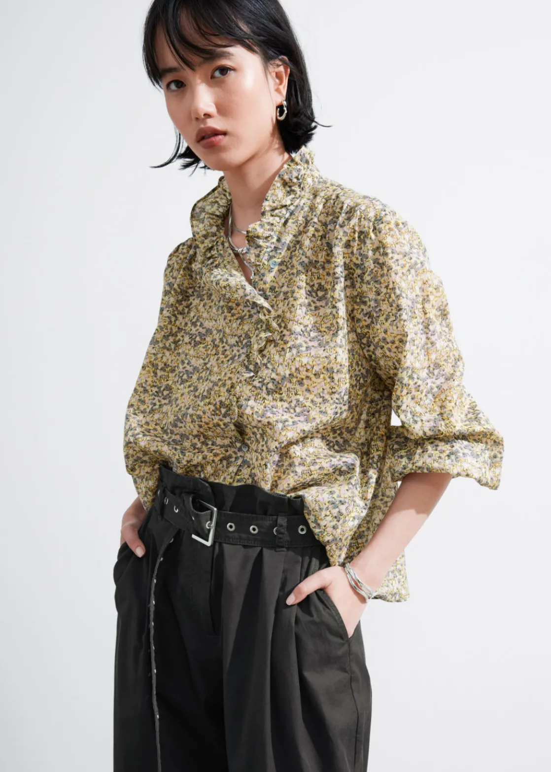 Long-sleeve blouse traced with frilled detailing along the collar and upper lapel.