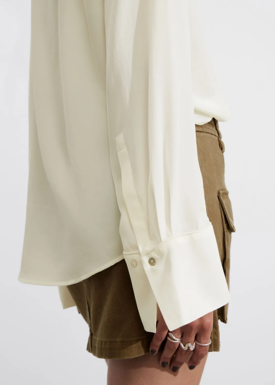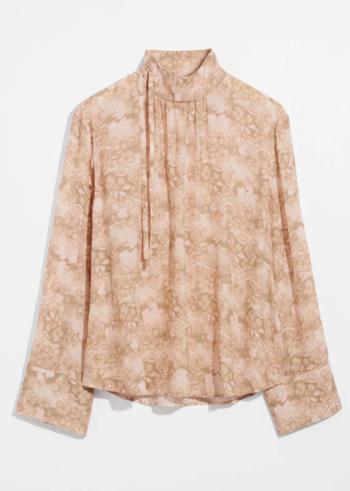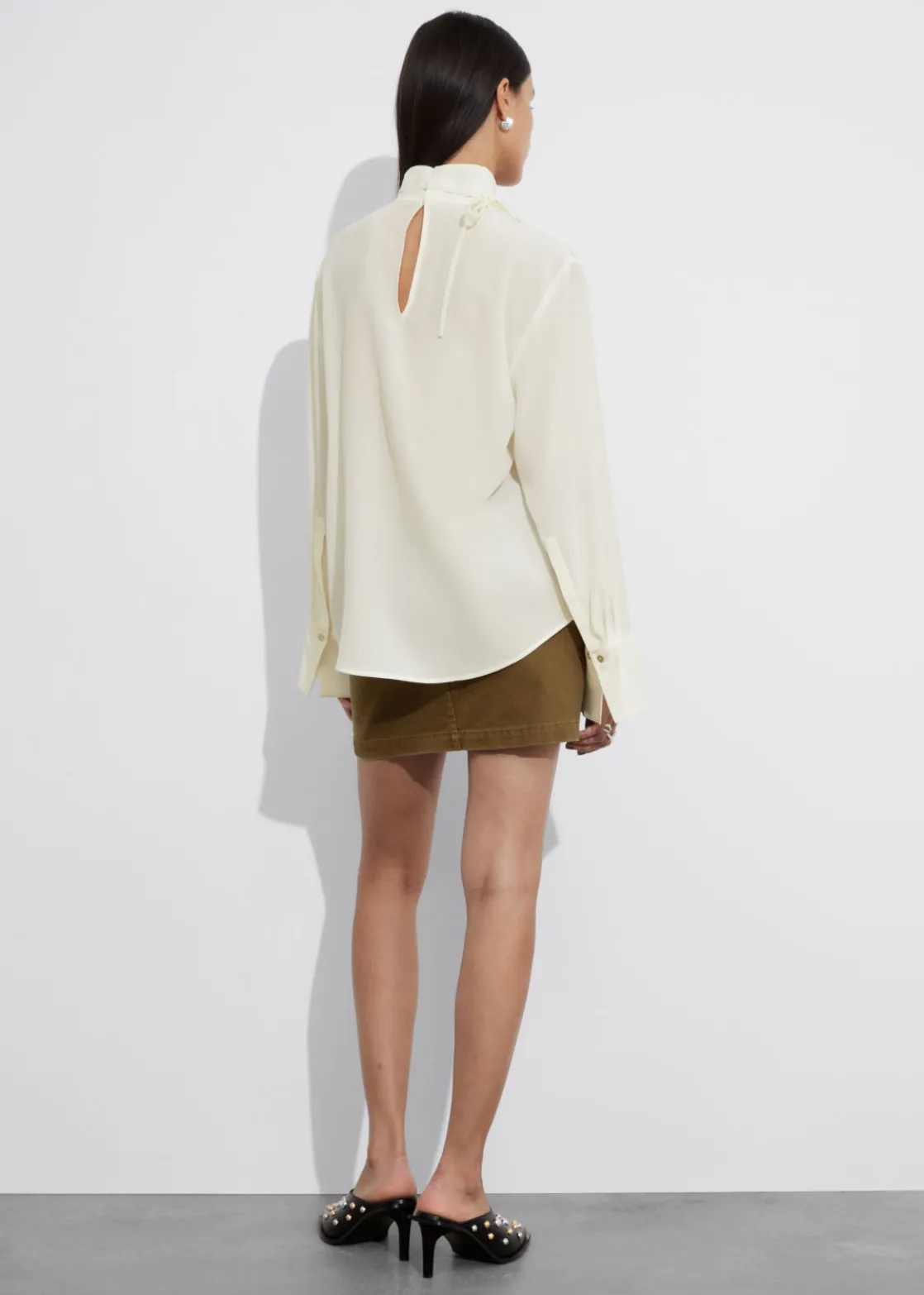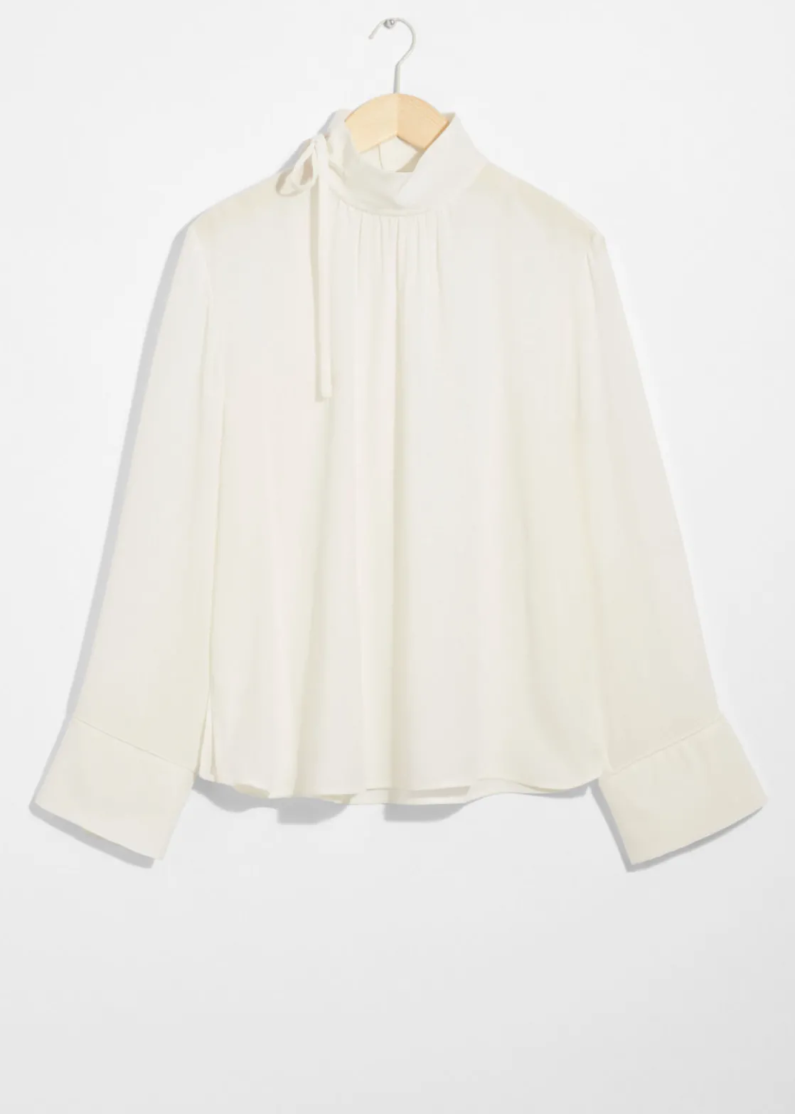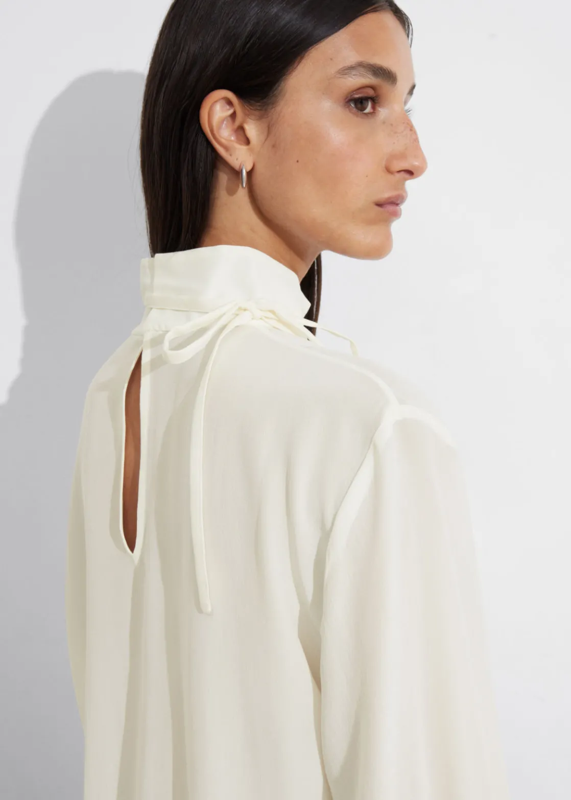 Long-sleeve blouse cut from mulberry silk. Featuring a high collar with ties.