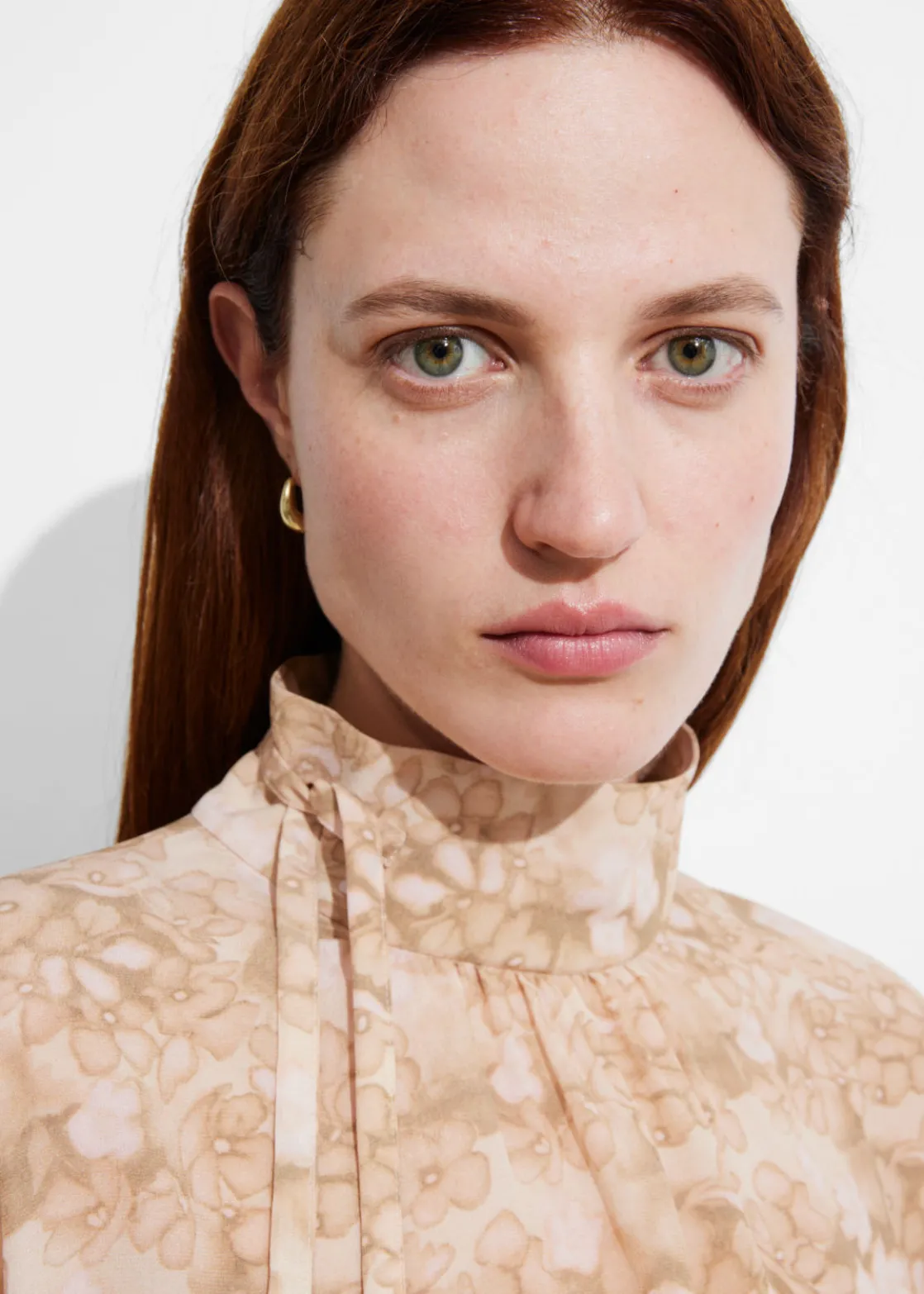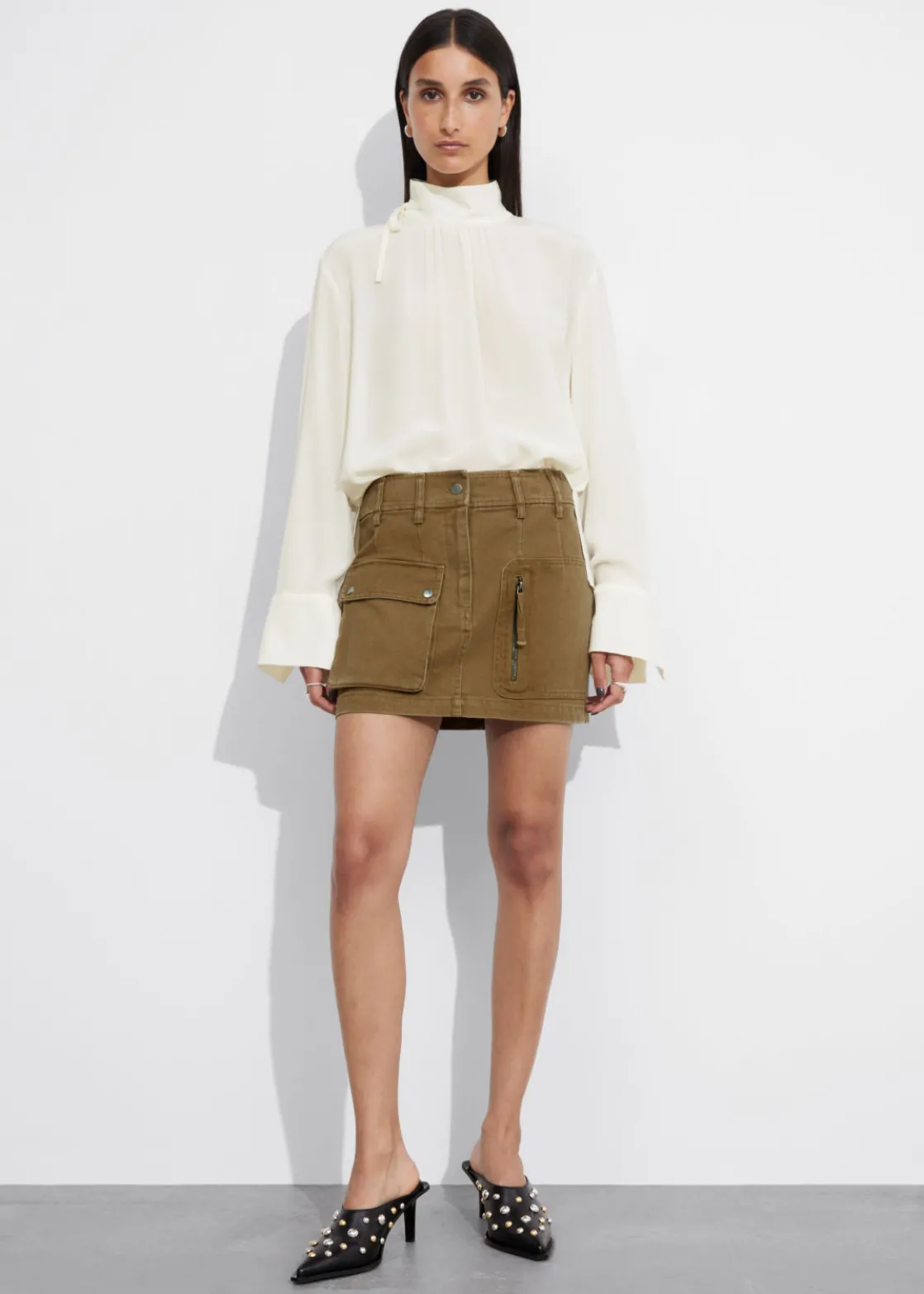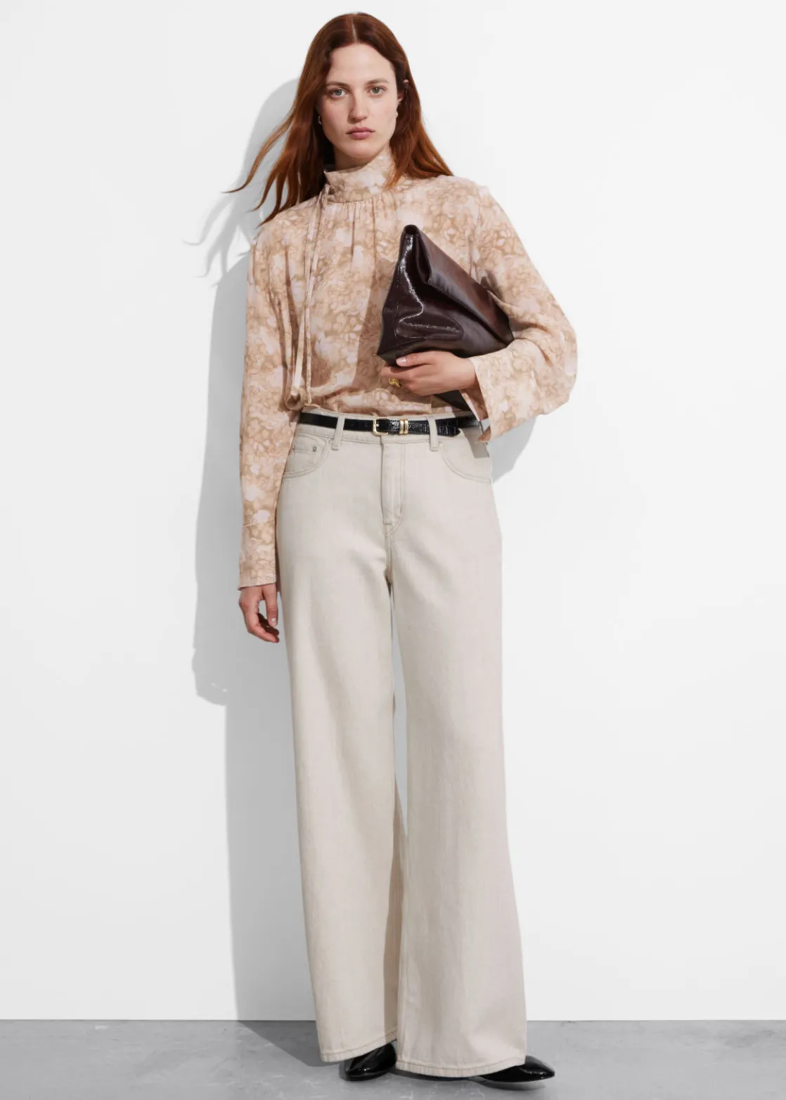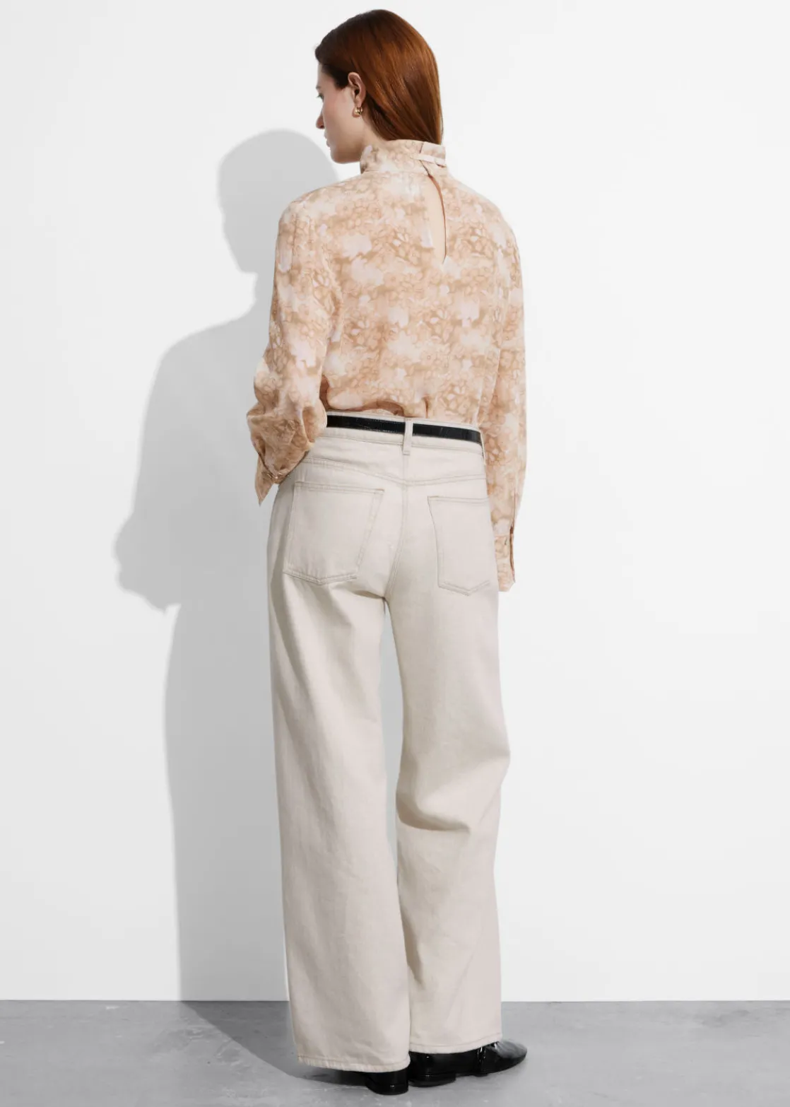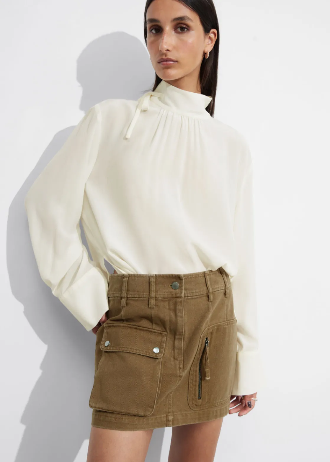 Long-sleeve blouse cut from mulberry silk. Featuring a high collar with ties.