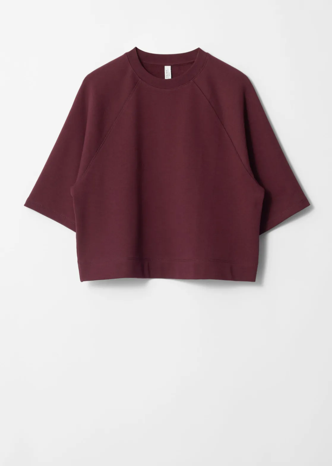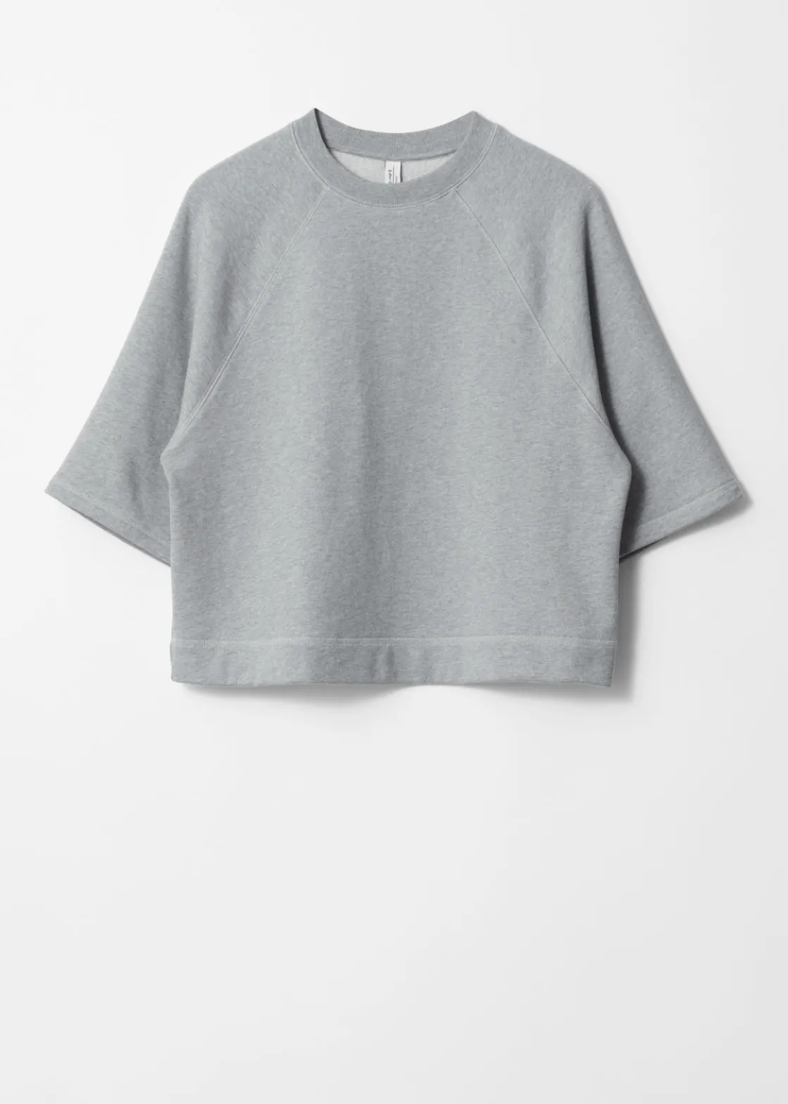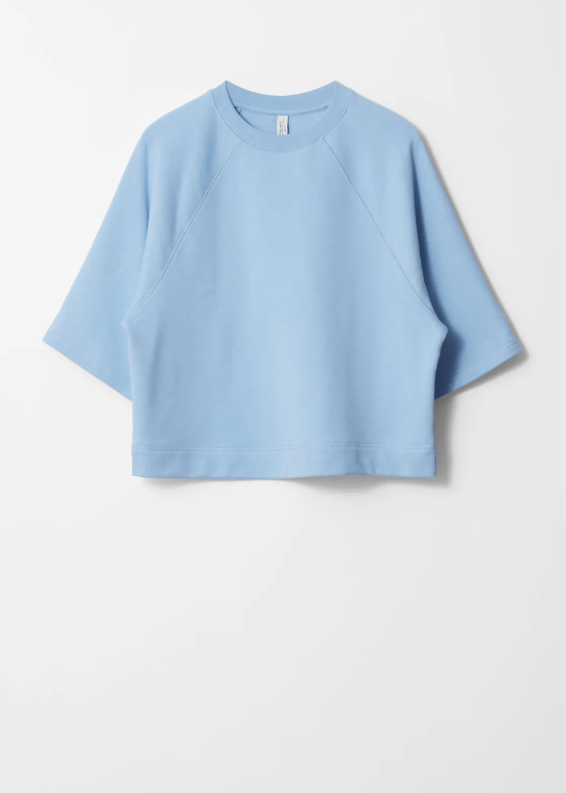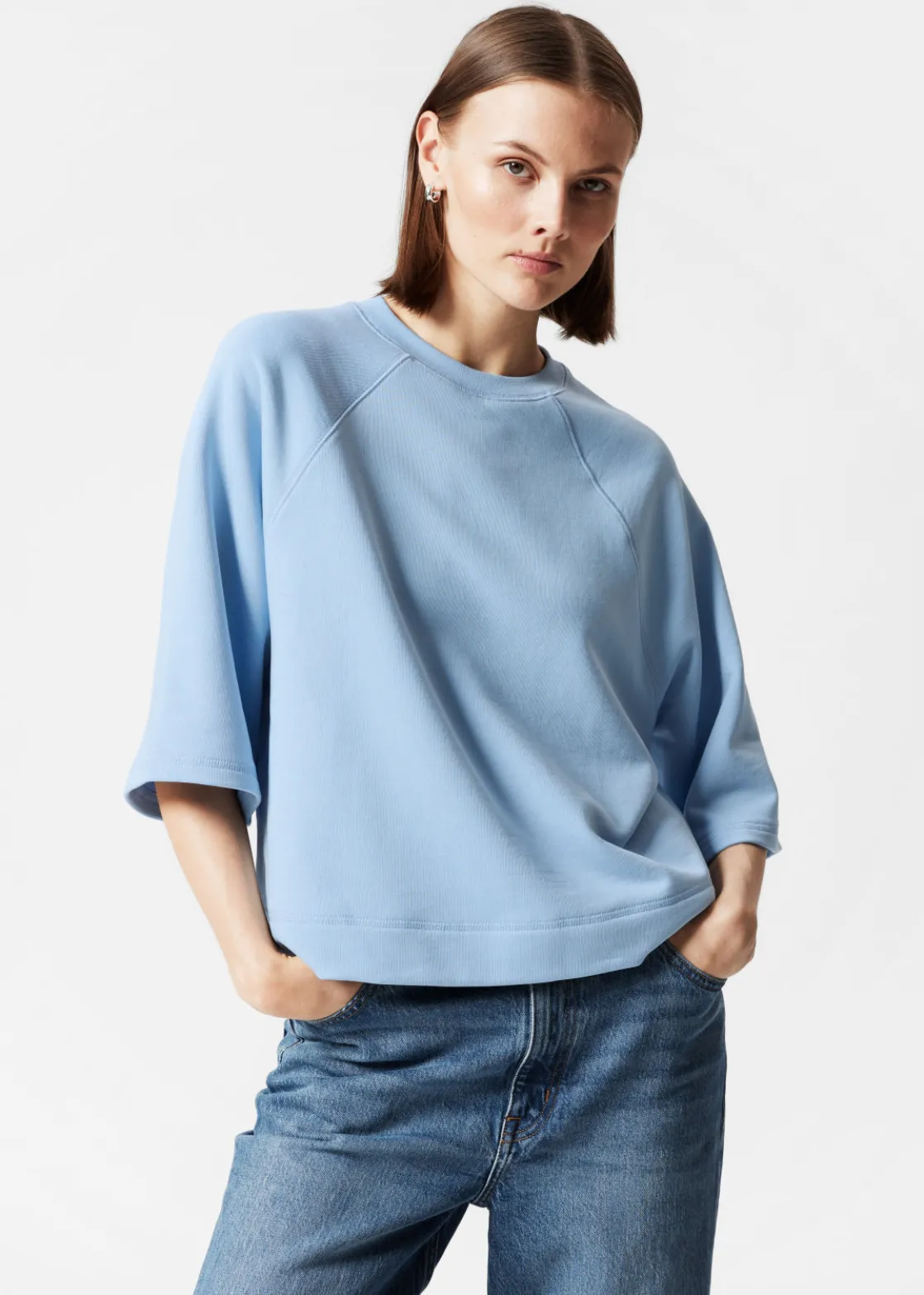 Cotton jersey sweater featuring three-quarter raglan sleeves.