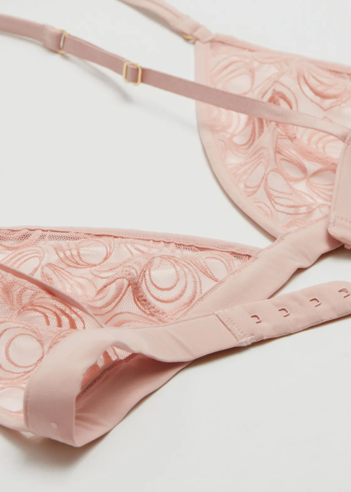 Triangle soft bra cut from soft fancy elastic lace detailed with embroidery. Finished with adjustable shoulder straps and back hook closure.