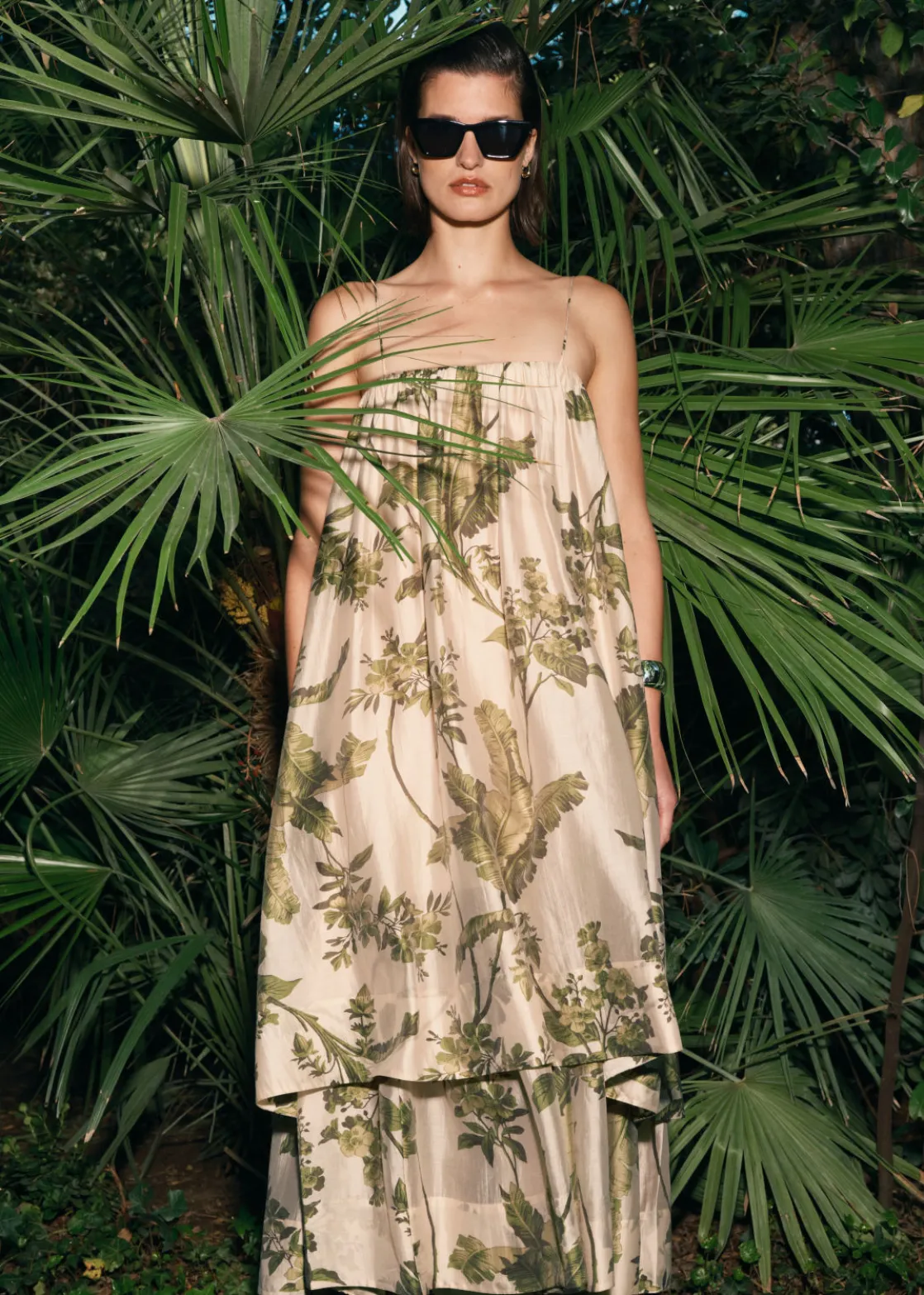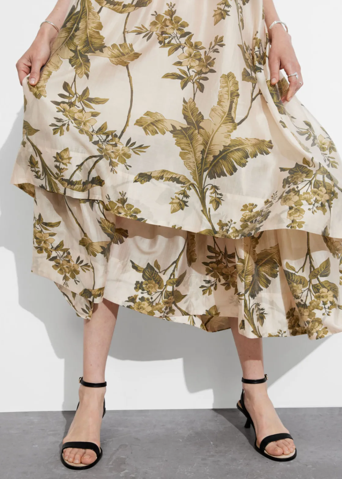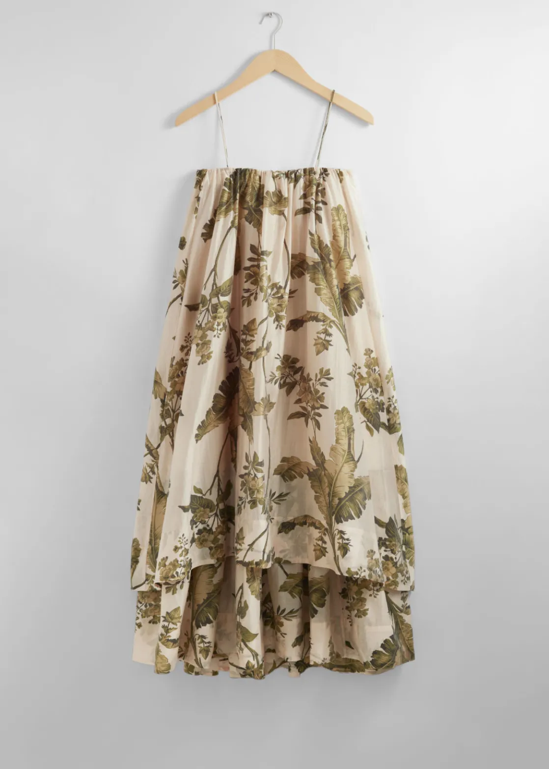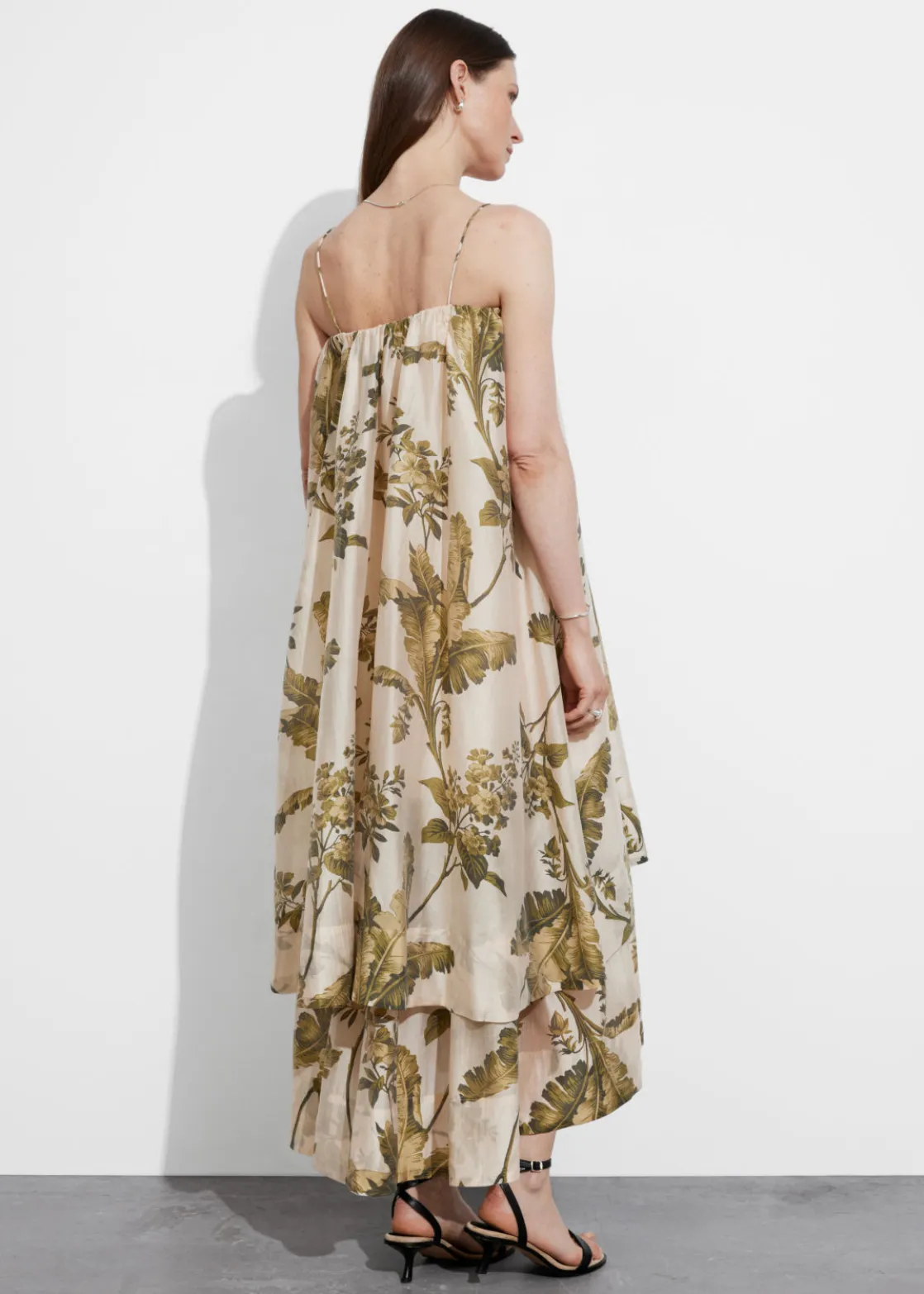 A-line midi dress featuring a layered silhouette and spaghetti shoulder straps.
