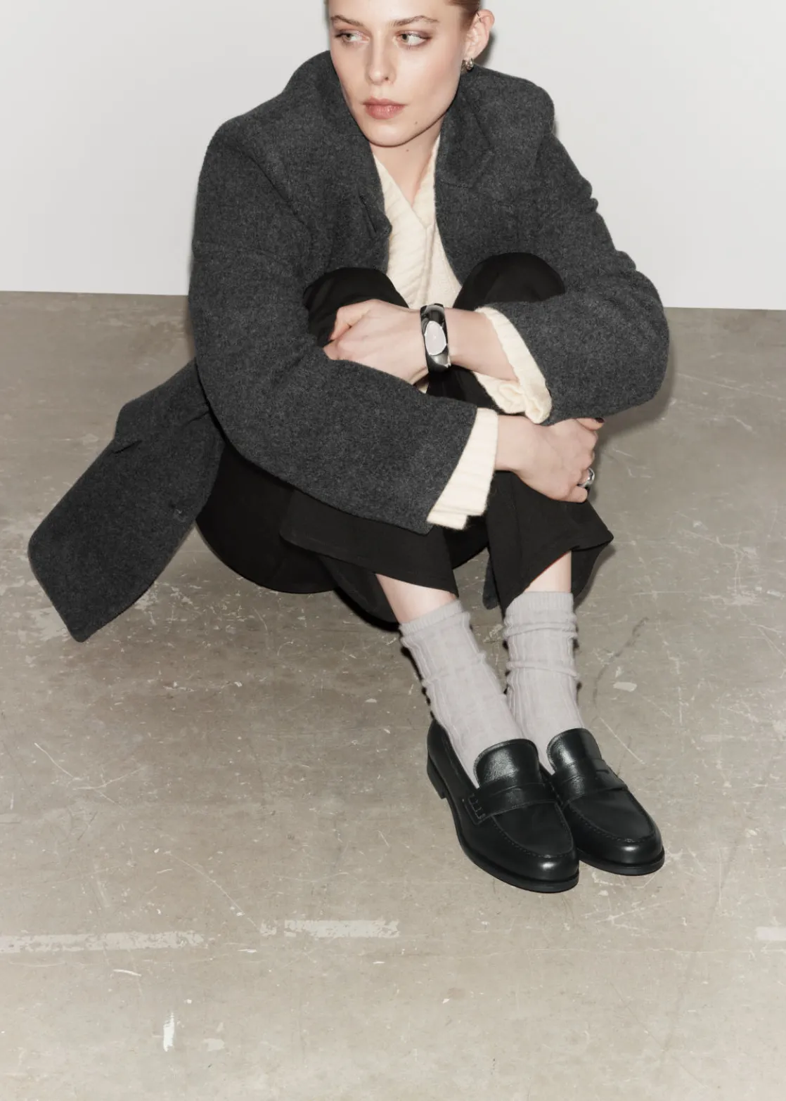 Classic penny loafers crafted from polished nappa leather. A slip-on style featuring stitched details, resting on slight heels.