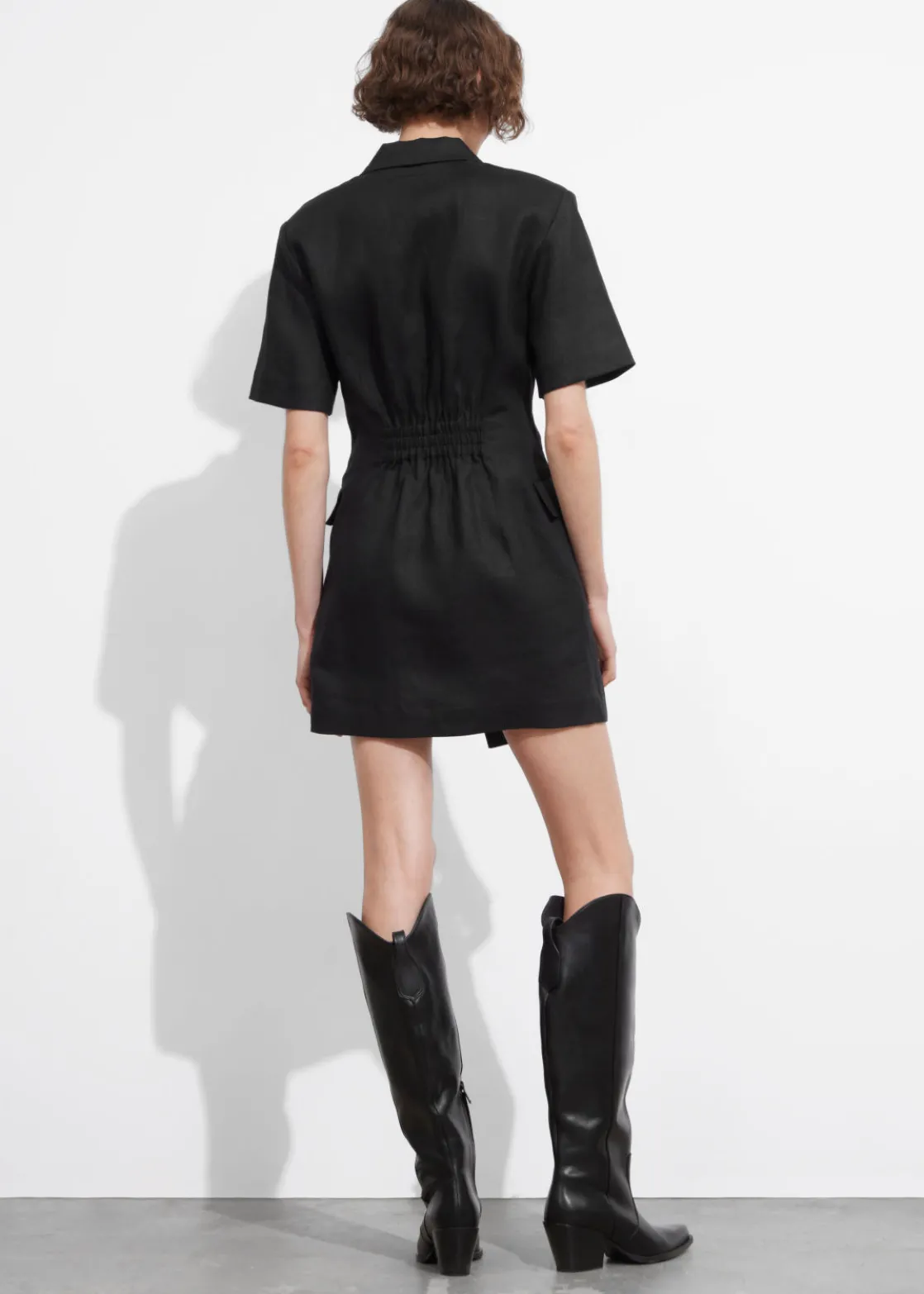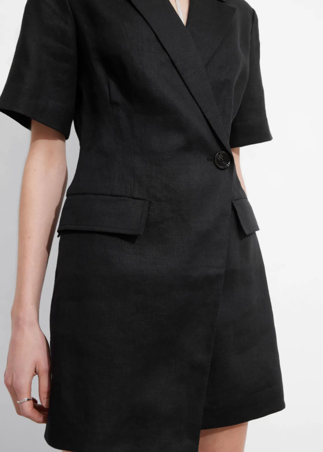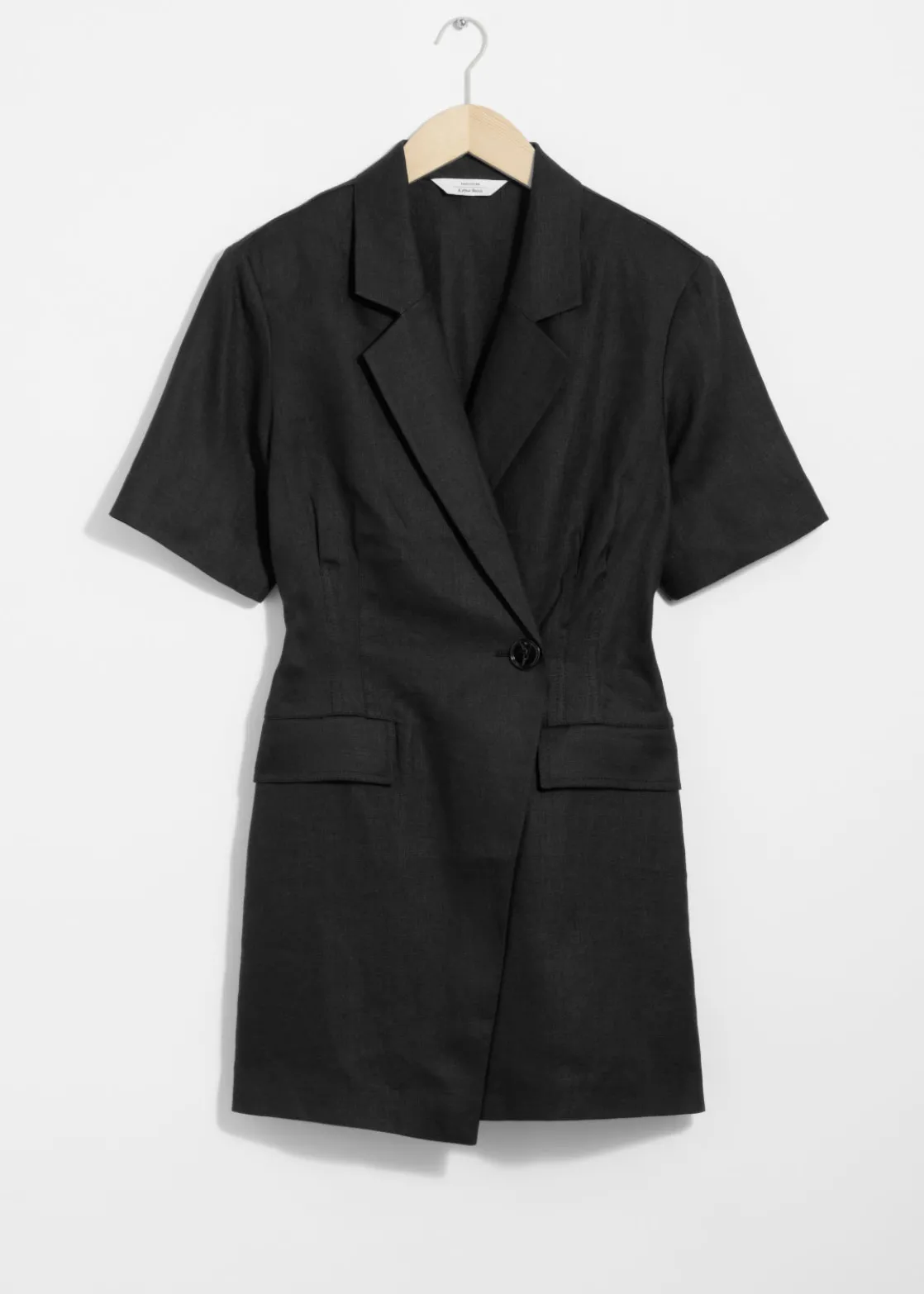 Short-sleeve linen blazer mini dress featuring an accentuated waistline and a tailored finish.