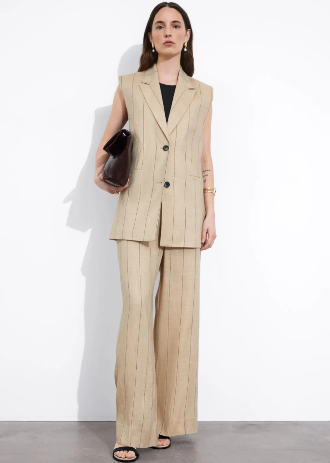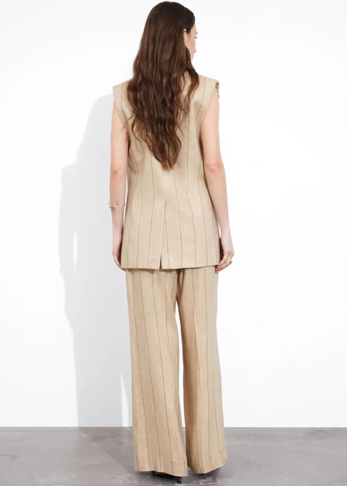 Linen-blend vest featuring a tailored, blazer-inspired finish with padded shoulders.