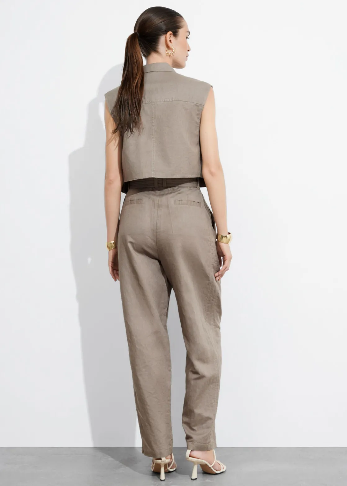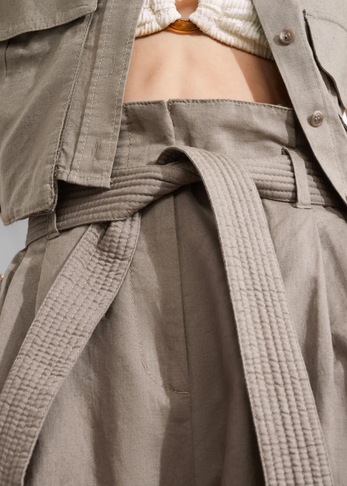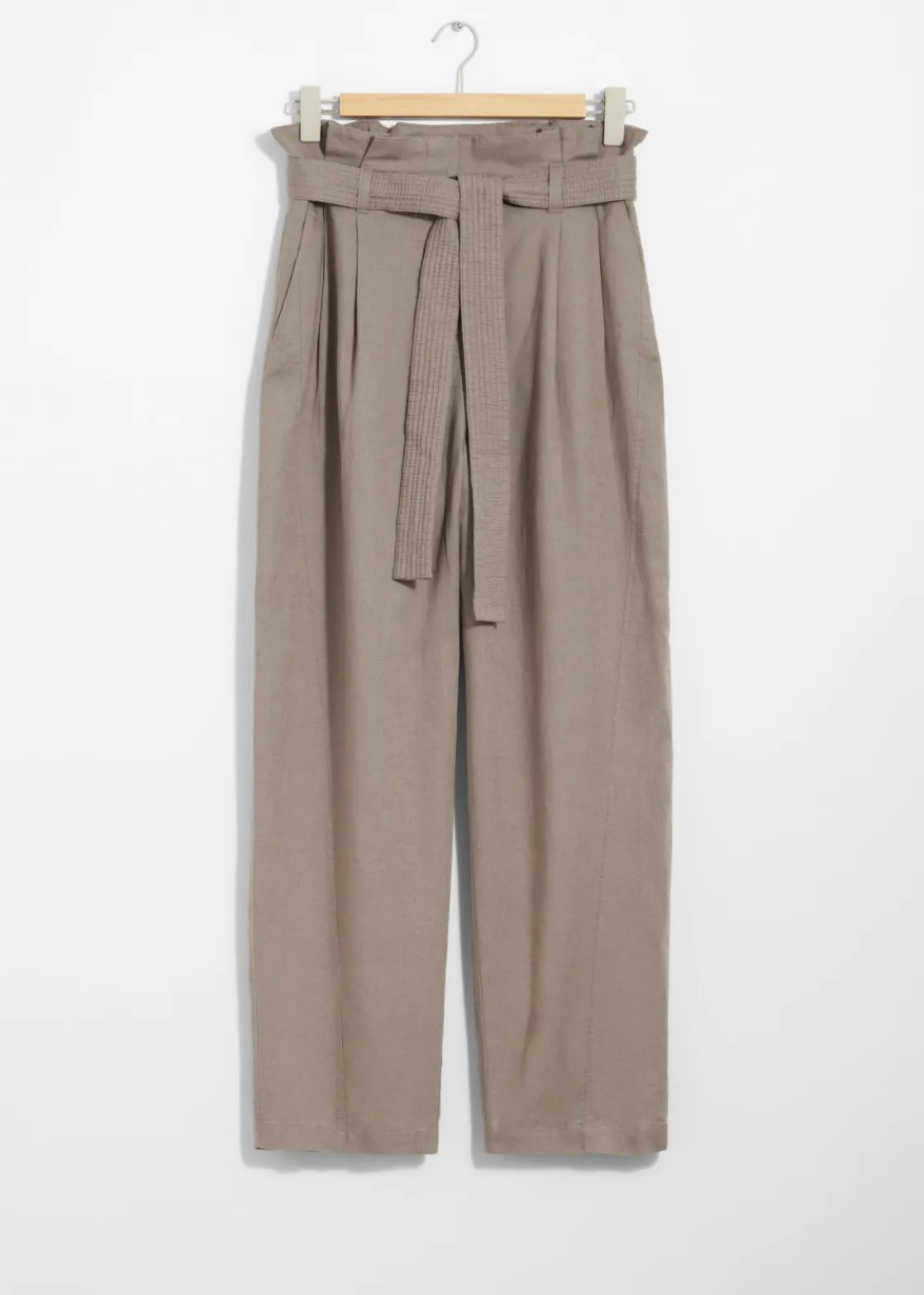 Trousers made from a linen-blend. Featuring a high paperbag waist and duo side pockets.
