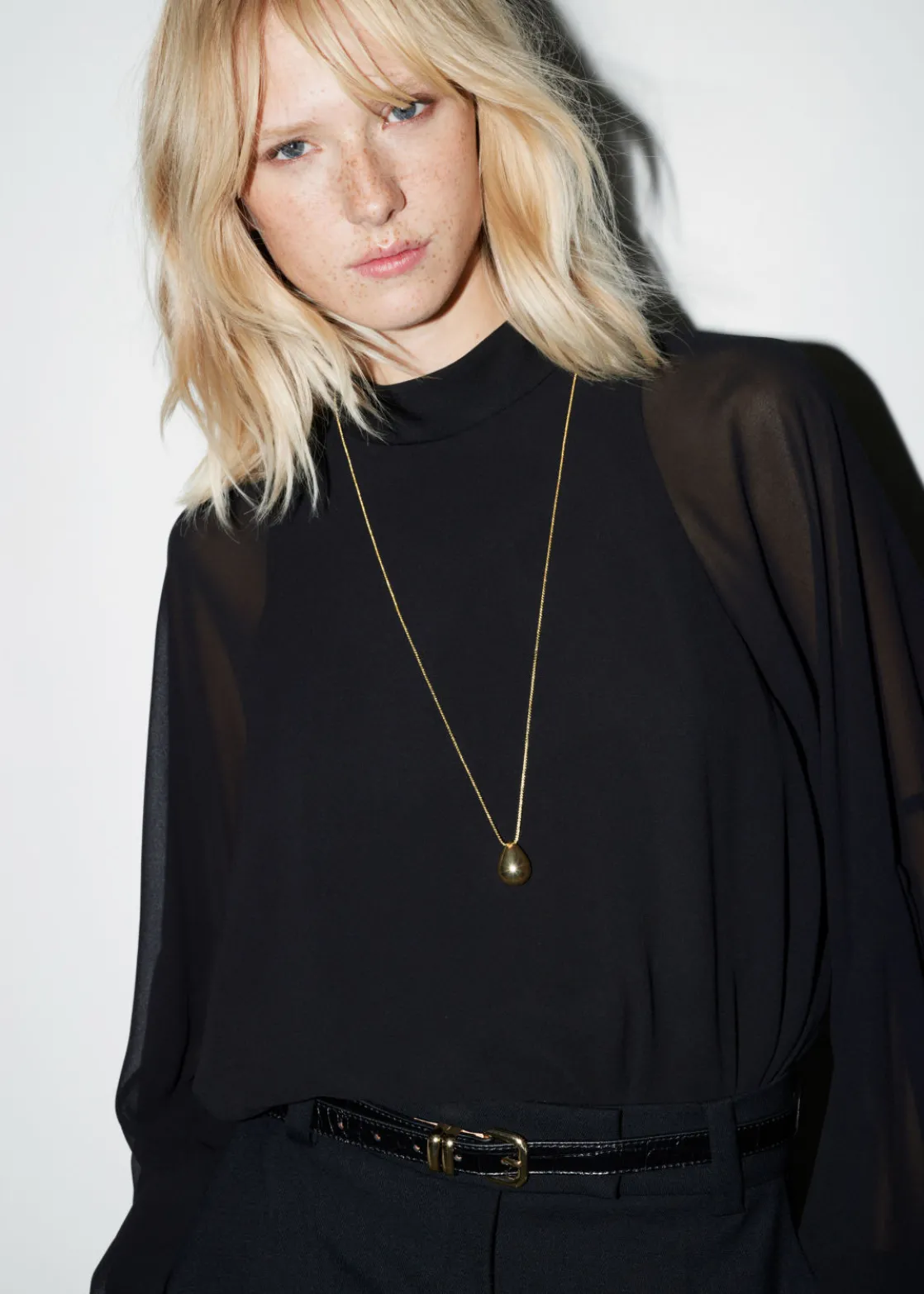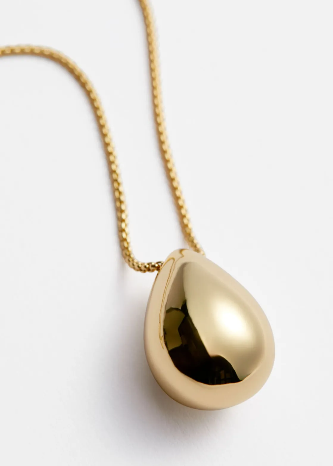 This long chain necklace is designed in a minimalist style. Cast from brass, the necklace is strung with a polished plated drop pendant.