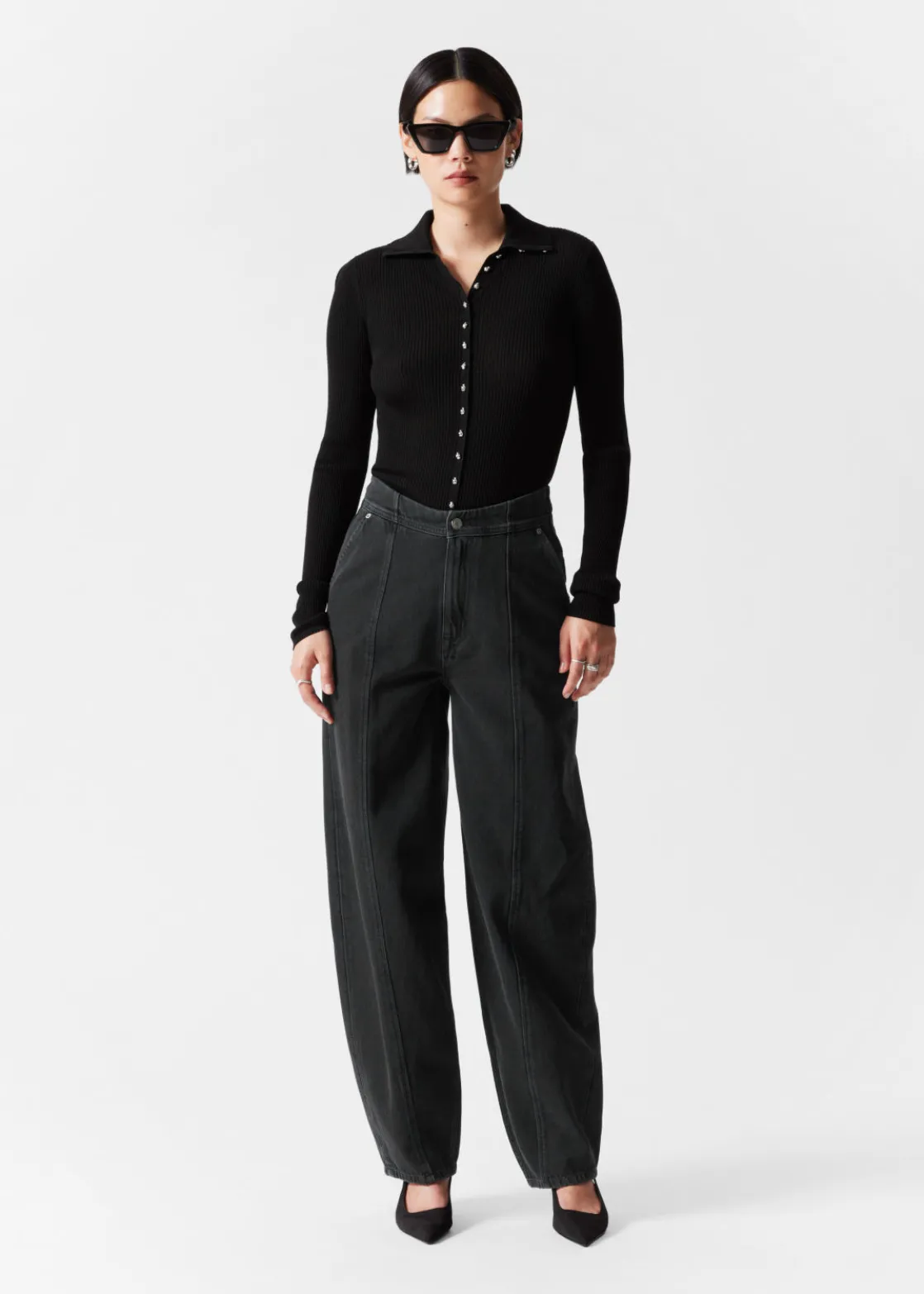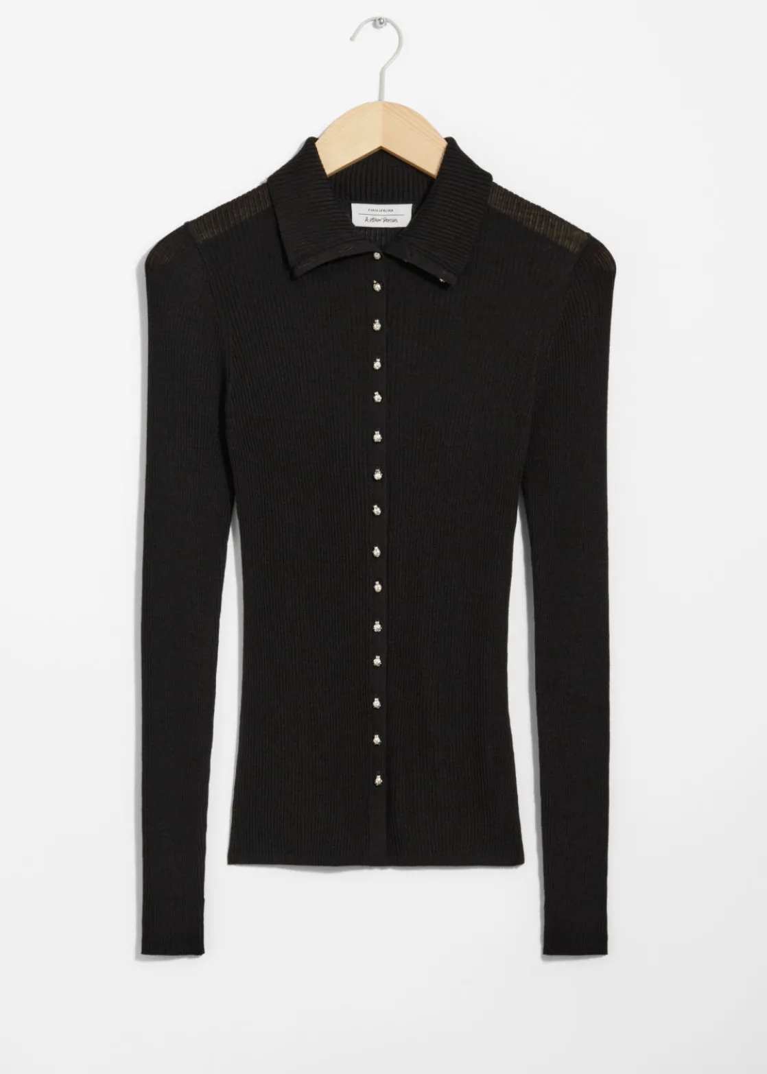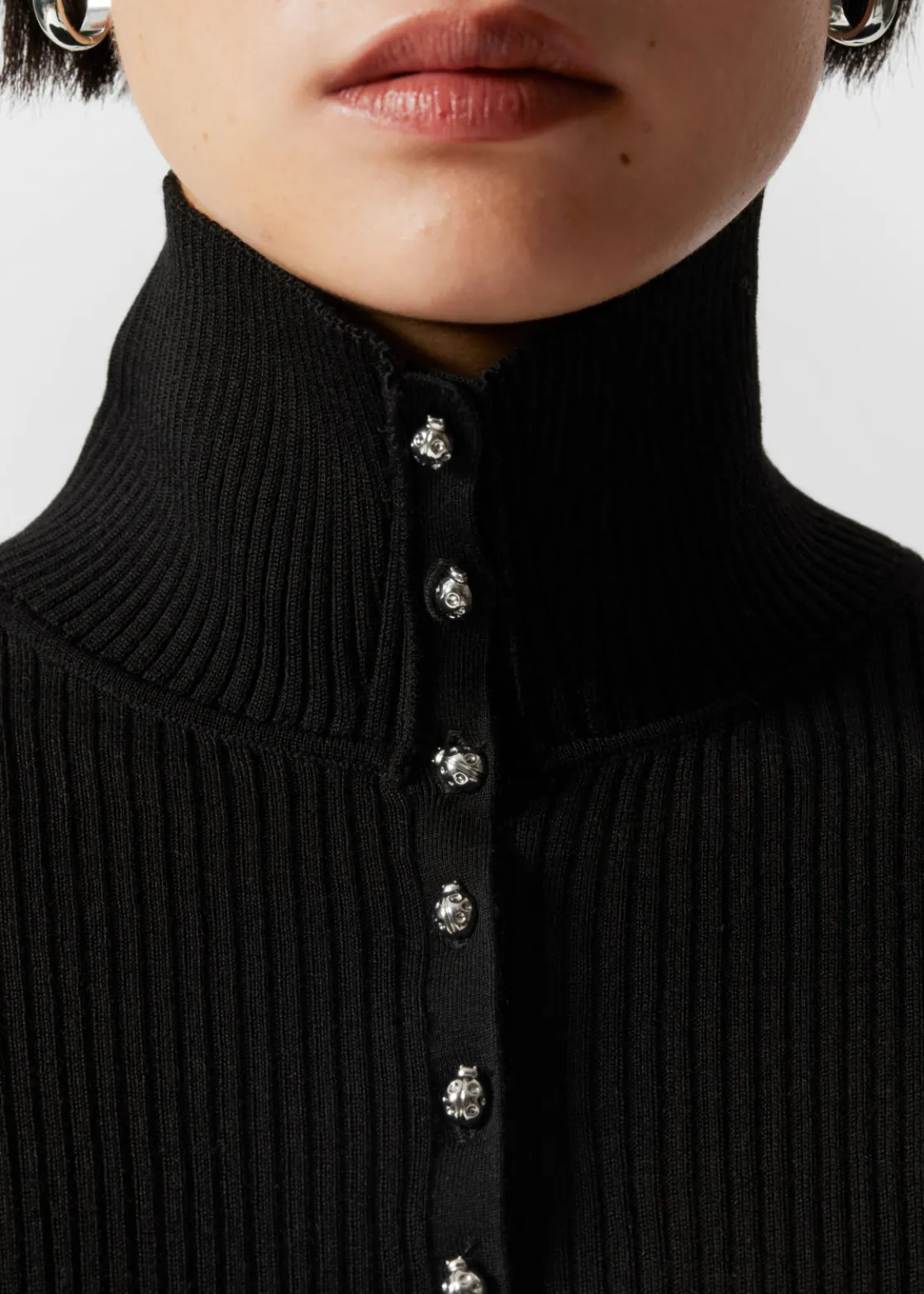 Ribbed cardigan knitted from a merino wool blend. Featuring a high neck that can be buttoned down and styled as a turn-down collar.