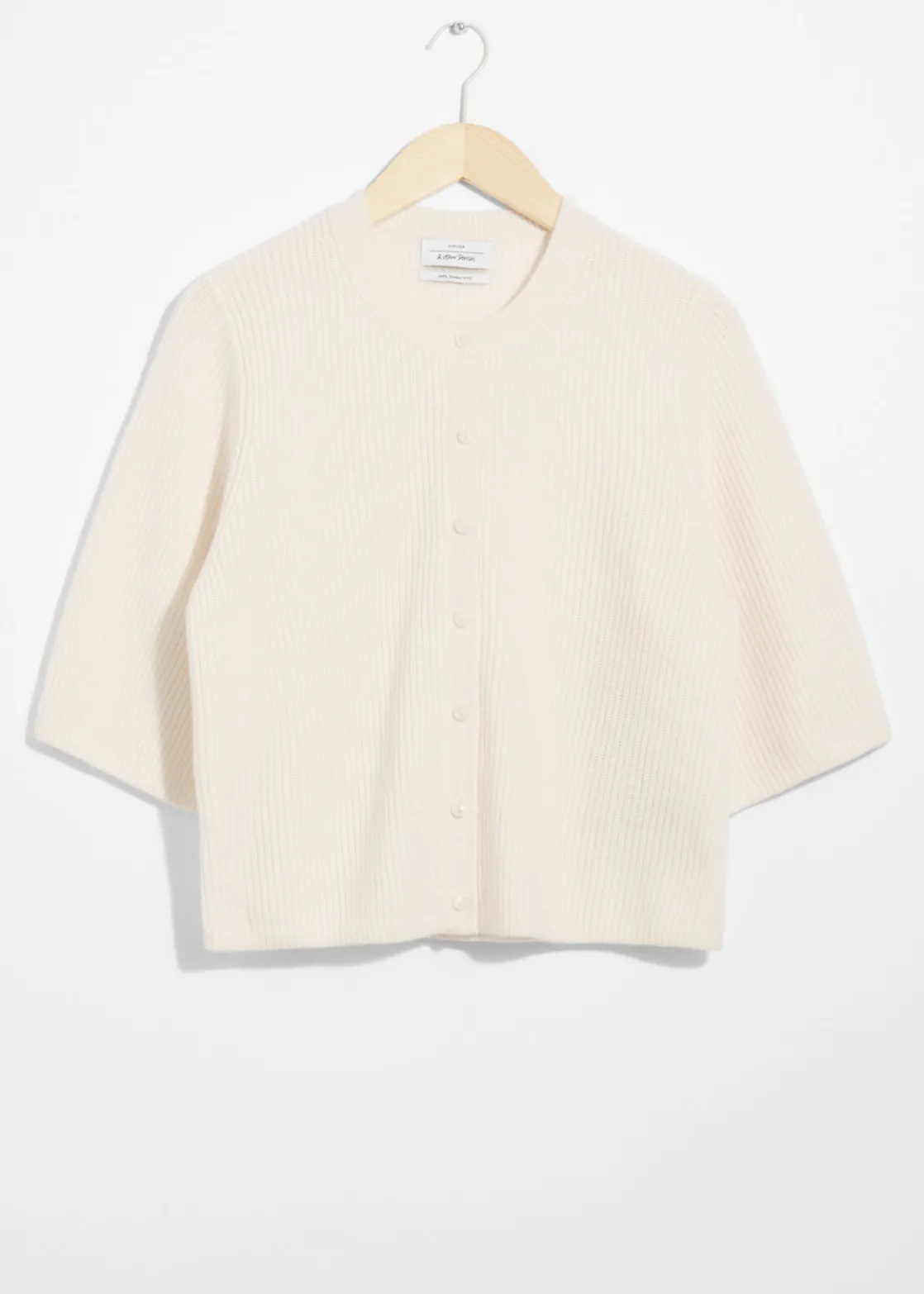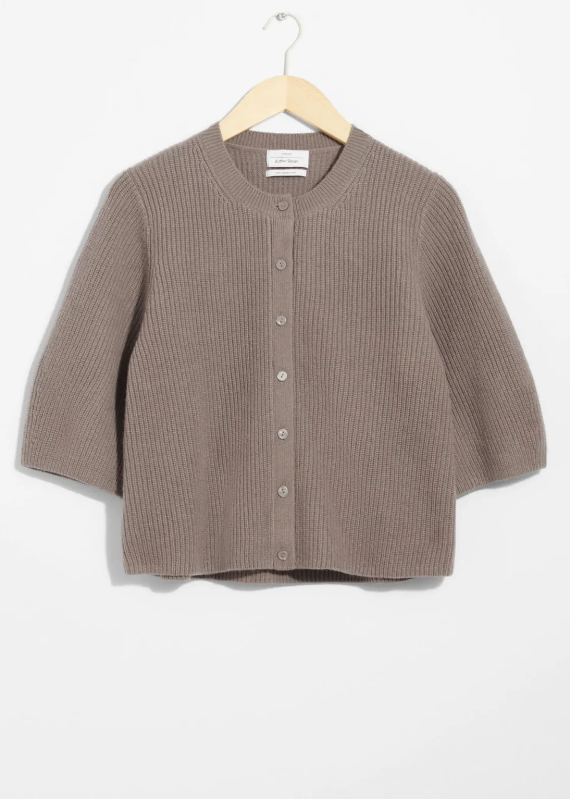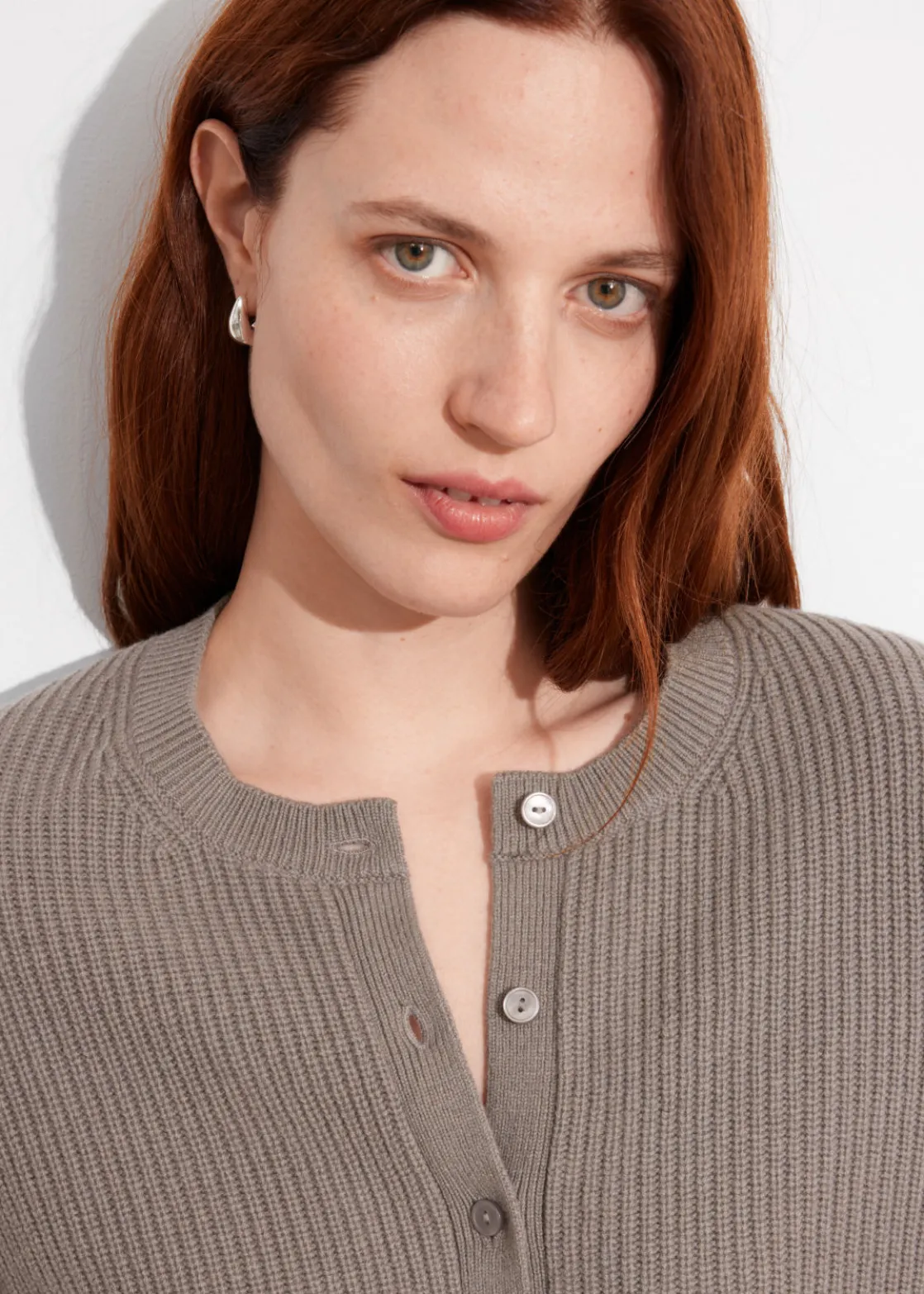 Ribbed cardigan knitted from merino wool featuring three-quarter sleeves.