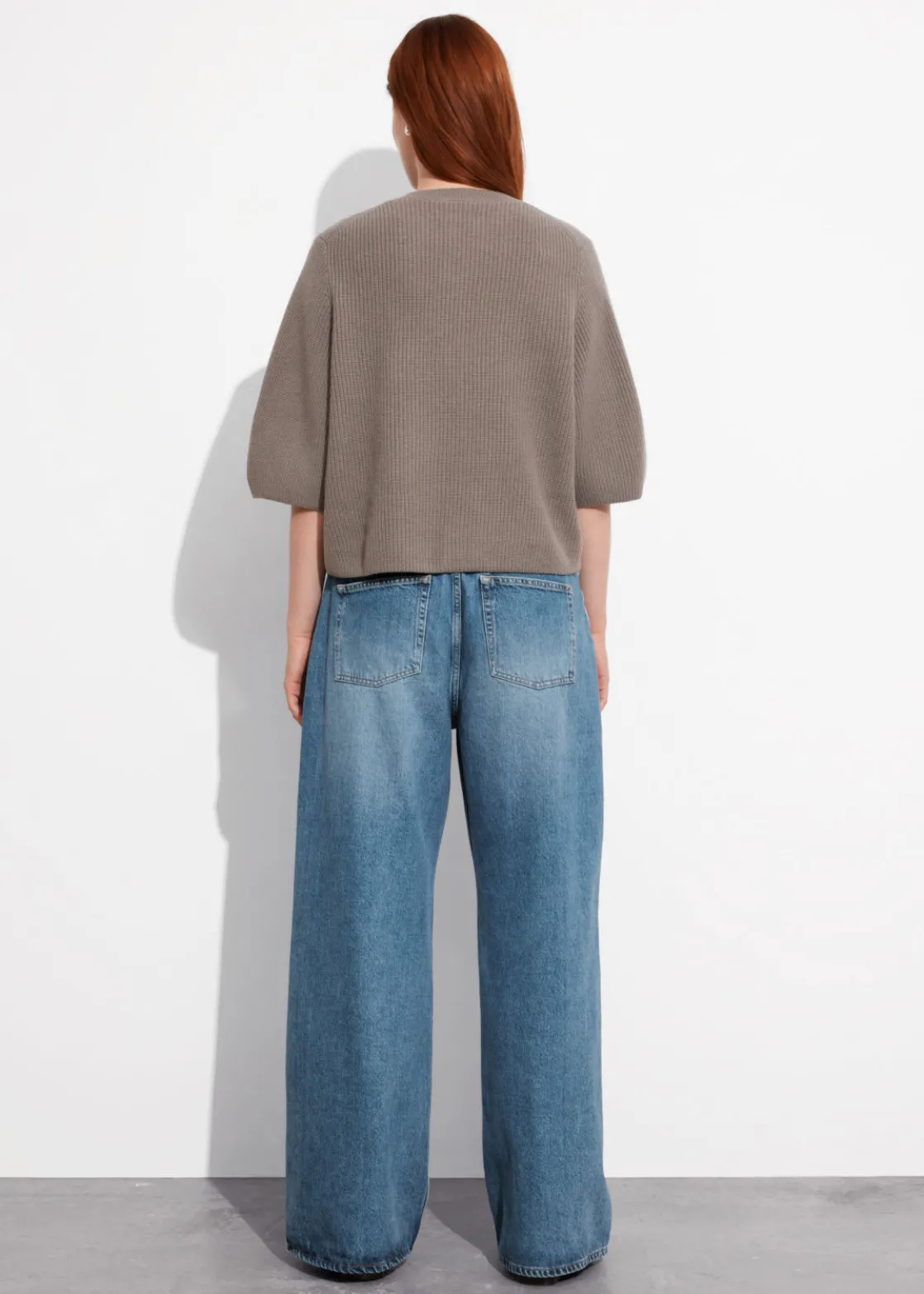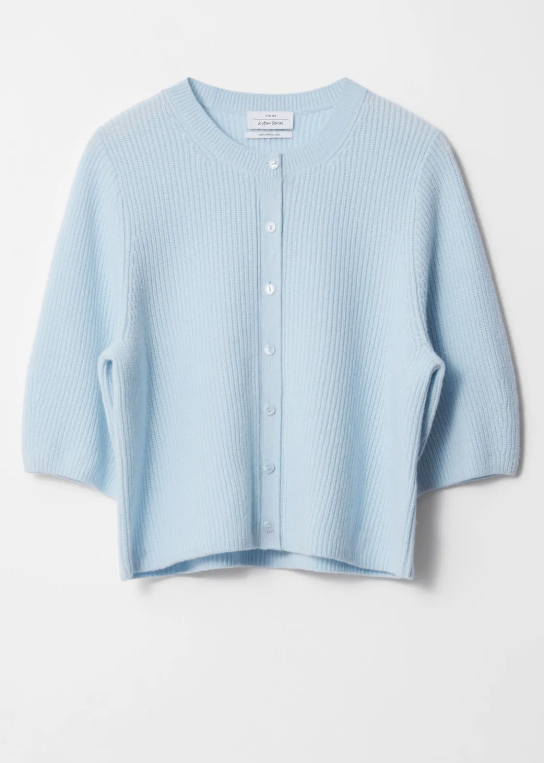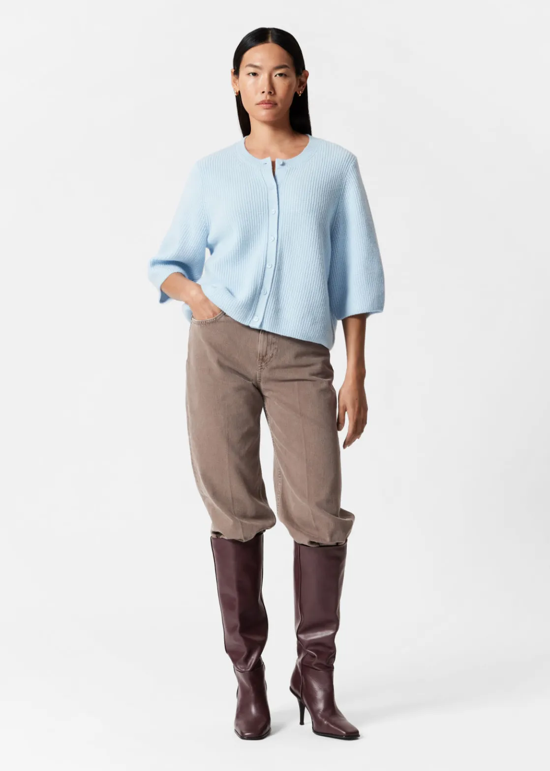 Ribbed cardigan knitted from merino wool featuring three-quarter sleeves.