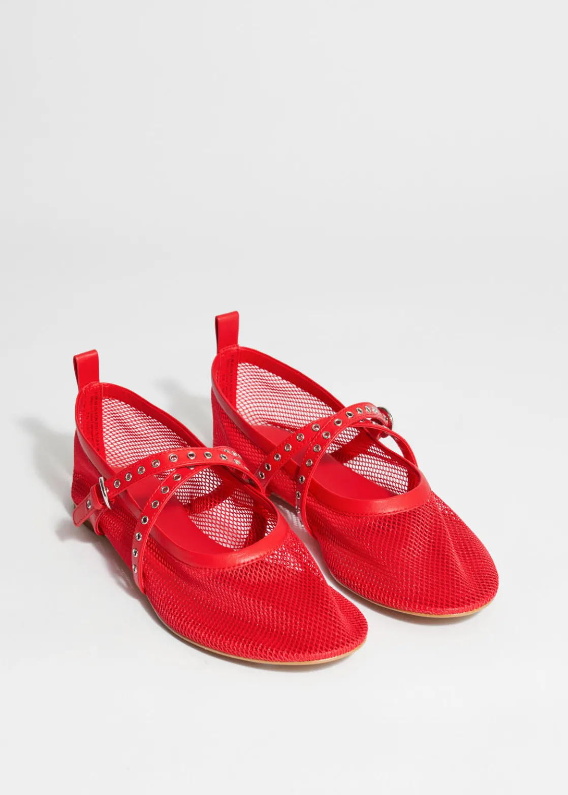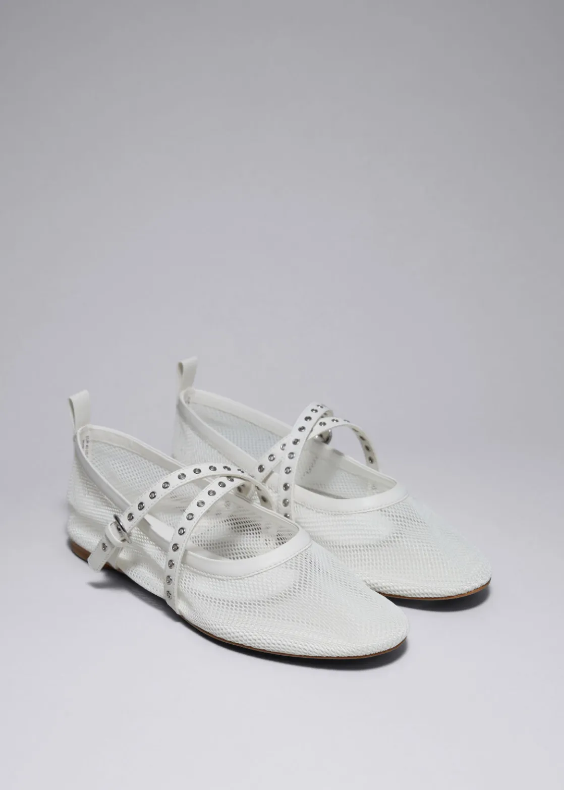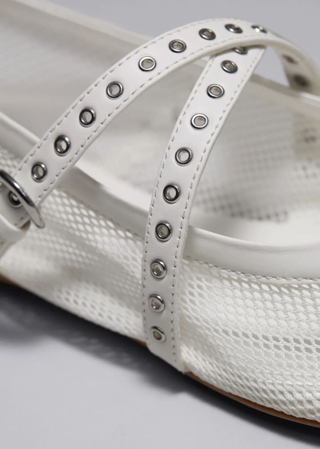 Ballet flats crafted from fishnet mesh with leather trims, featuring foot-framing adjustable straps that intersect at the vamp. Finished with silver-toned eyelets and buckles.