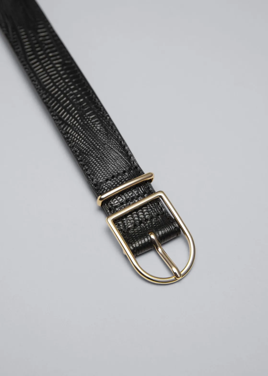 Classic belt crafted from leather featuring a mid-waist fit. Finished with a slender gold-toned D-buckle for adjustable style.
