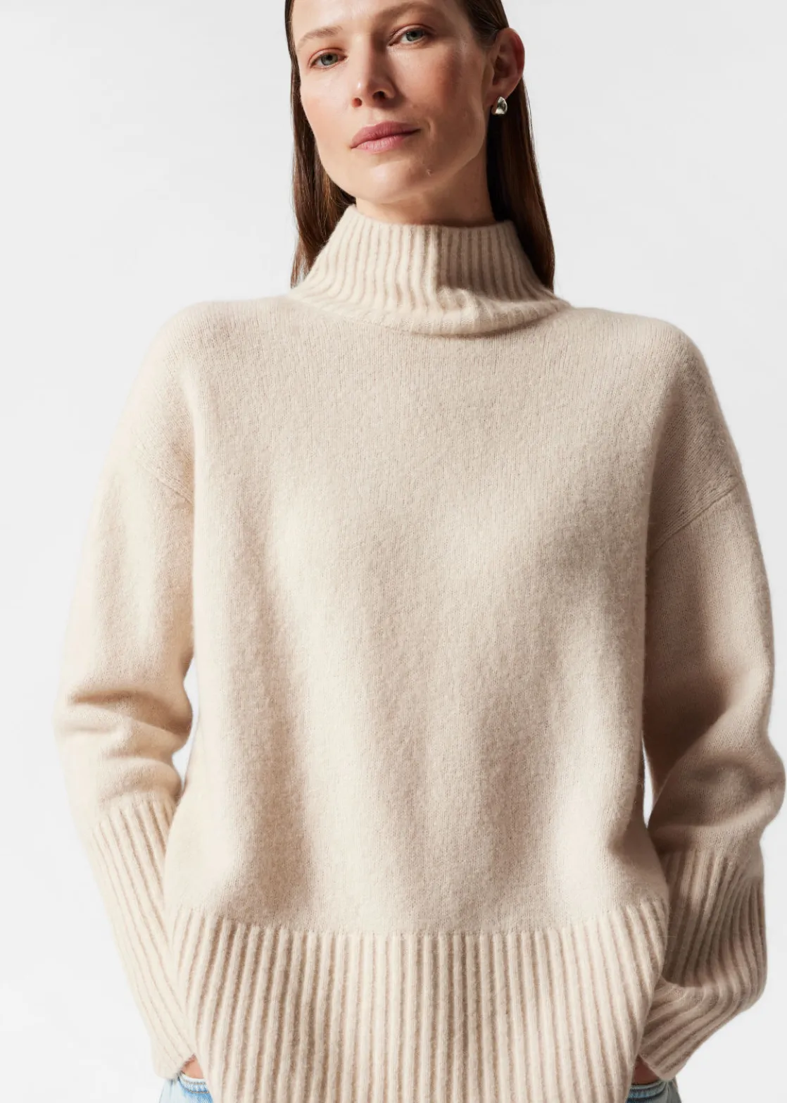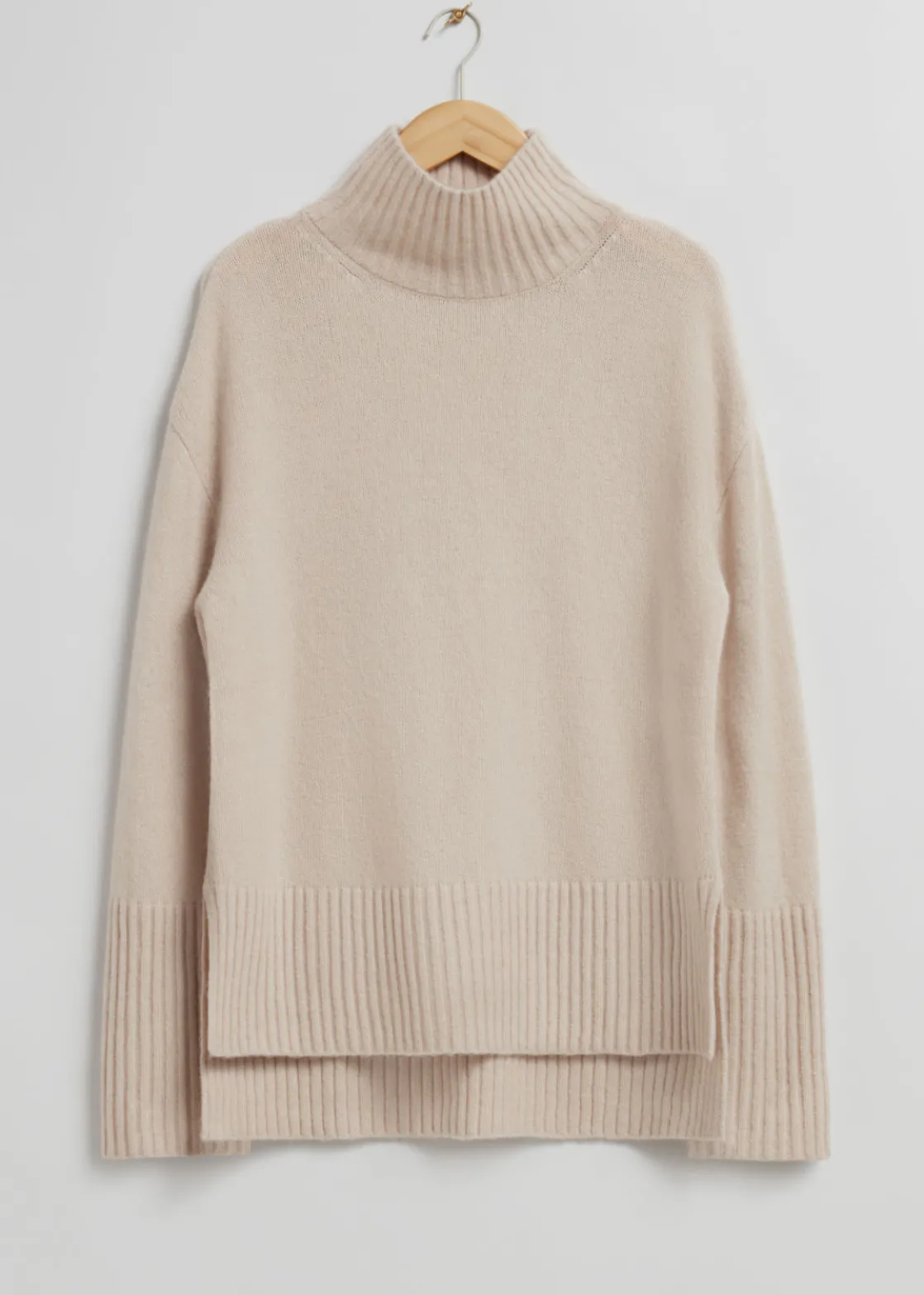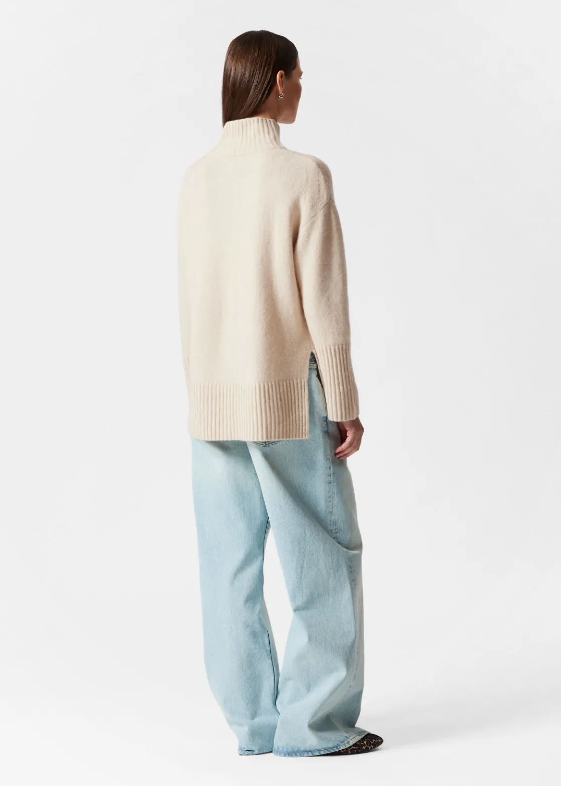 Oversized mock neck knit sweater finished with side slits and a slightly shorter front.