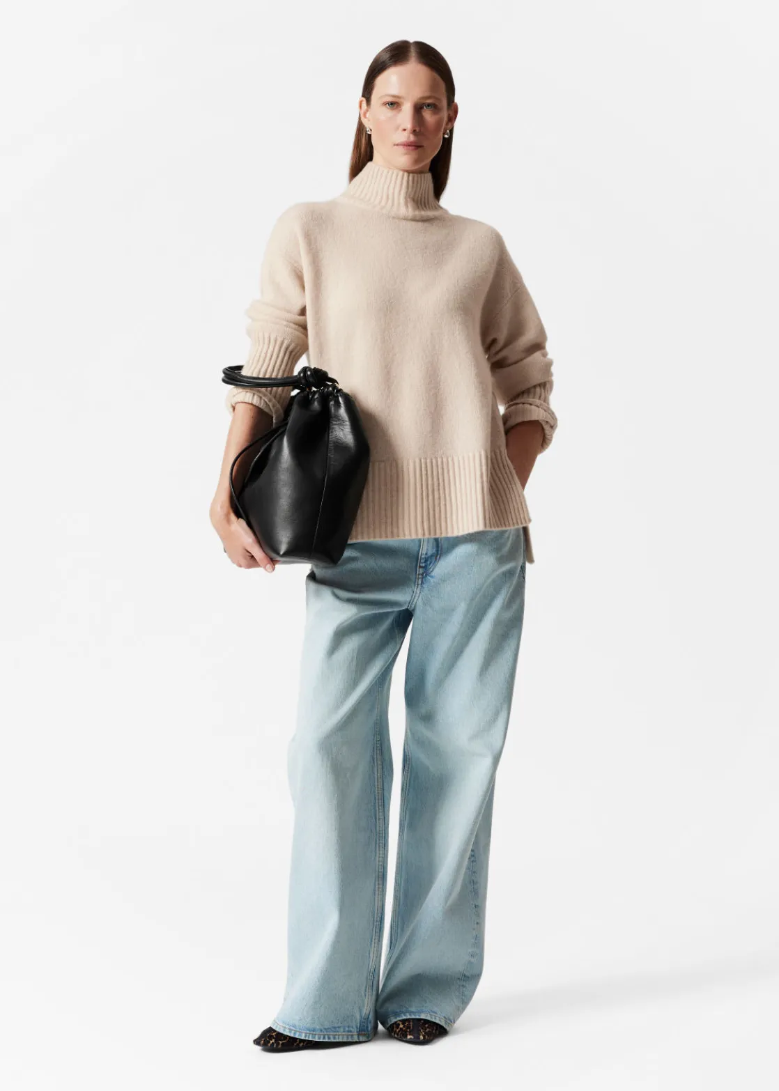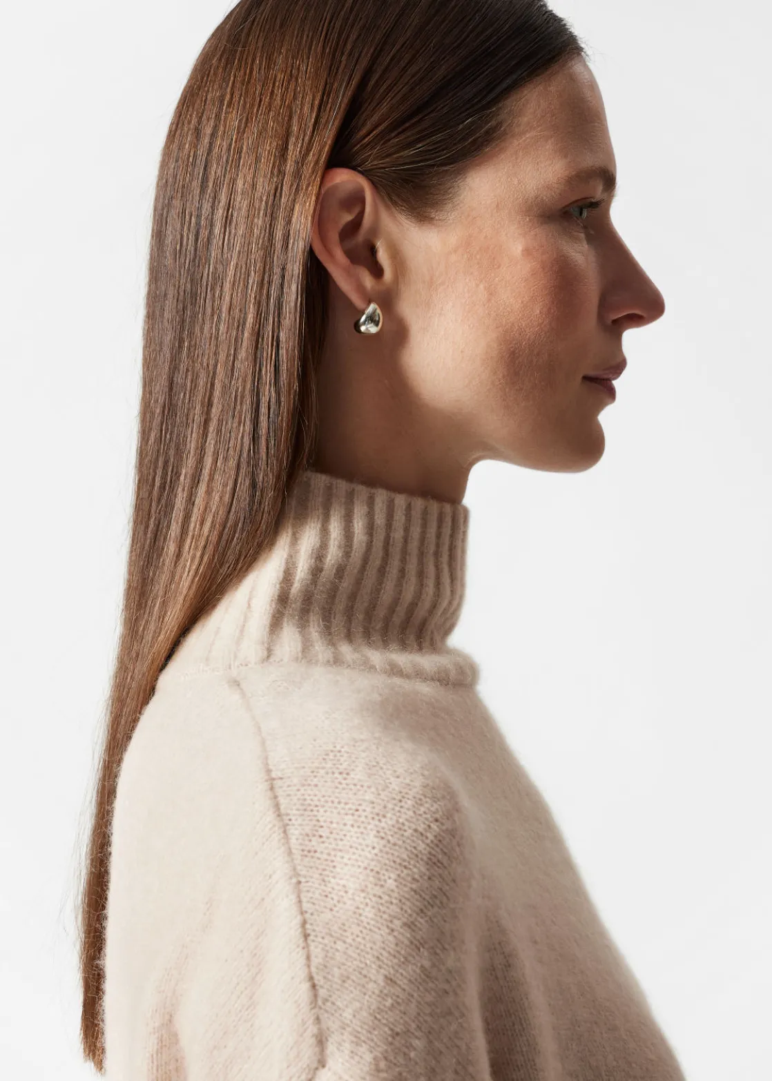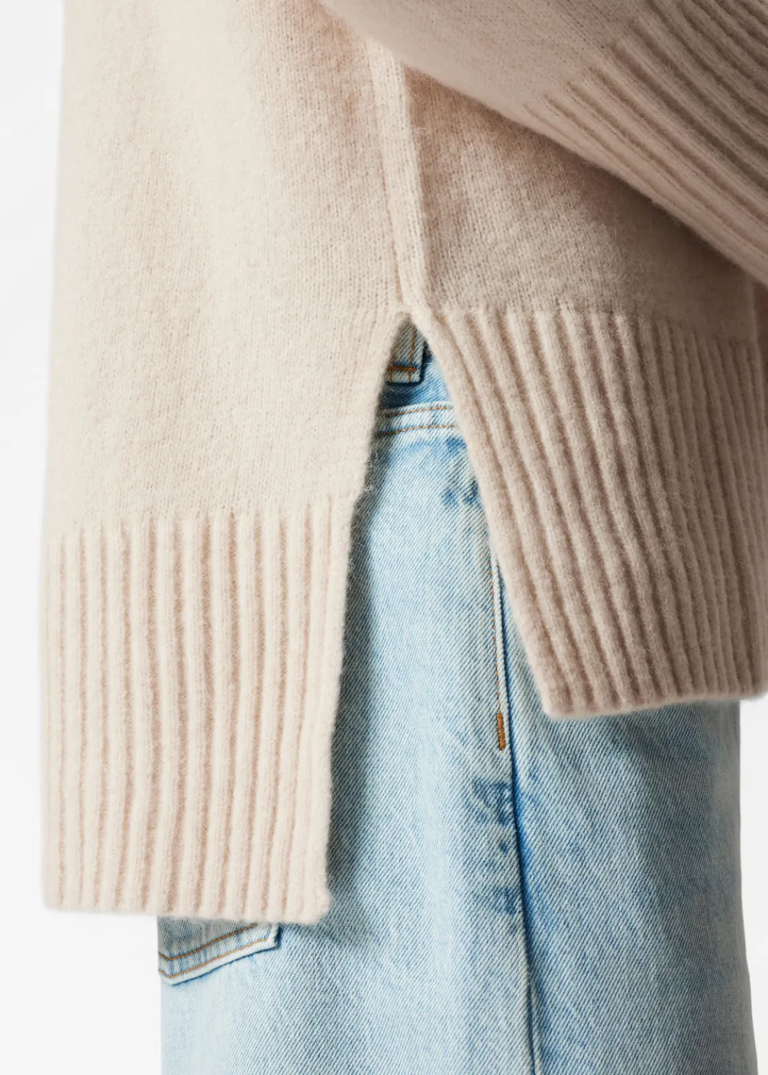 Oversized mock neck knit sweater finished with side slits and a slightly shorter front.