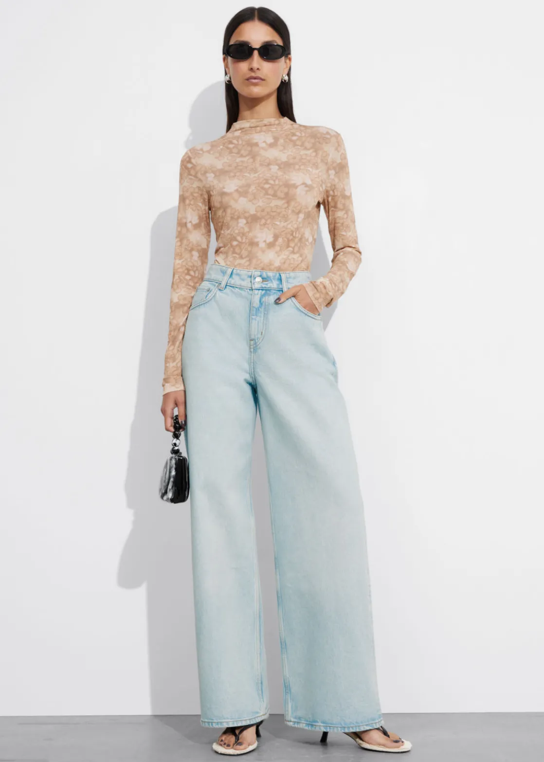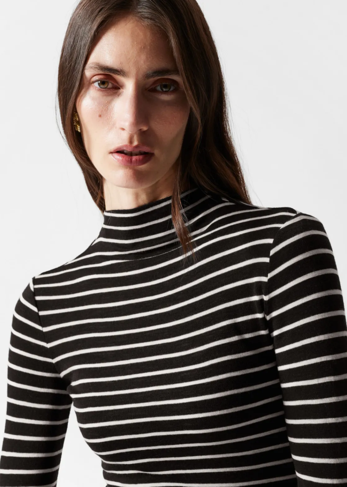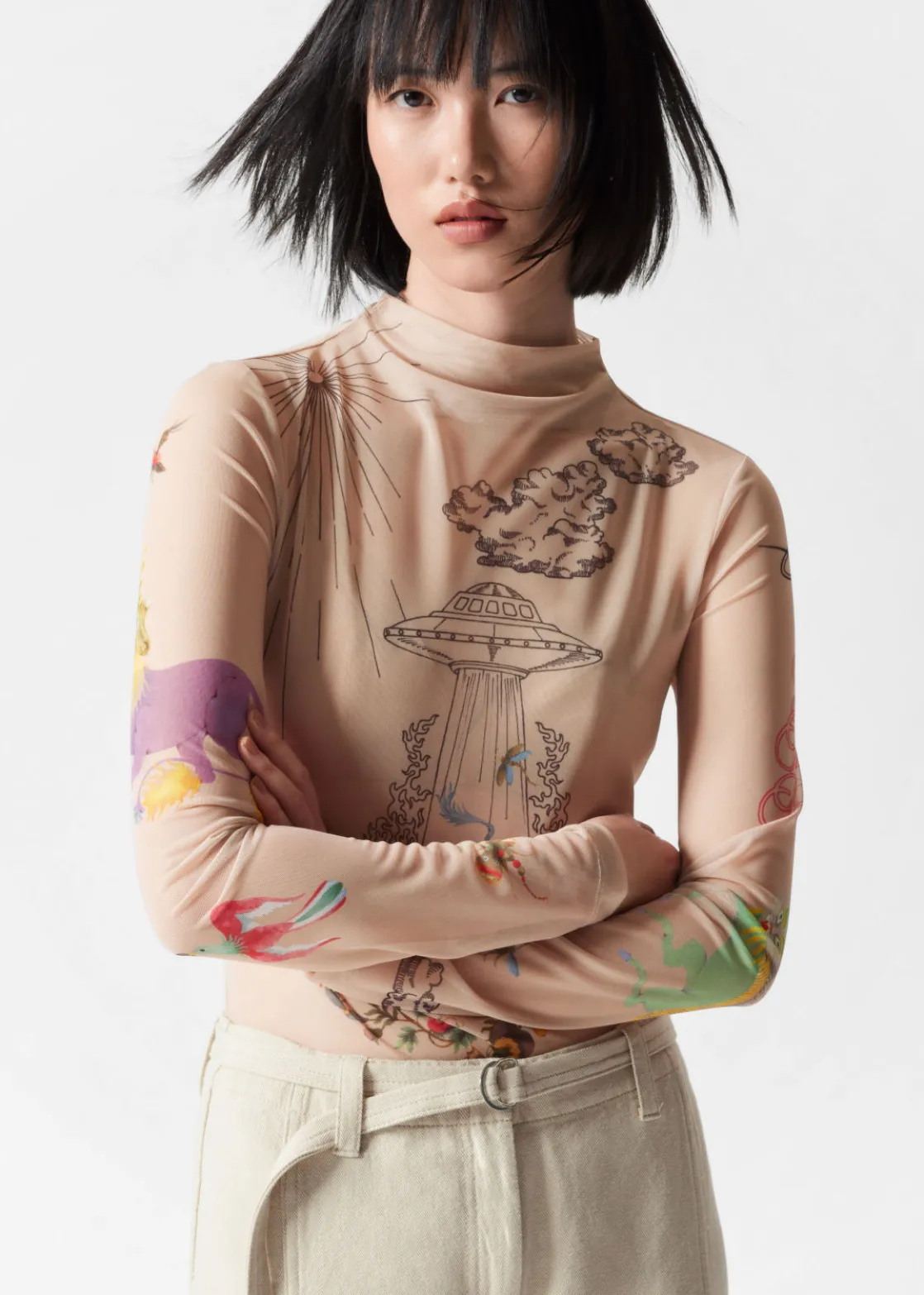 Printed long-sleeve mock-neck top finished with a slim silhouette.
