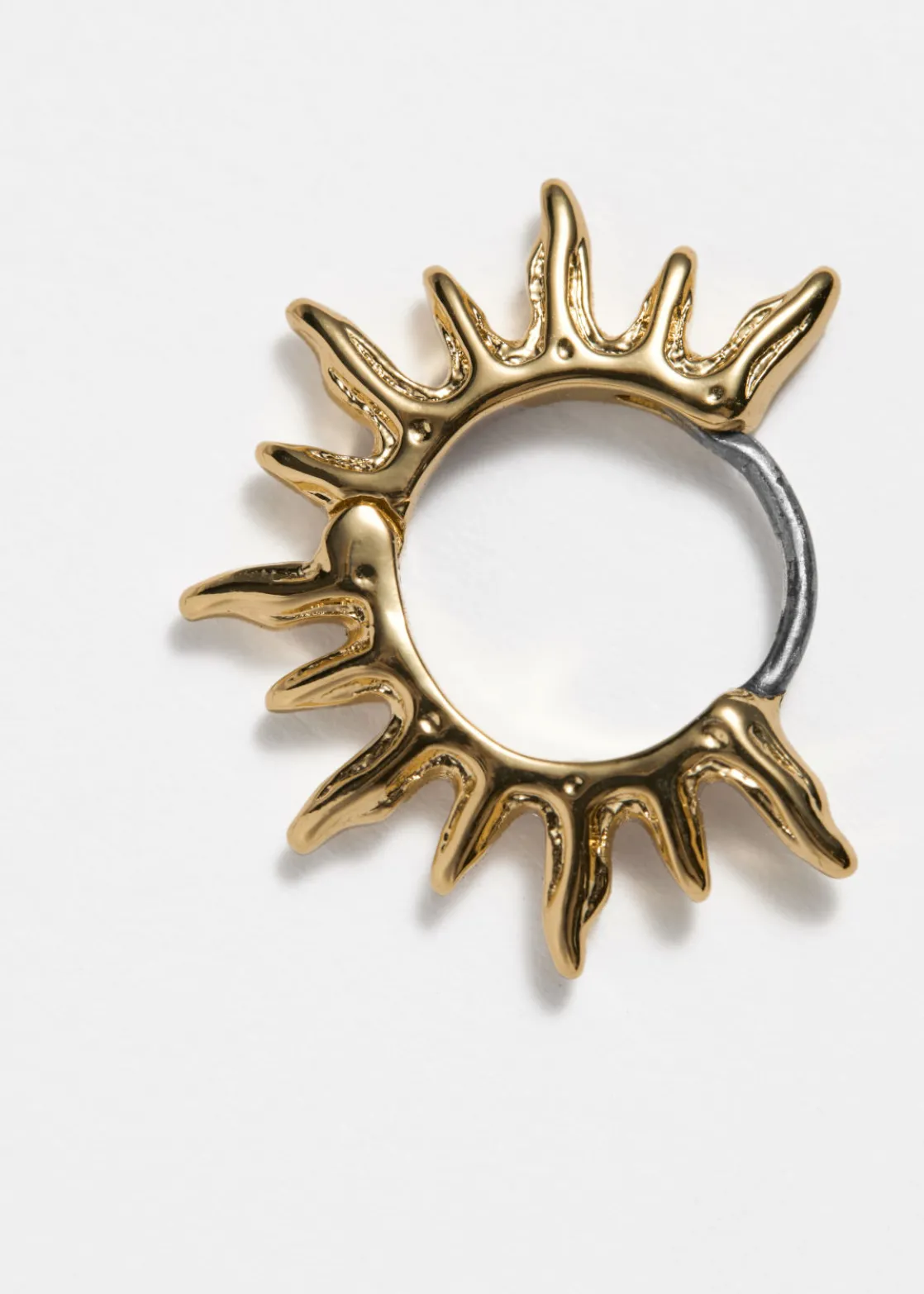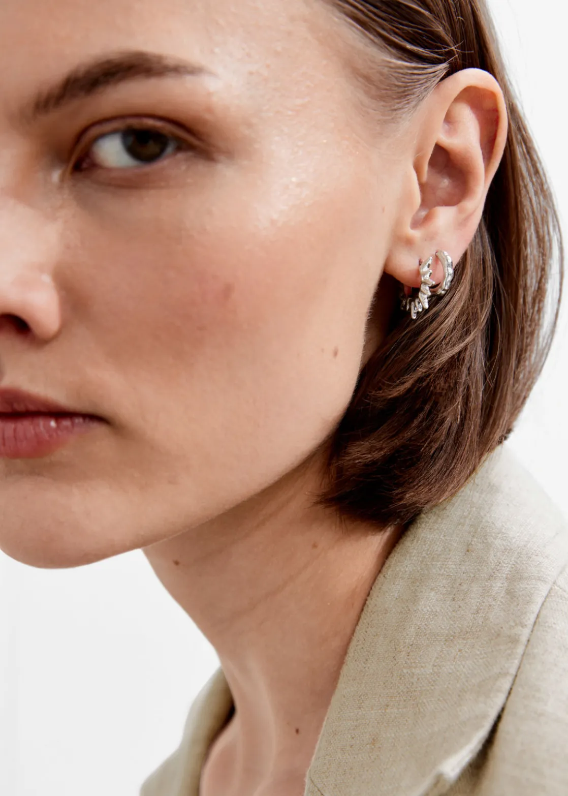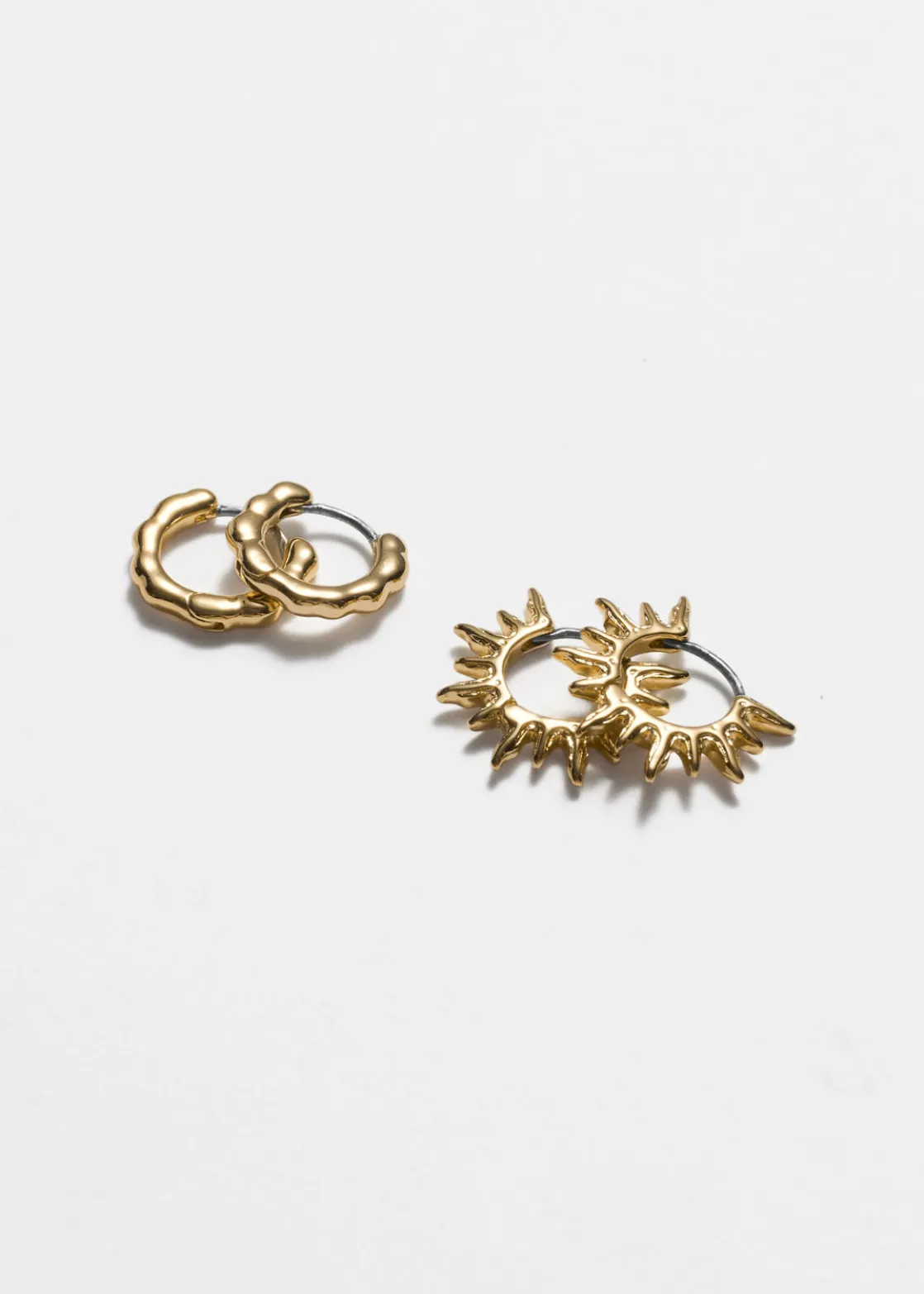Easily create a coordinated stack with these hoop earrings, which includes one pair of spiky and one pair of hammared hoops that perfectly complement each other. Cast from high-shine plated brass.