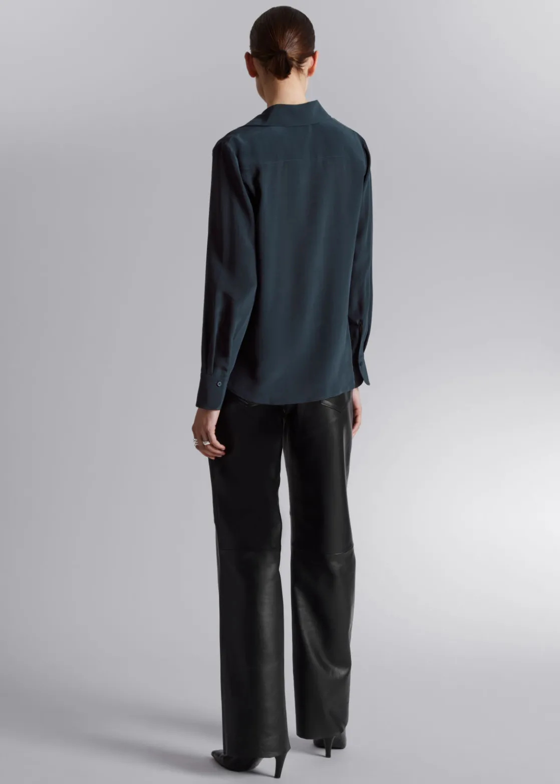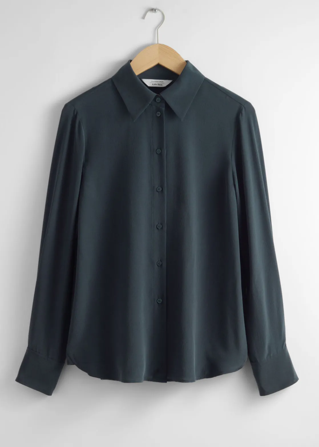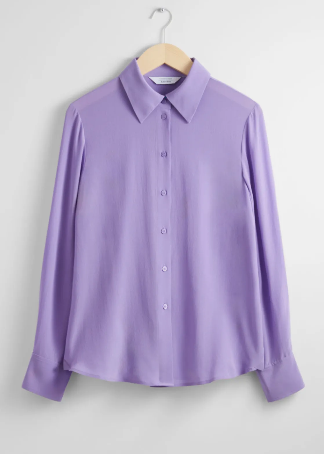 Mulberry silk shirt designed with a classic turn-down collar, long sleeves and a buttoned front.