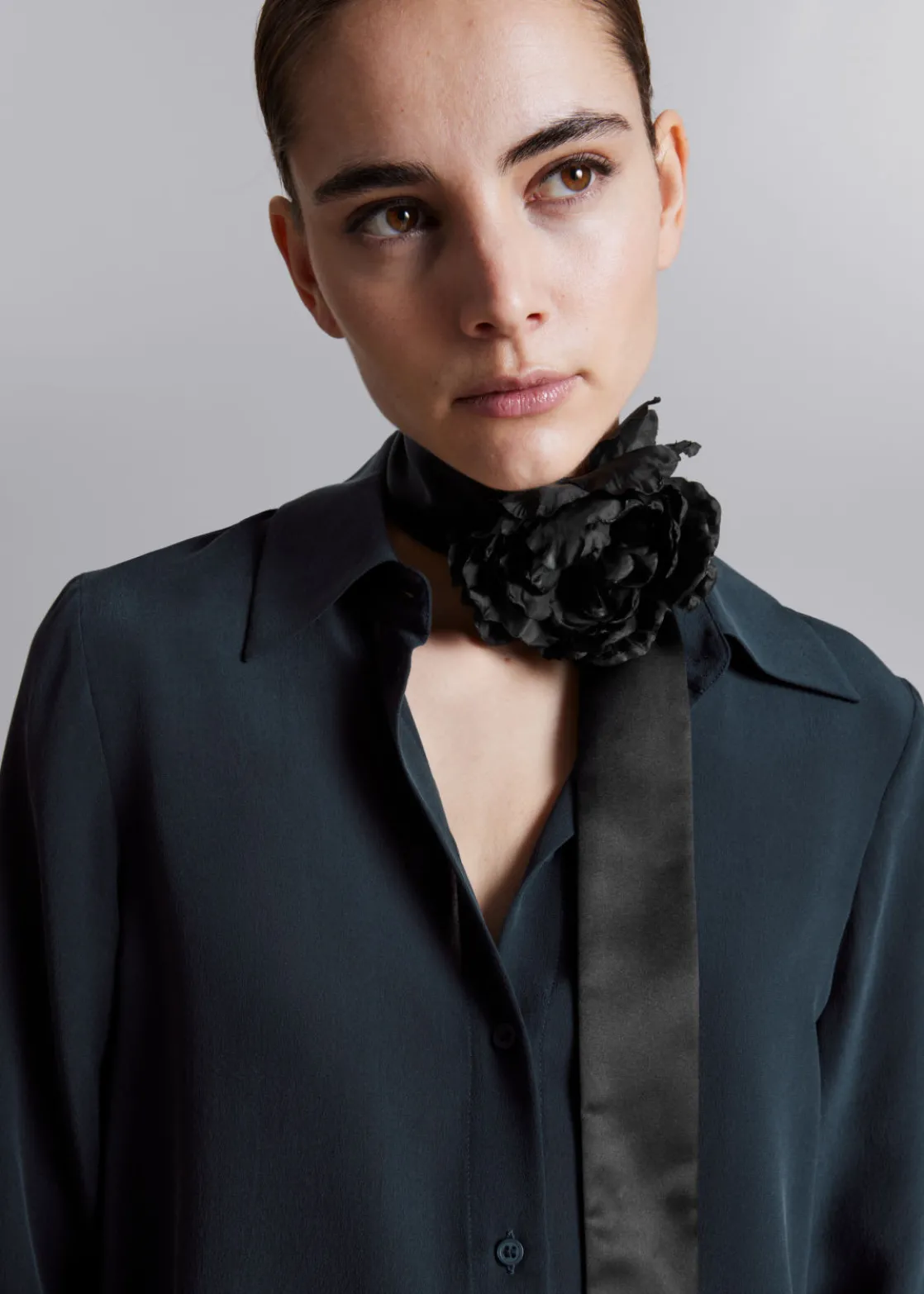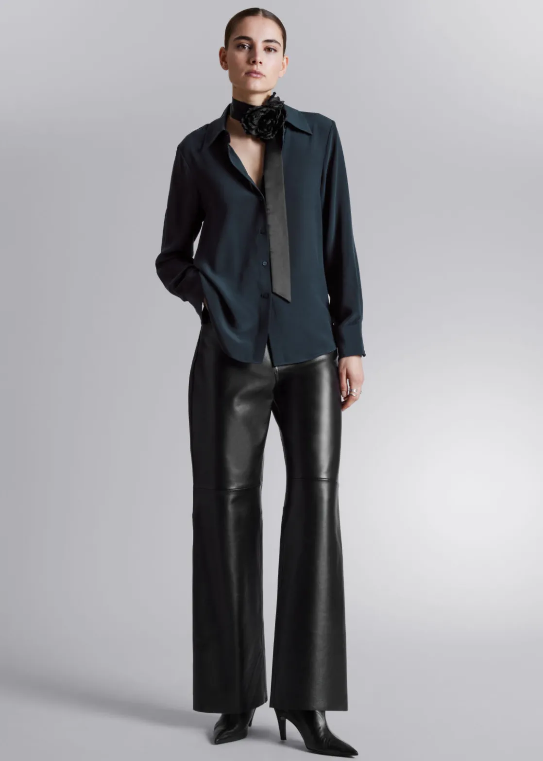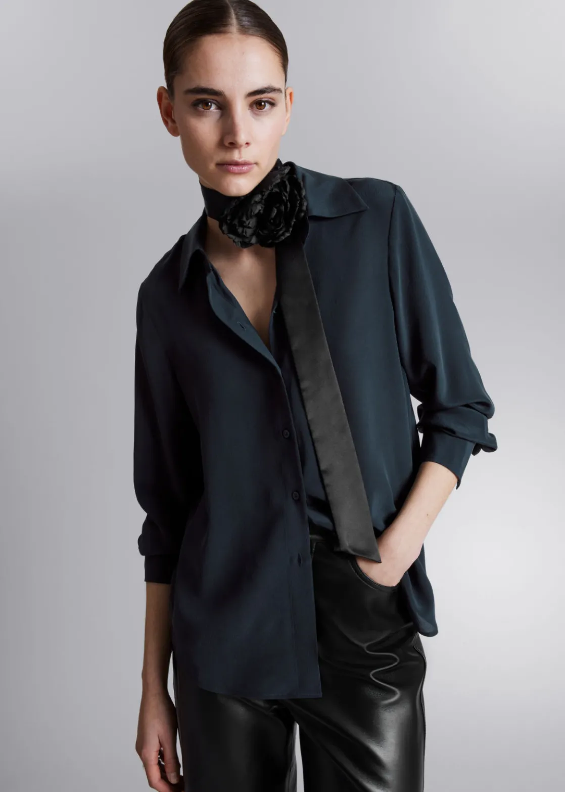 Mulberry silk shirt designed with a classic turn-down collar, long sleeves and a buttoned front.