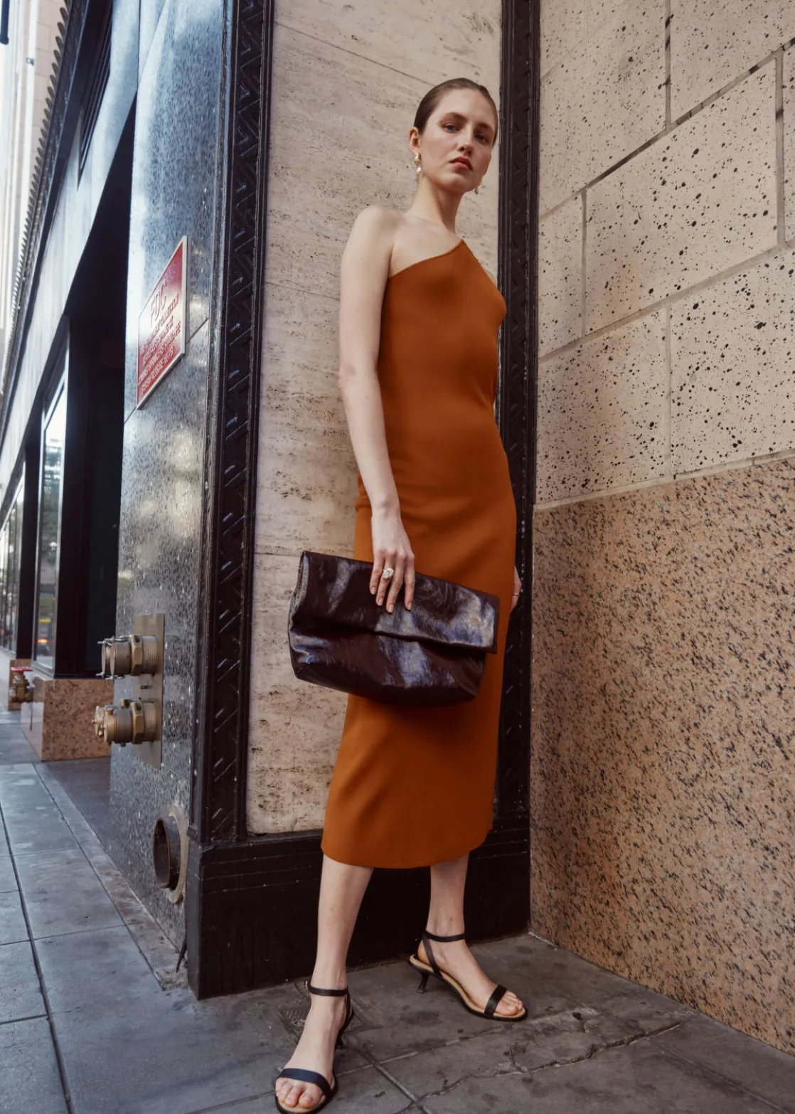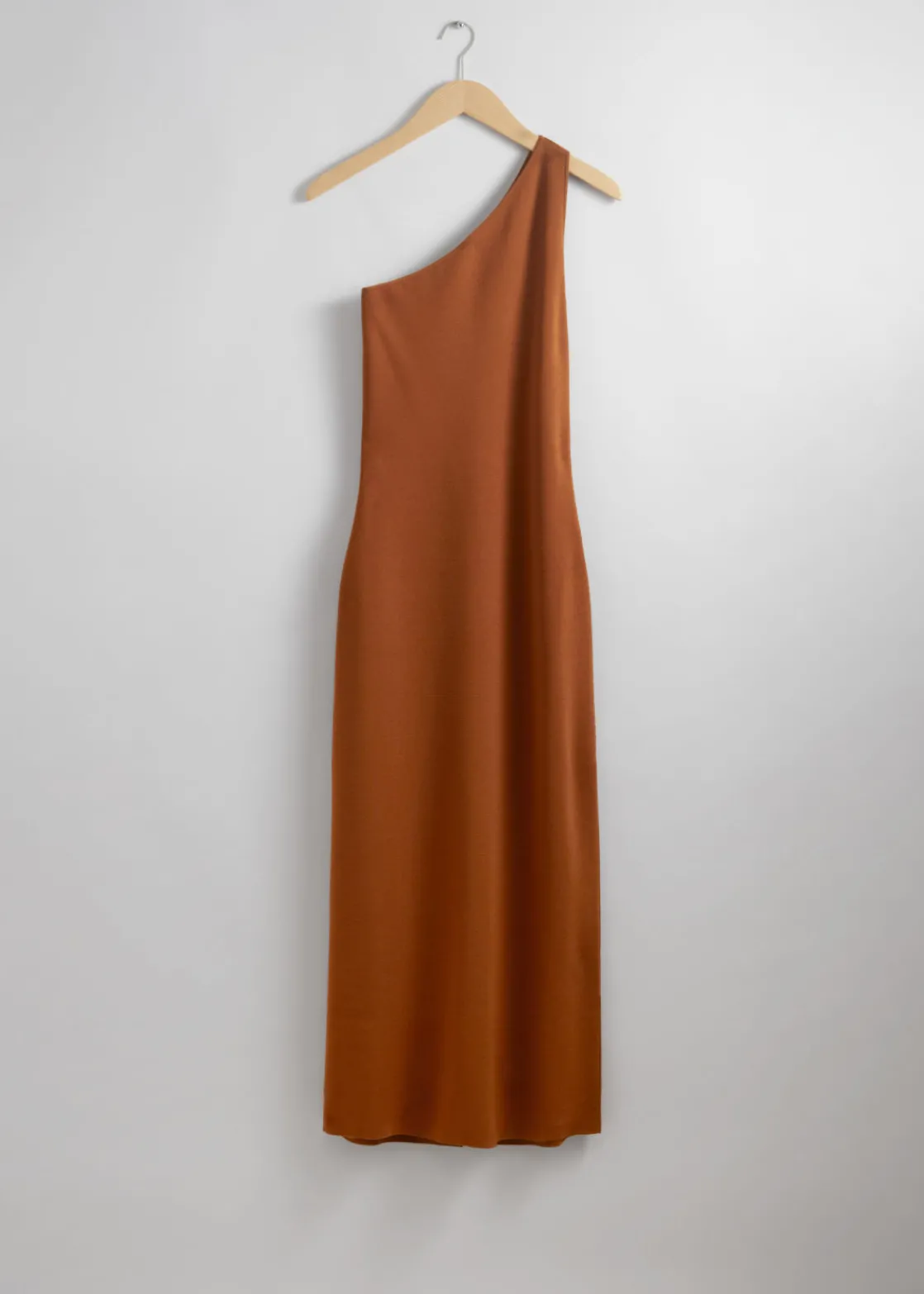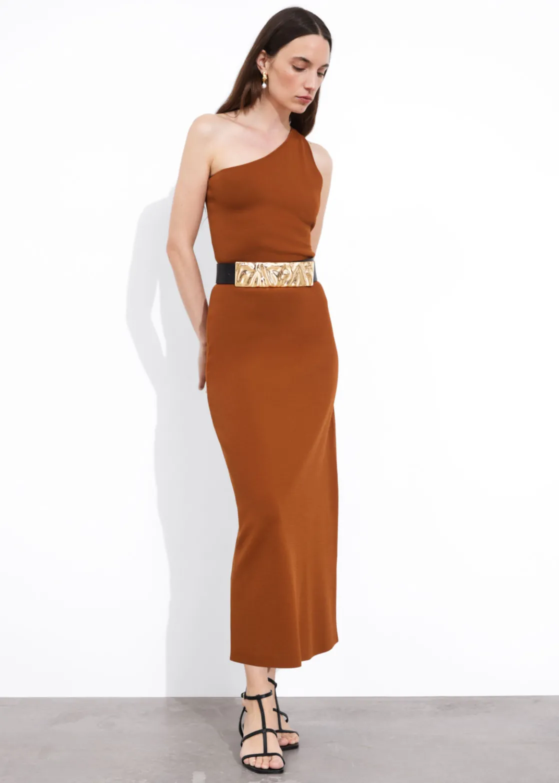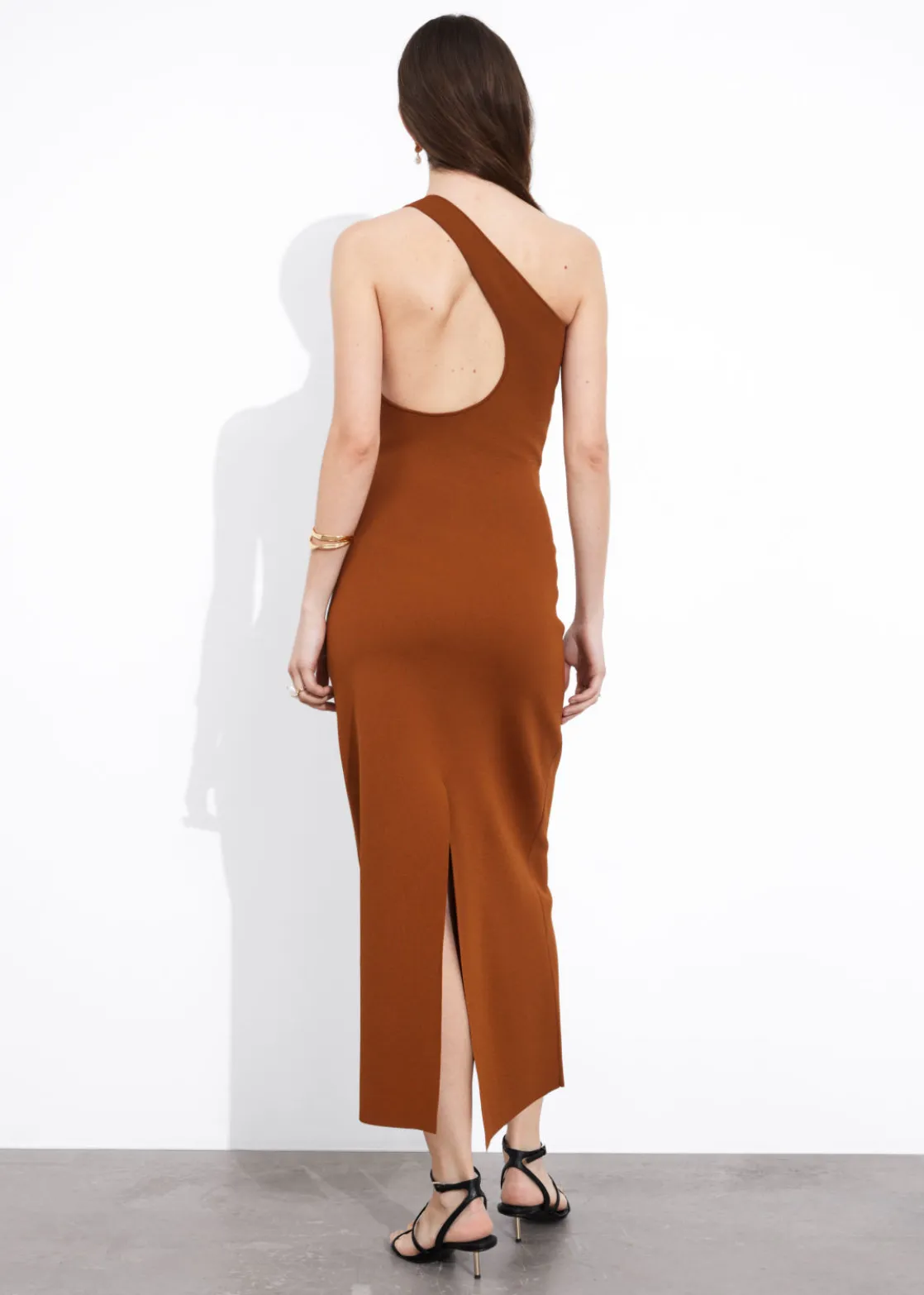 Sleeveless knit midi dress featuring a one-shoulder finish and a cut-out detail at the back.