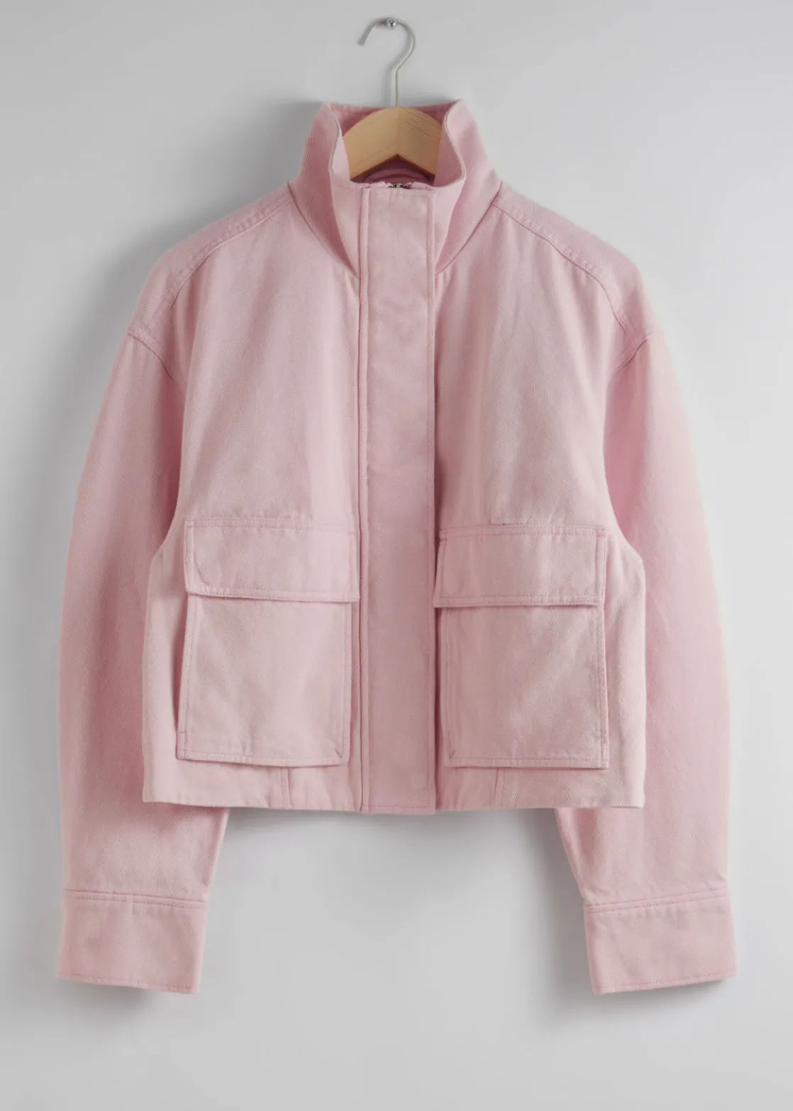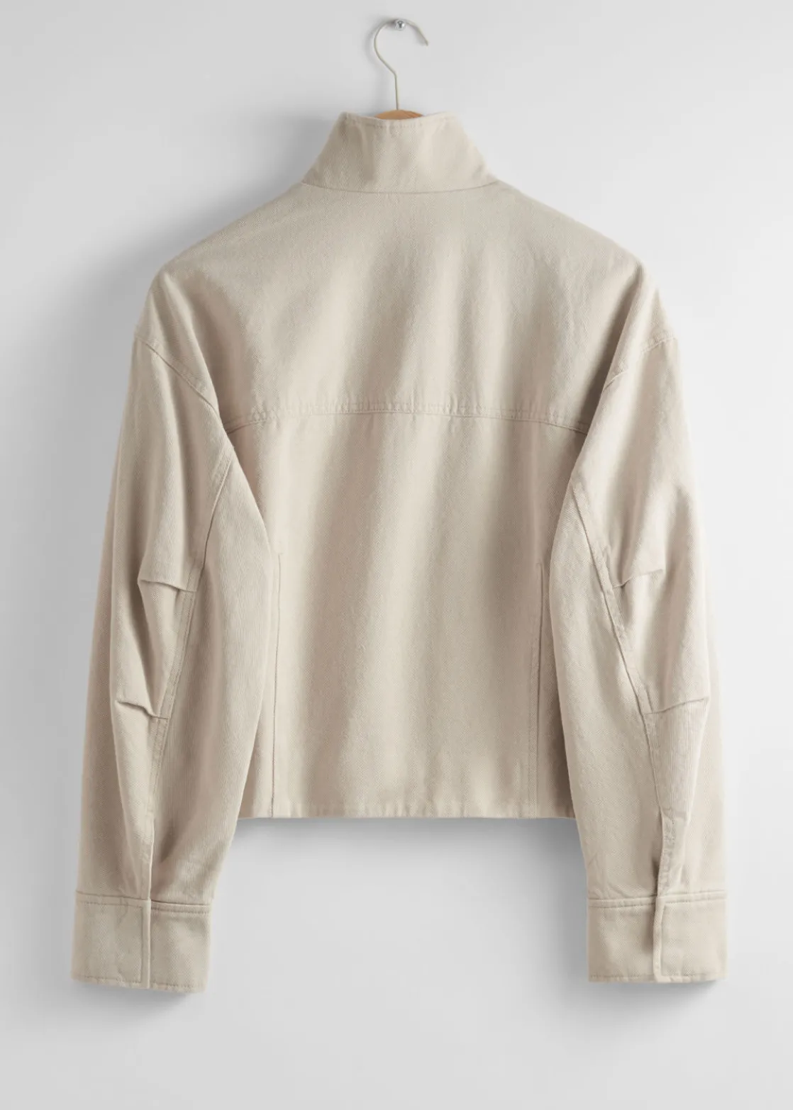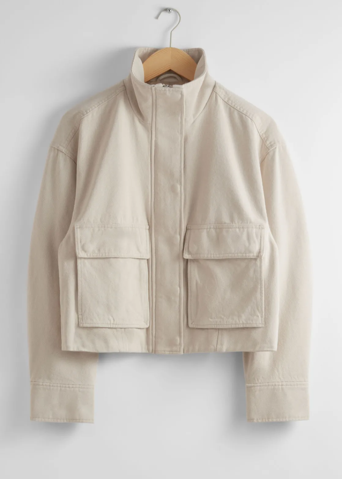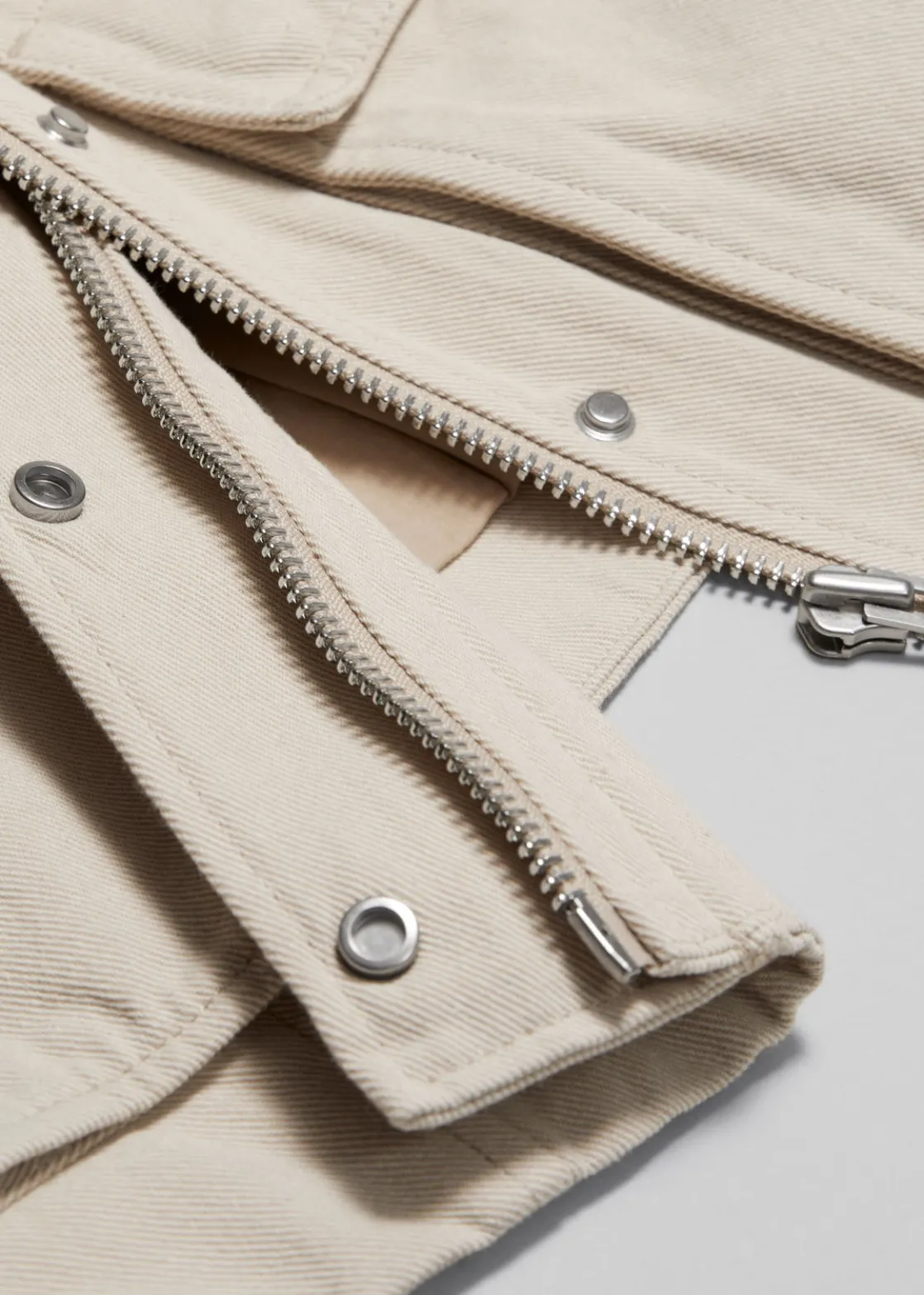 Boxy jacket with duo patch pockets, secured with a concealed zipper and press buttons.