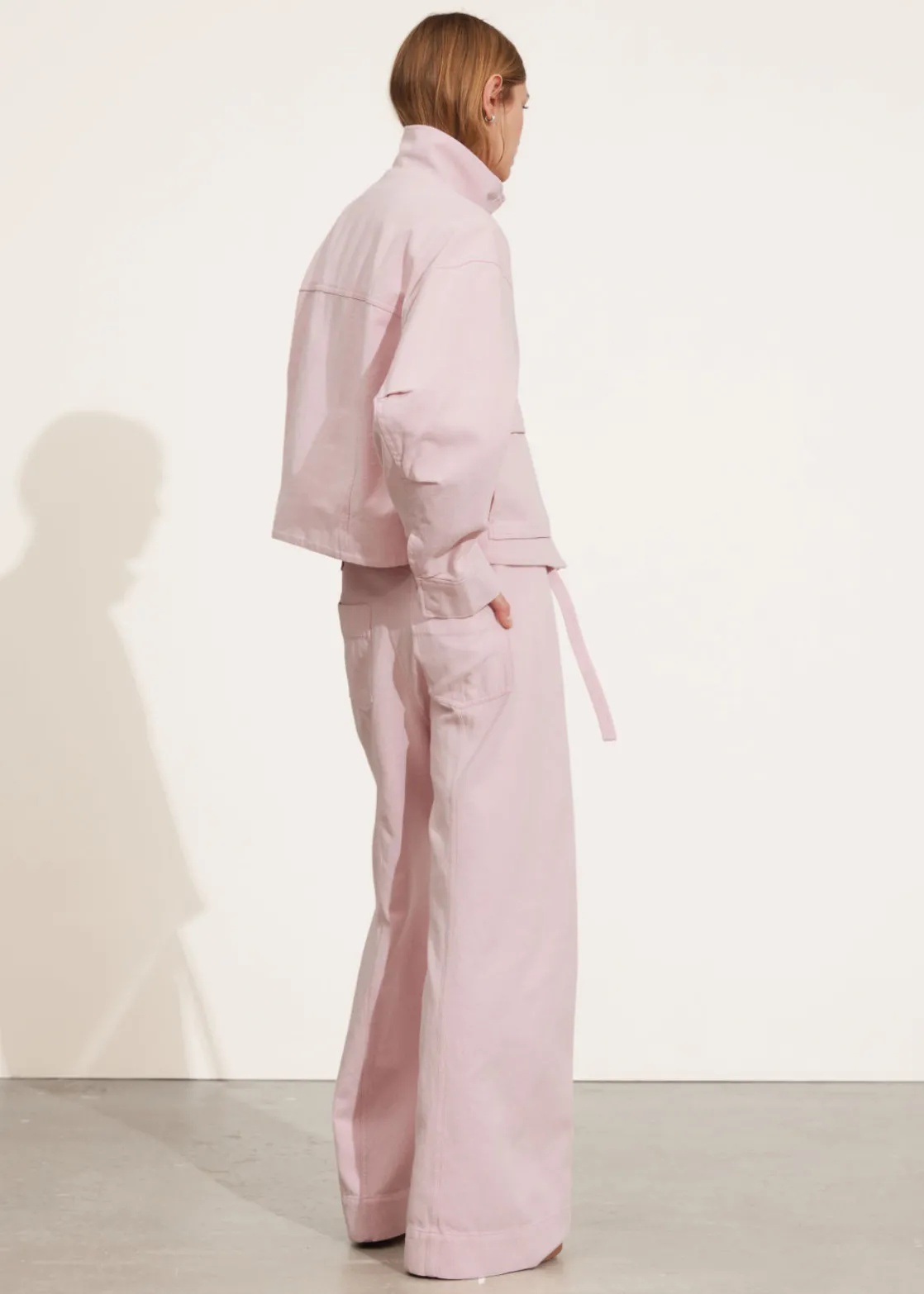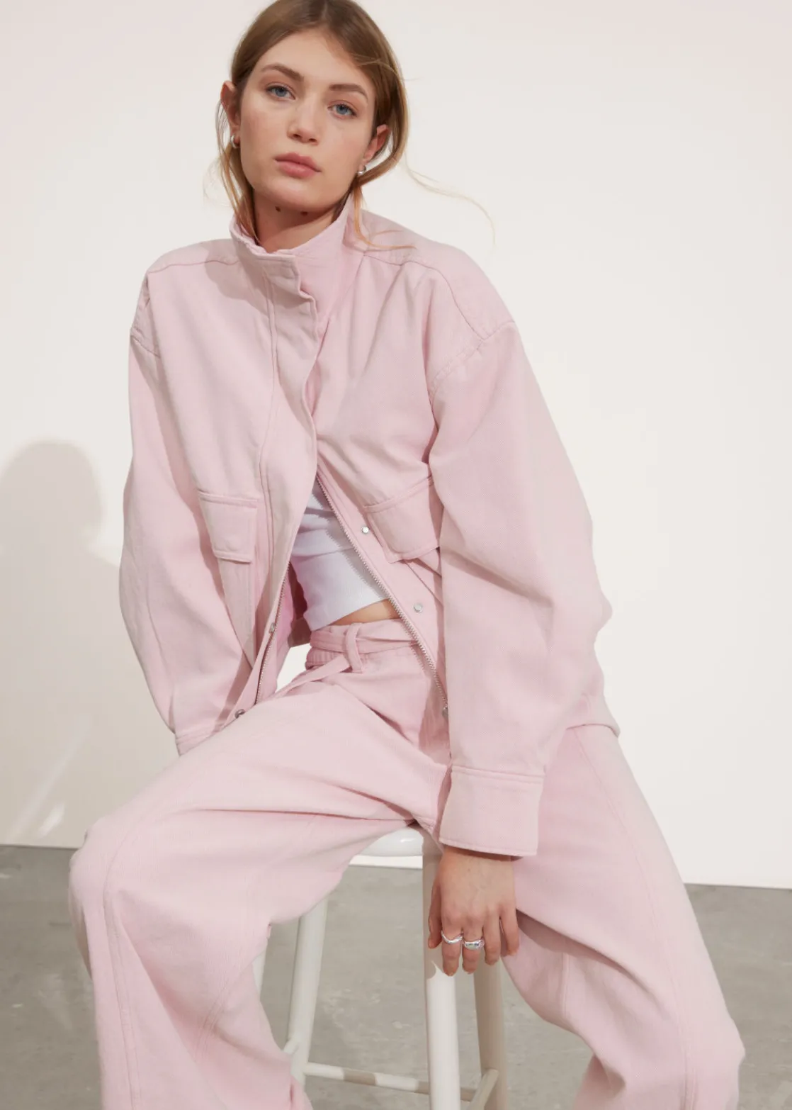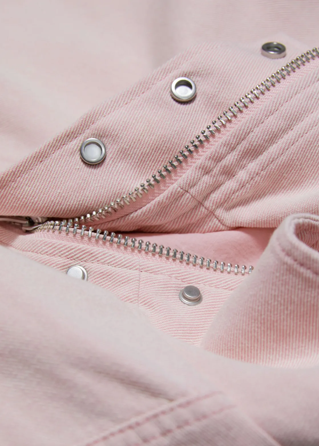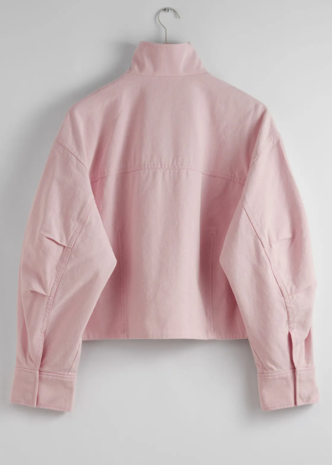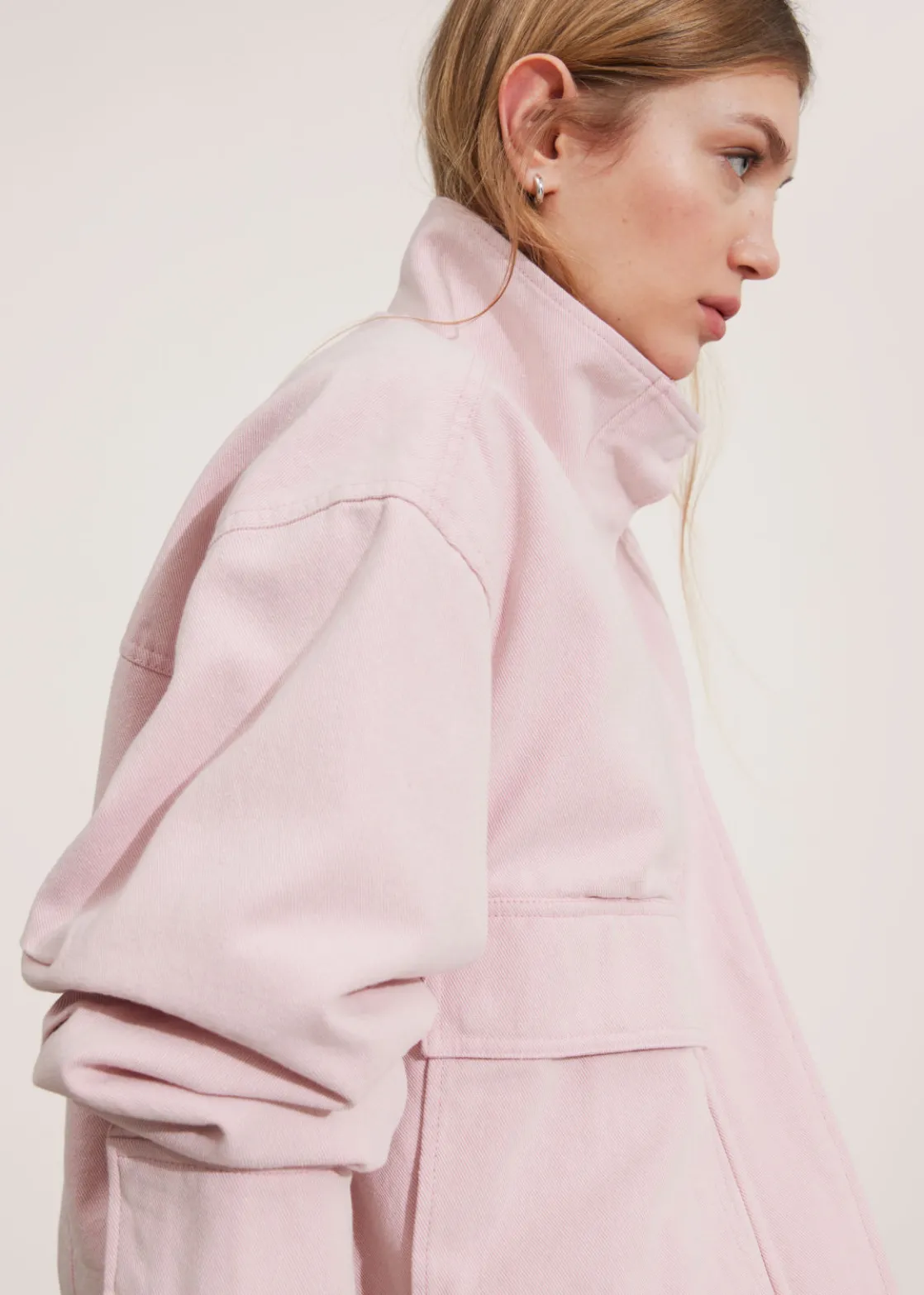 Boxy jacket with duo patch pockets, secured with a concealed zipper and press buttons.