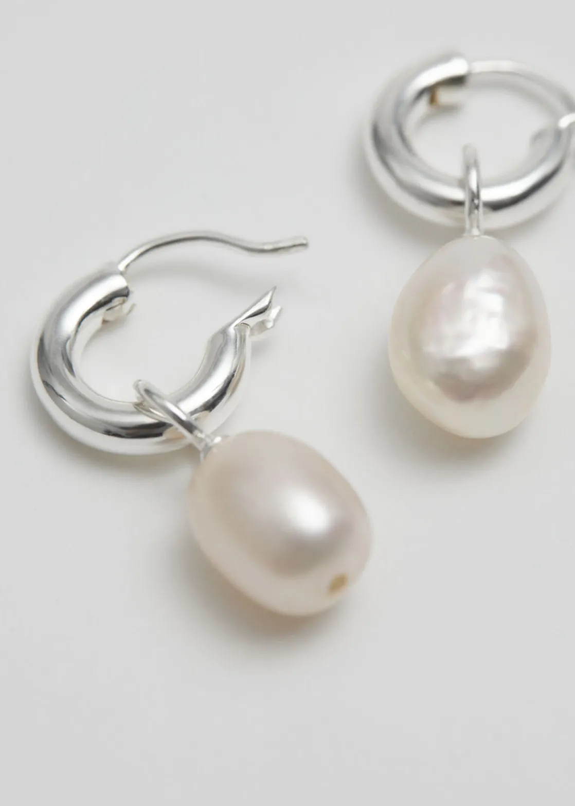 Sterling silver hoop earrings in a gold-toned finish, accented with dangling fresh water pearl pendants.
