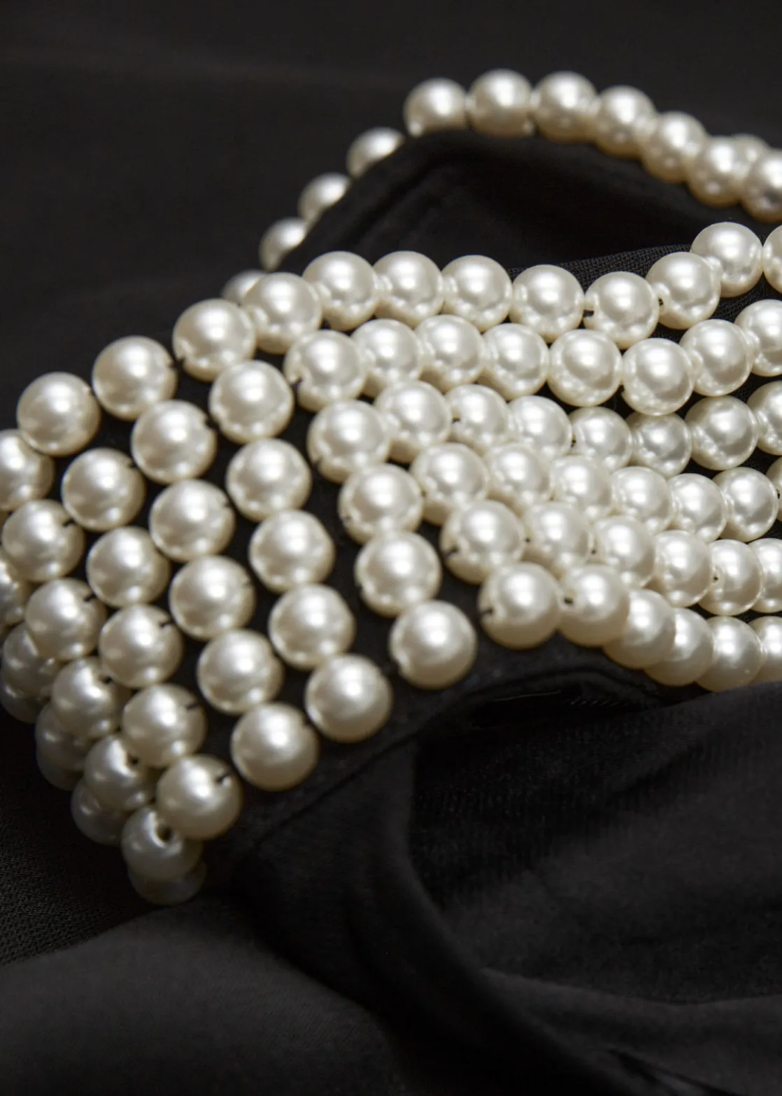 Sleeveless A-line mini dress featuring a pearl-embellished collar.