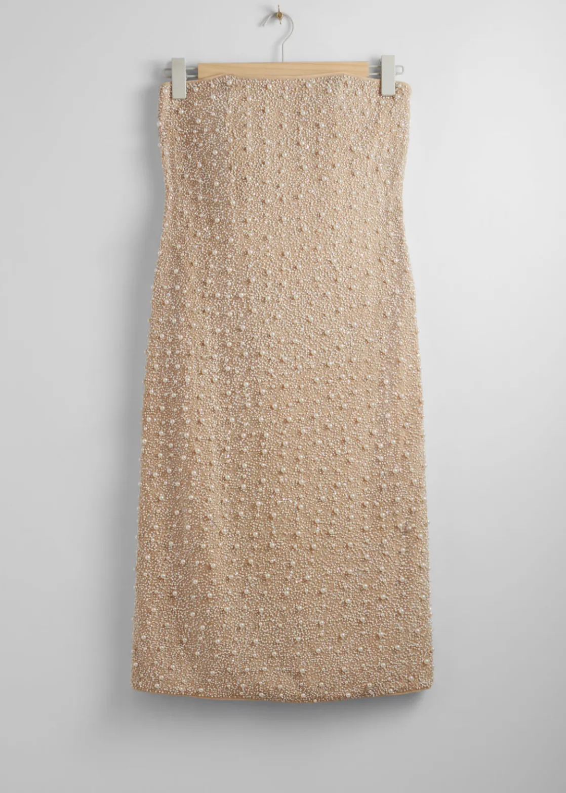 Tube midi dress with a faux pearl-embellished finish. Featuring a built-in corset bodice.