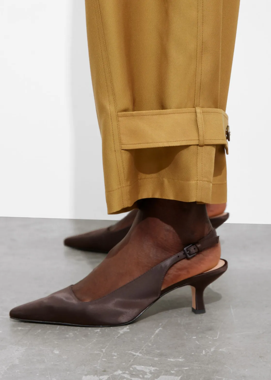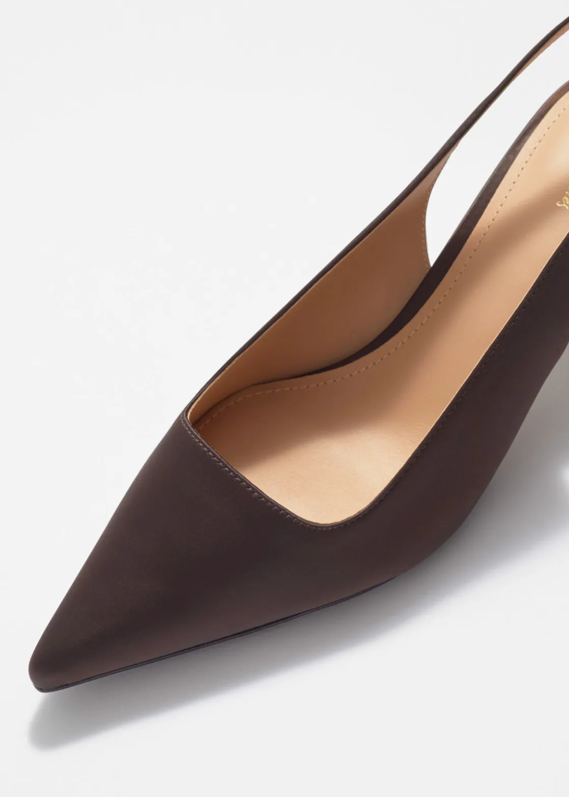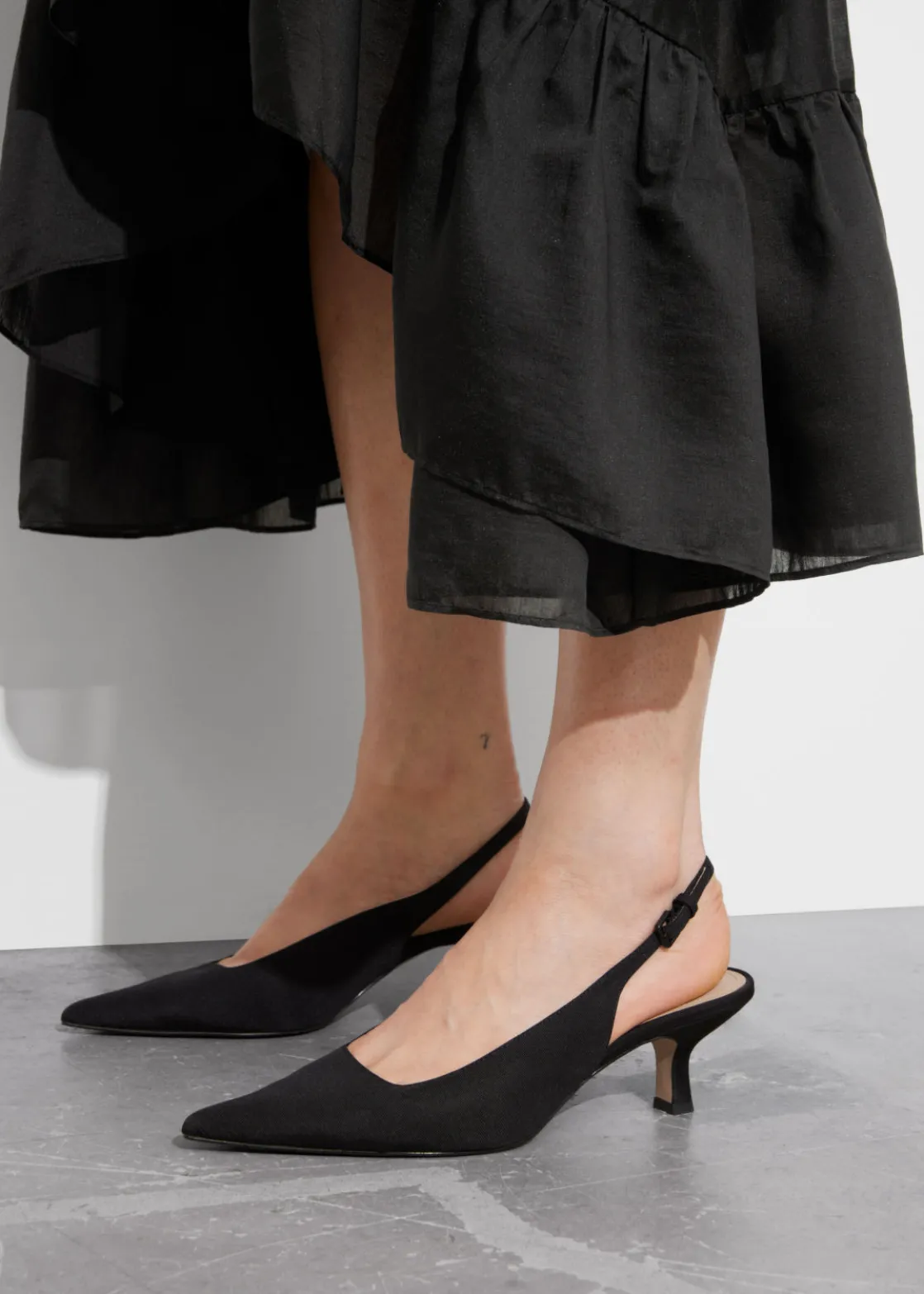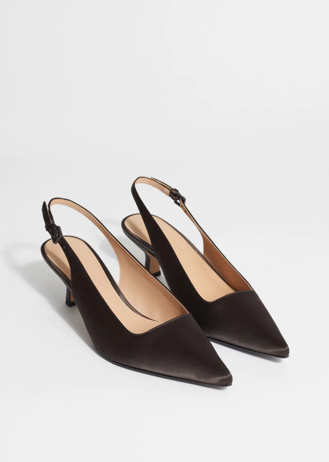 Pointed pumps featuring an adjustable slingback strap and a slim ’90s style kitten heel.