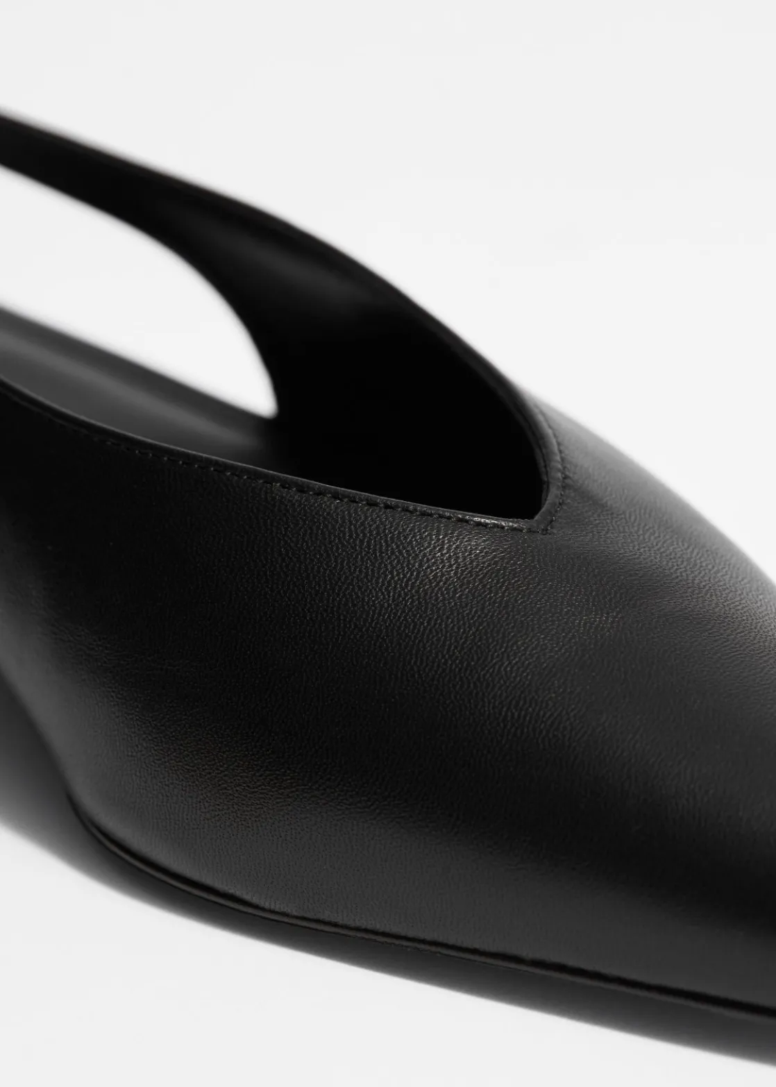 Expertly crafted in Portugal from butter-soft leather, these slingbacks are designed with pointed toes, an angled V-shaped vamp, silver-tone buckles and slight heels. They rest upon lightly padded insoles so they’re comfortable to walk in all evening.