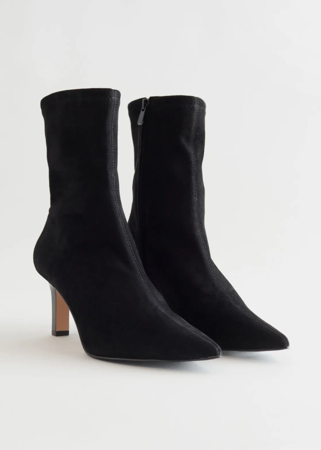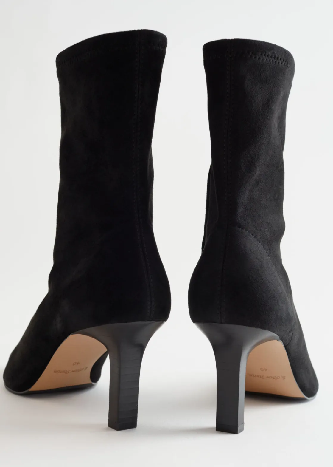 Pointy sock boots with topstitched centre seams, squared thin heels and concealed side zippers.