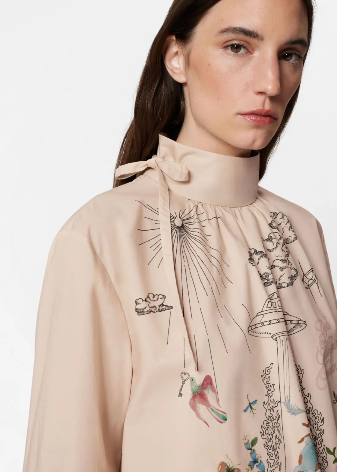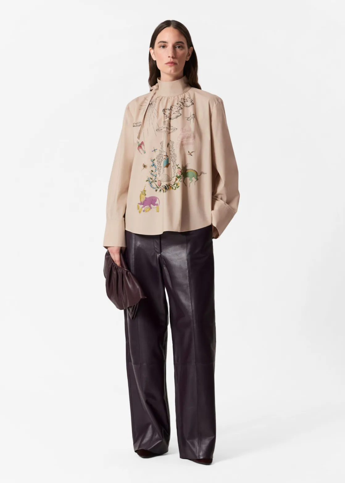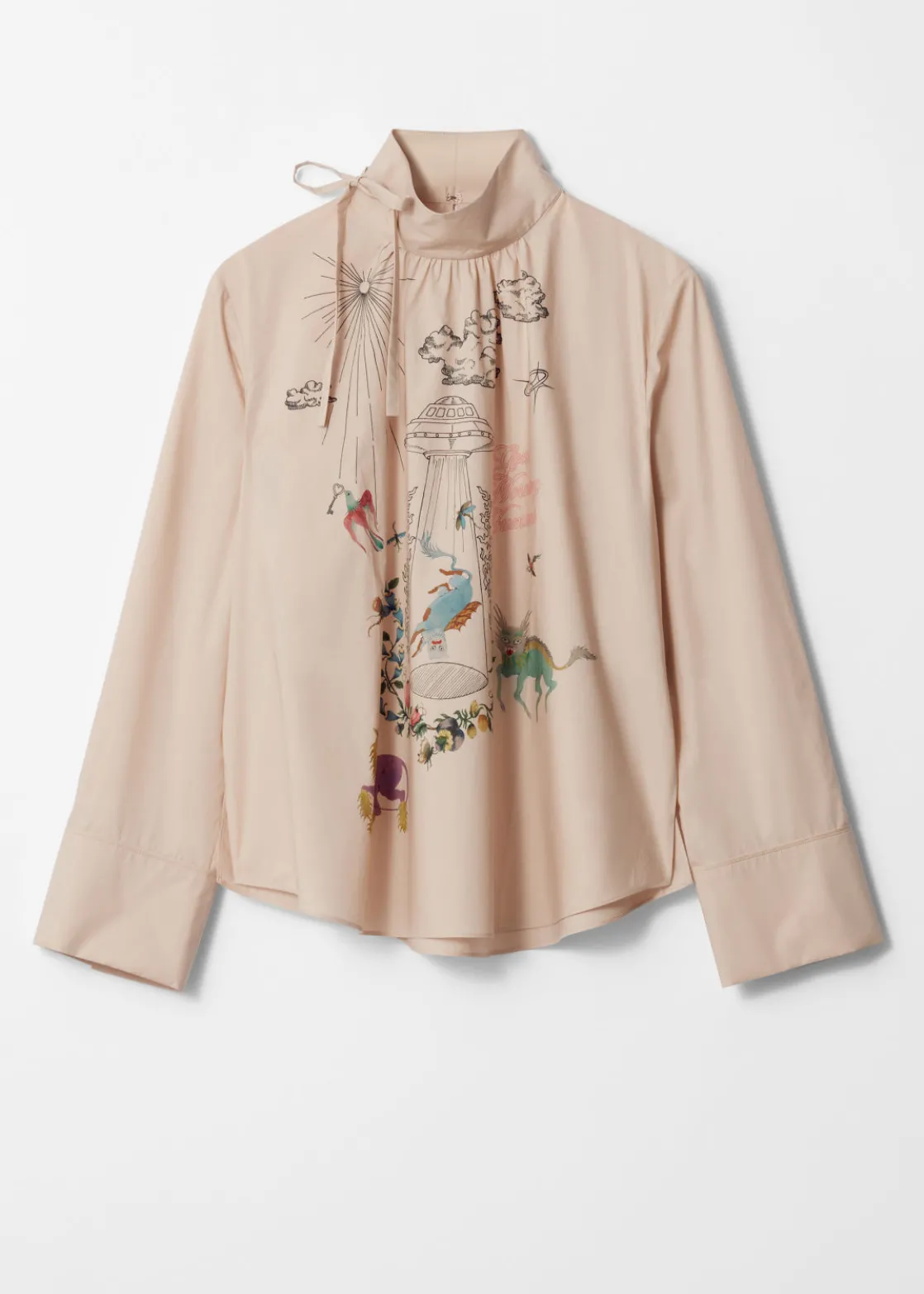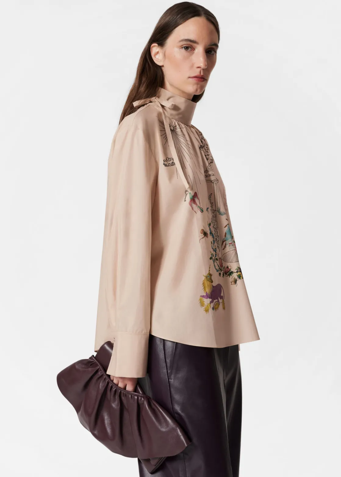 Printed long-sleeve blouse designed with a high collar and a bow at the side of the neck.