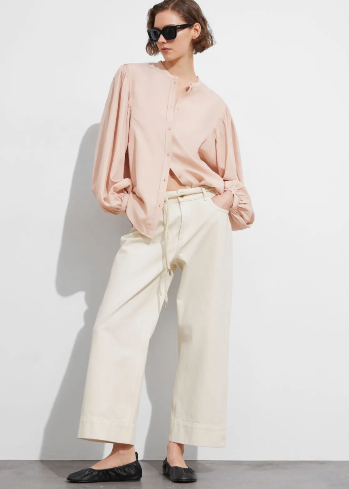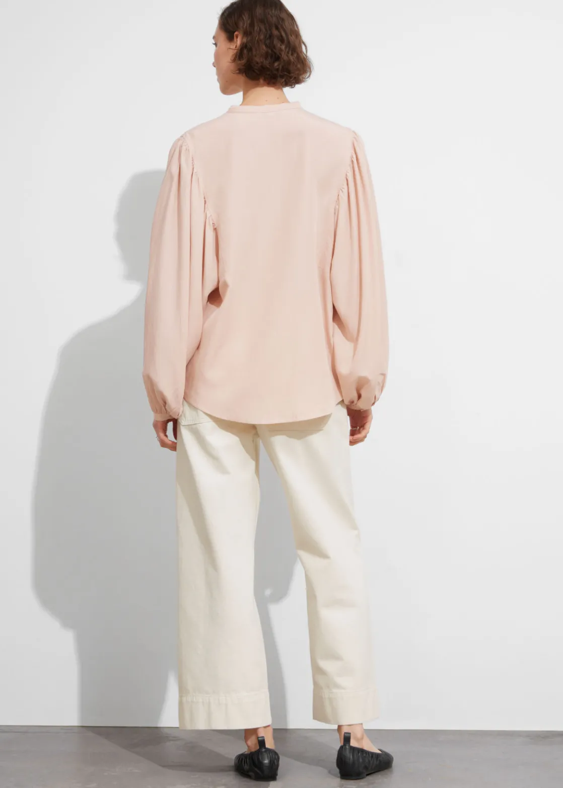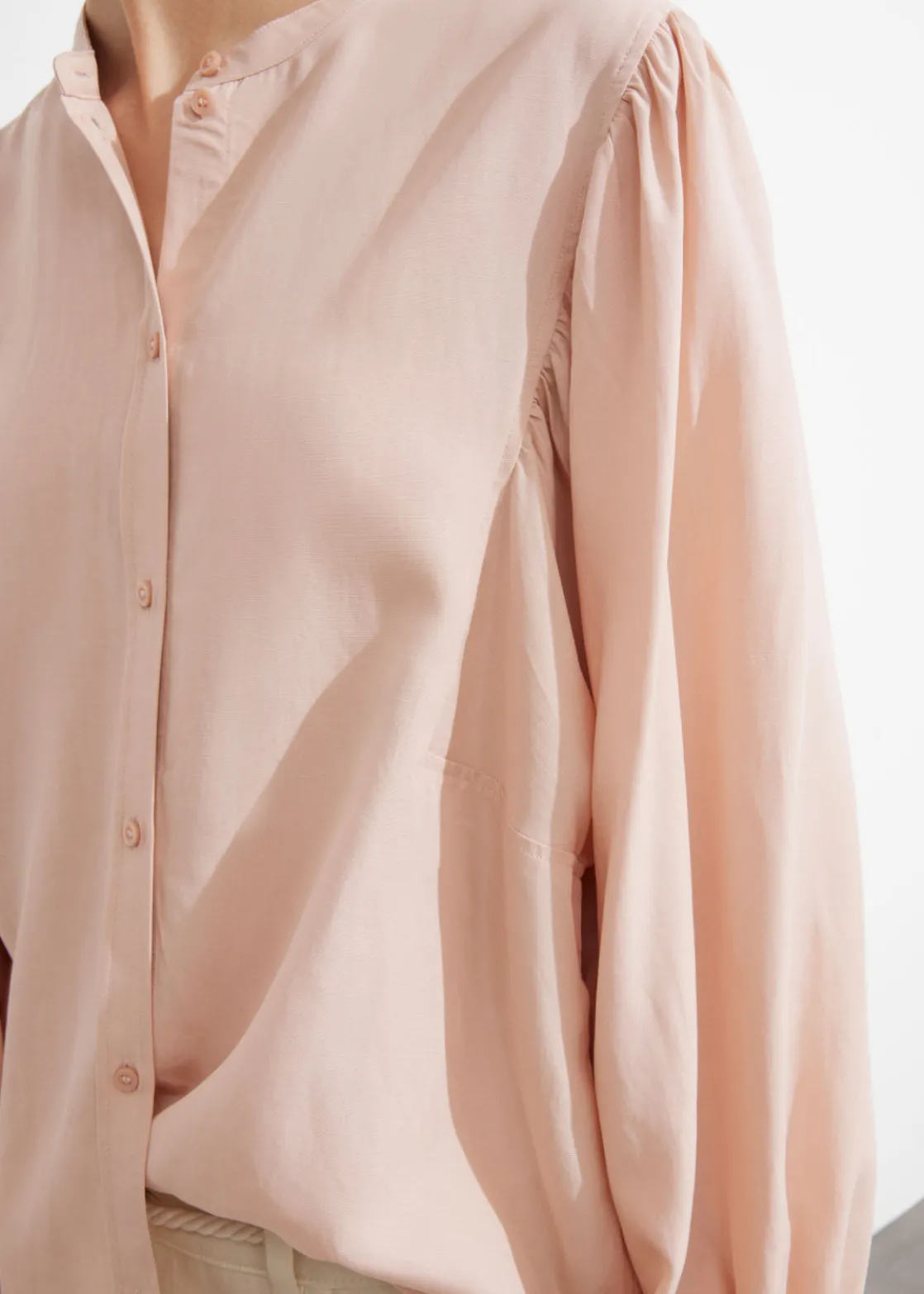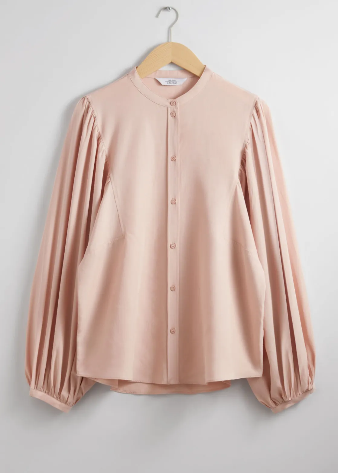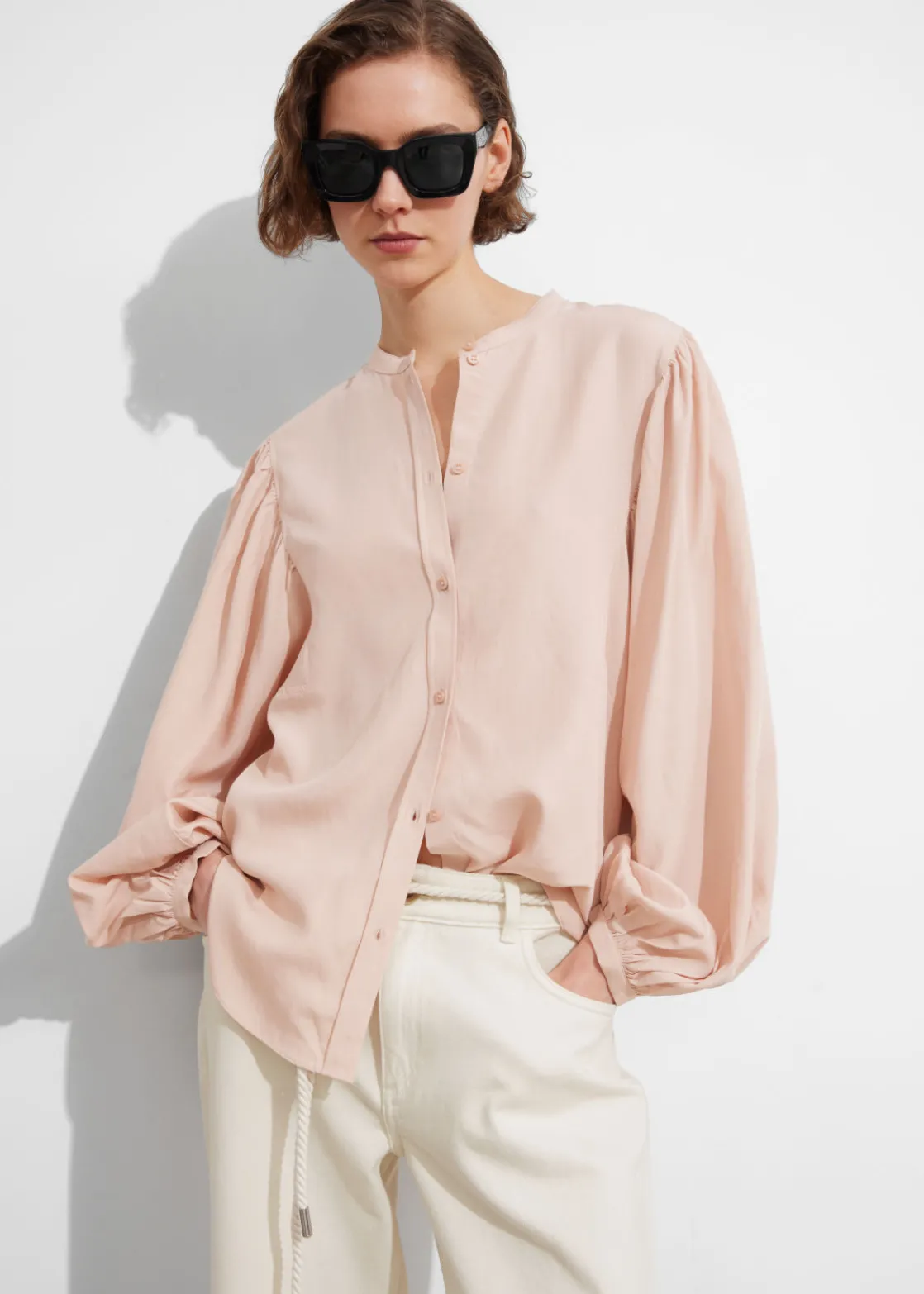 Buttoned blouse featuring puff sleeves and a stand-up collar.