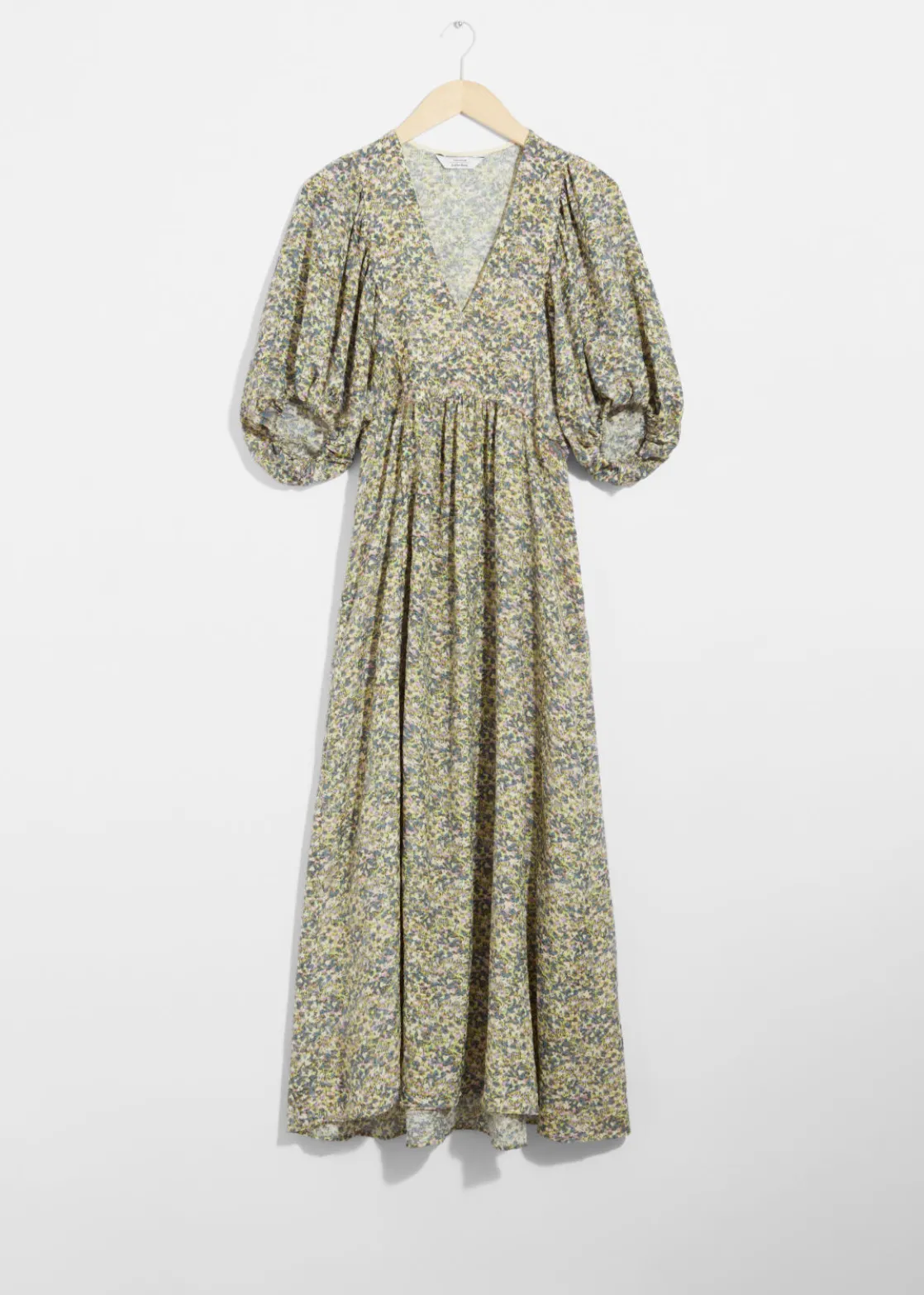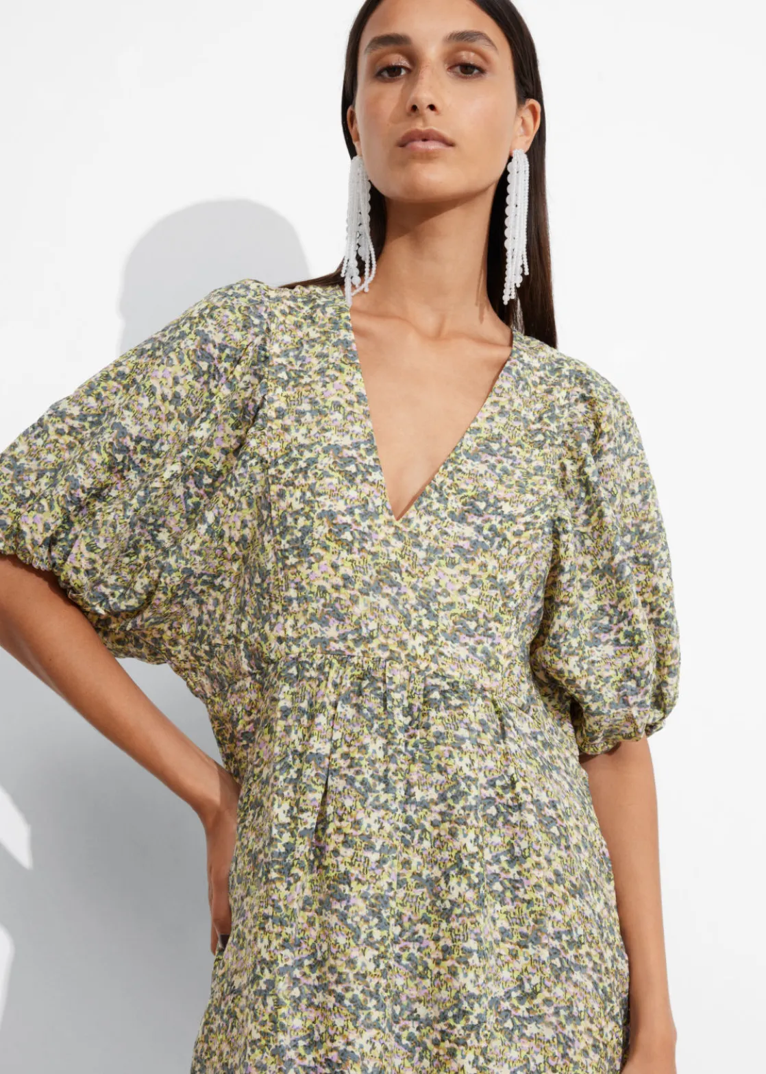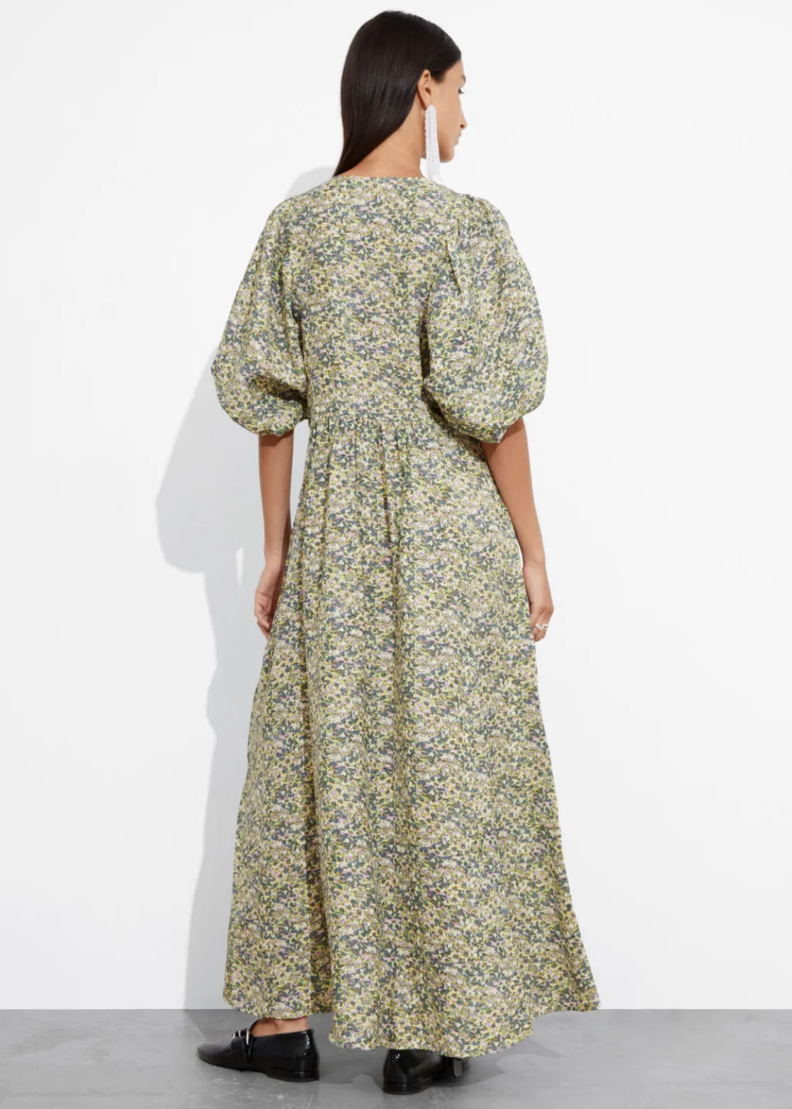 Maxi dress featuring a textured floral finish. Designed with short puff sleeves and a v-cut neckline.