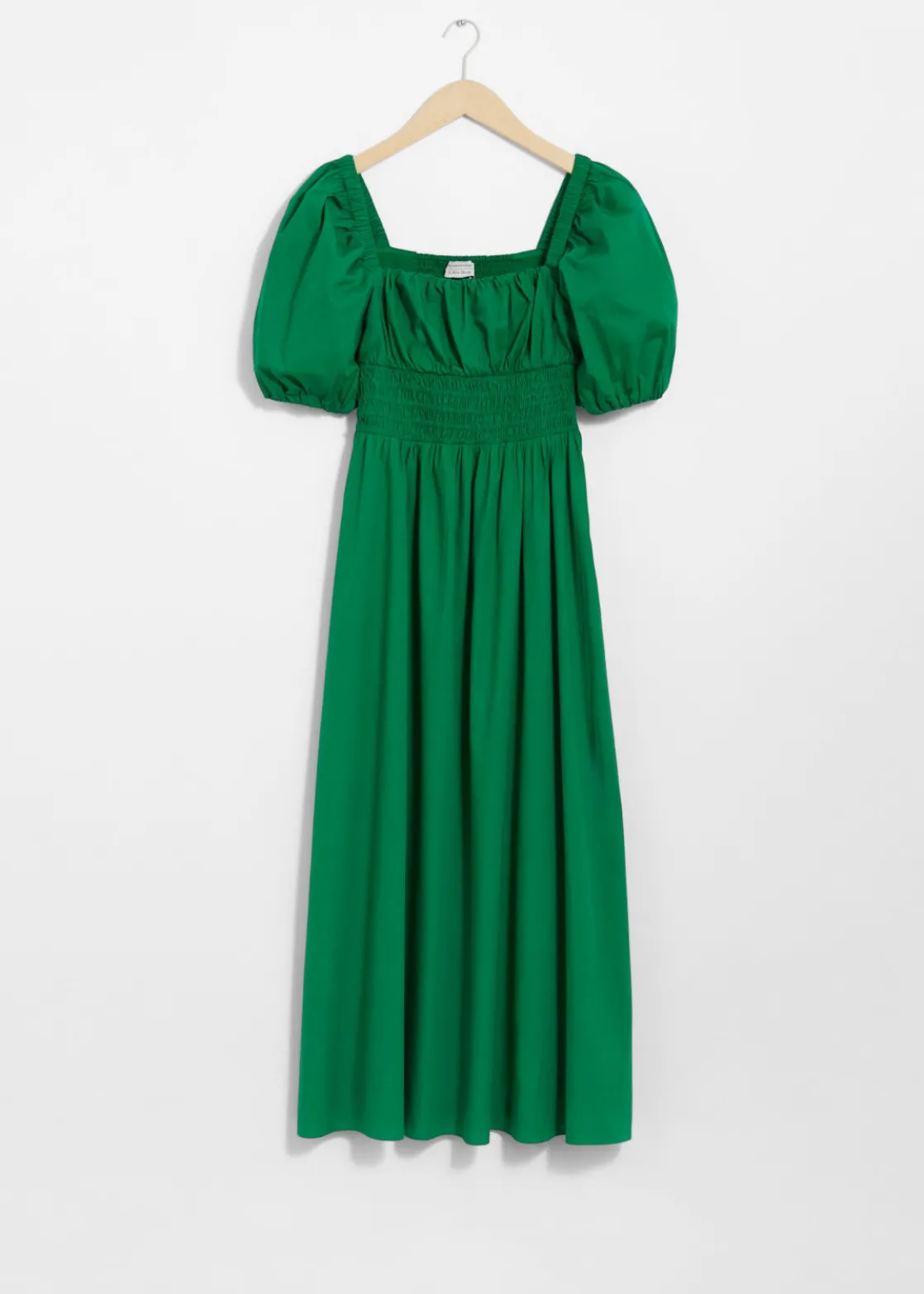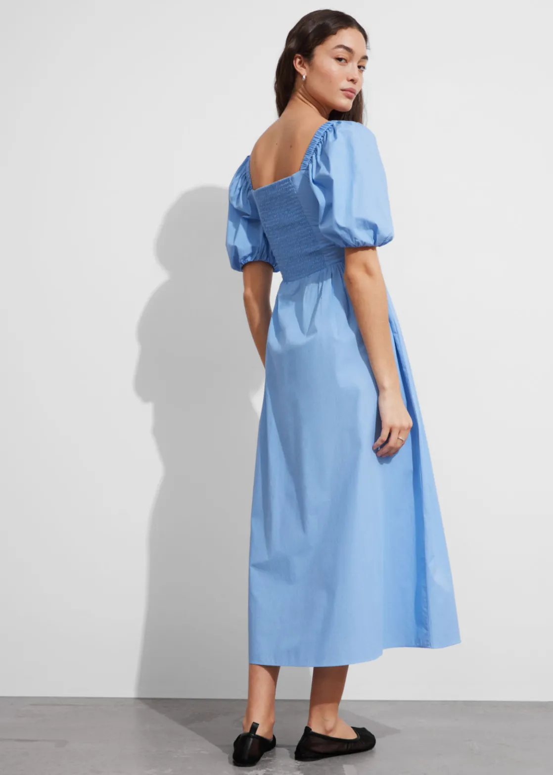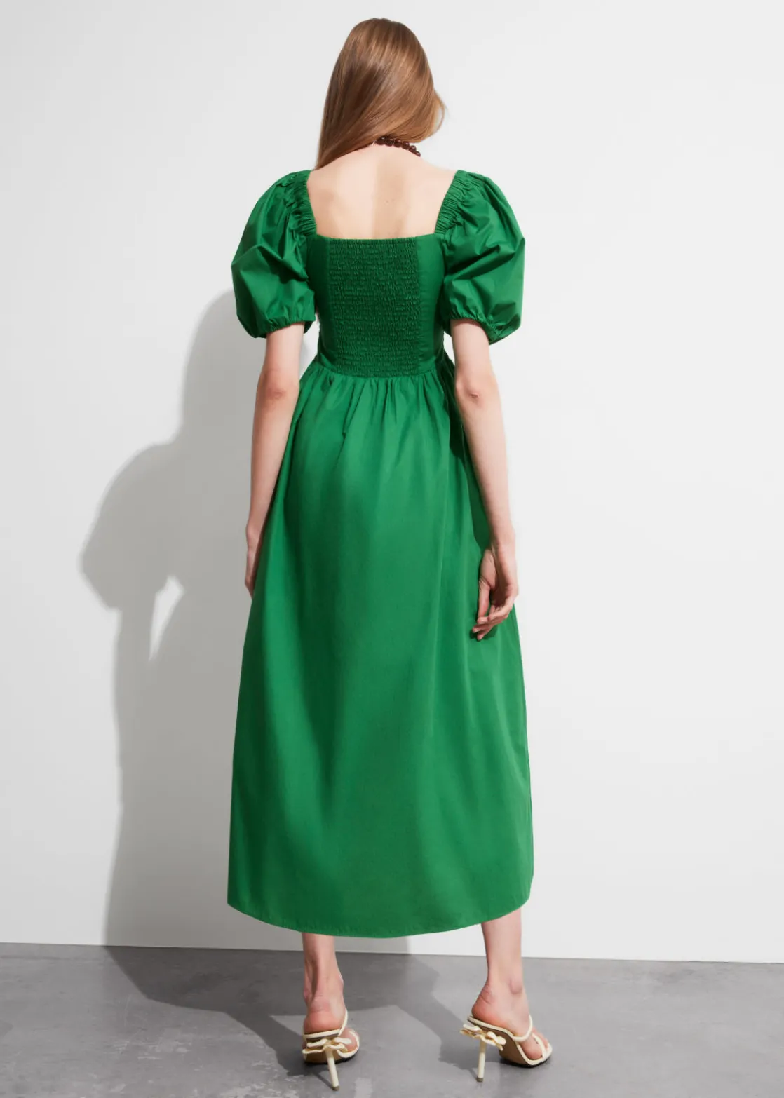 Midi dress featuring short puff sleeves, a sweetheart neckline and a gently pleated silhouette.