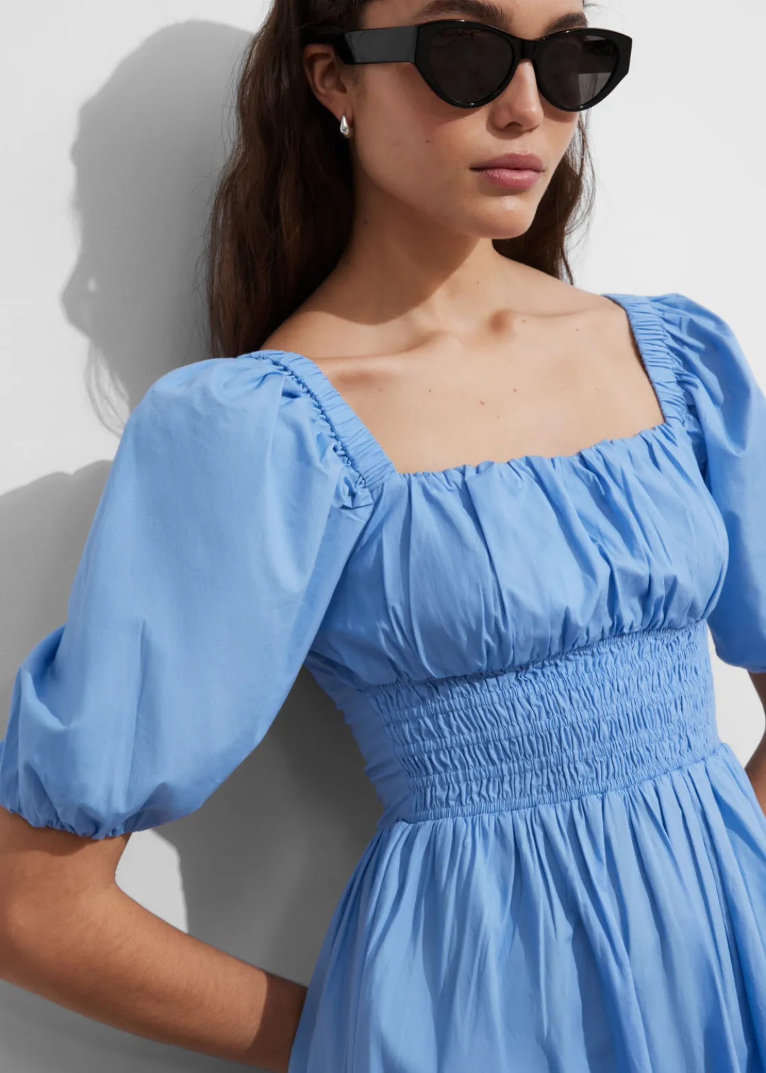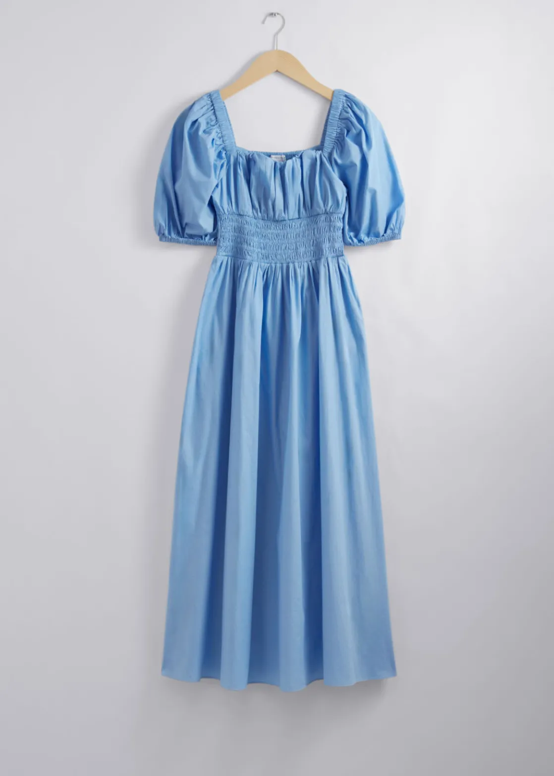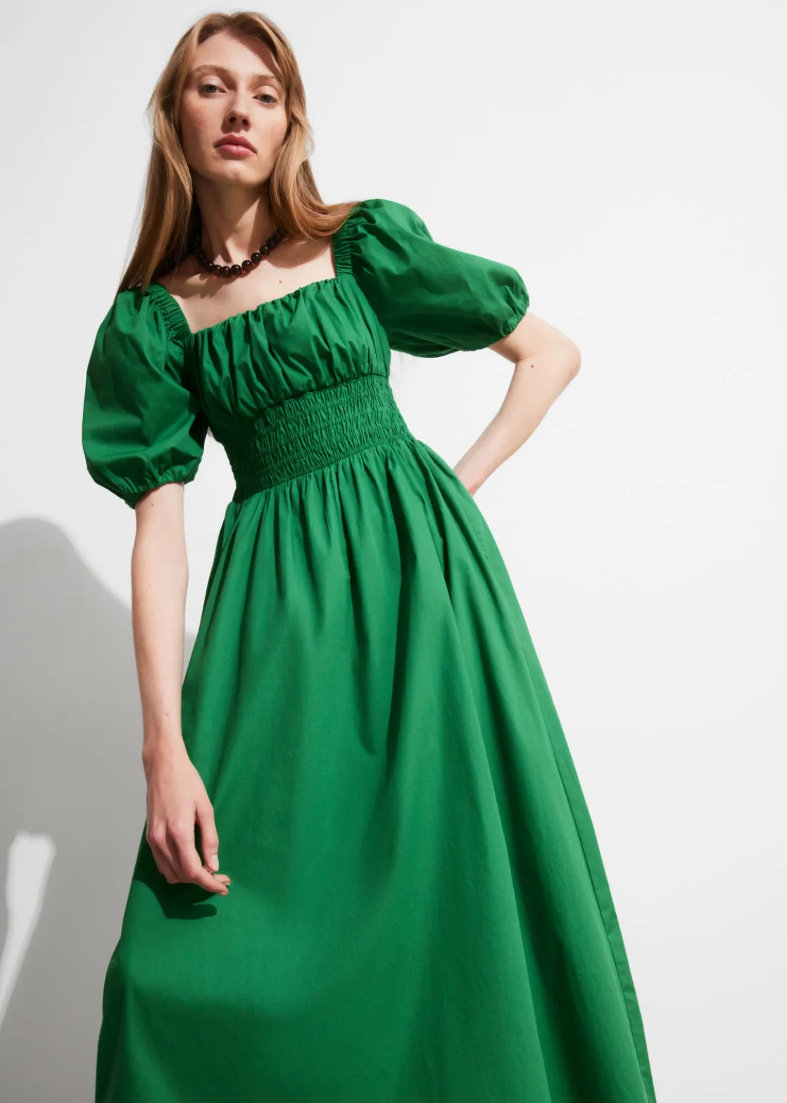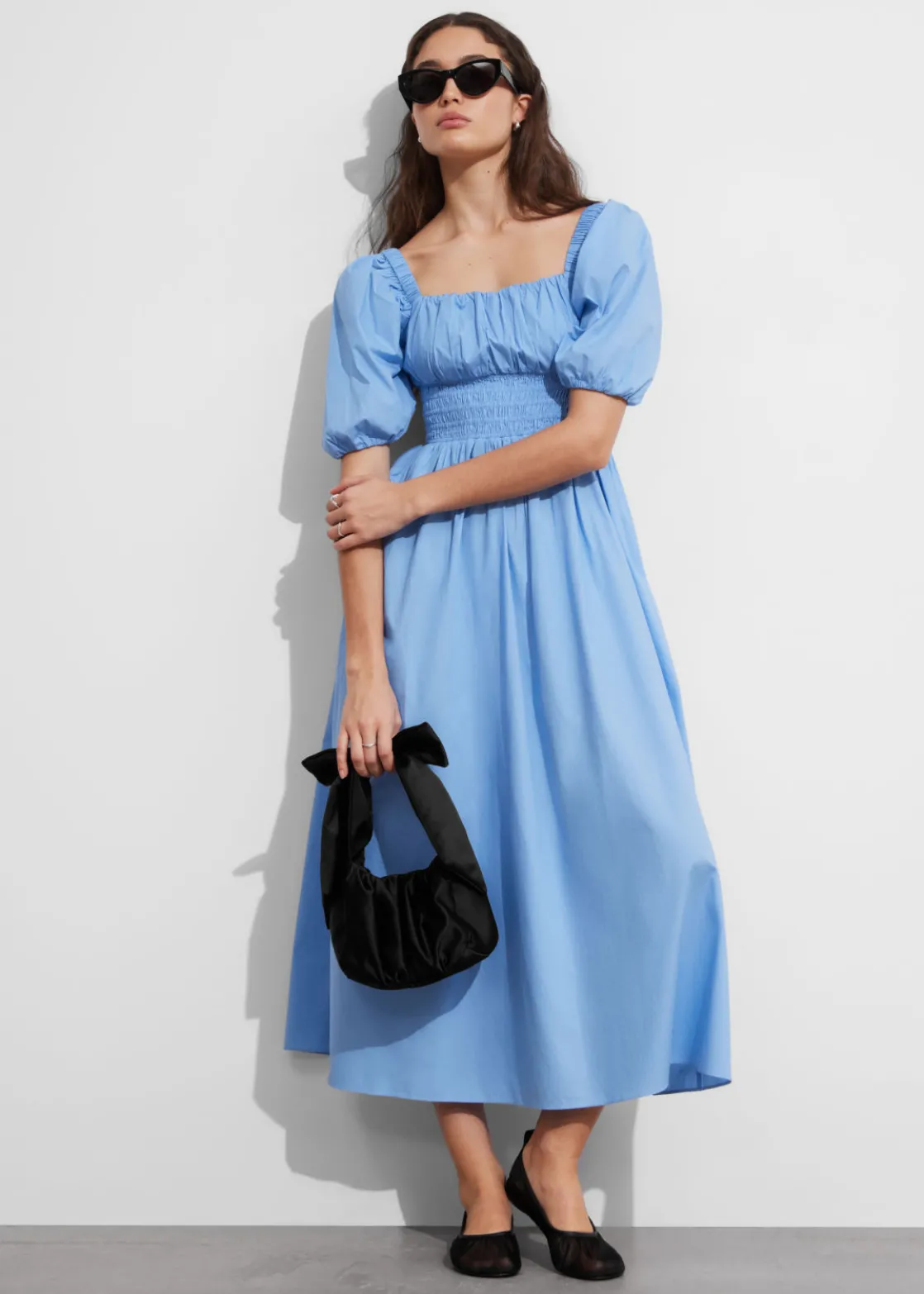 Midi dress featuring short puff sleeves, a sweetheart neckline and a gently pleated silhouette.