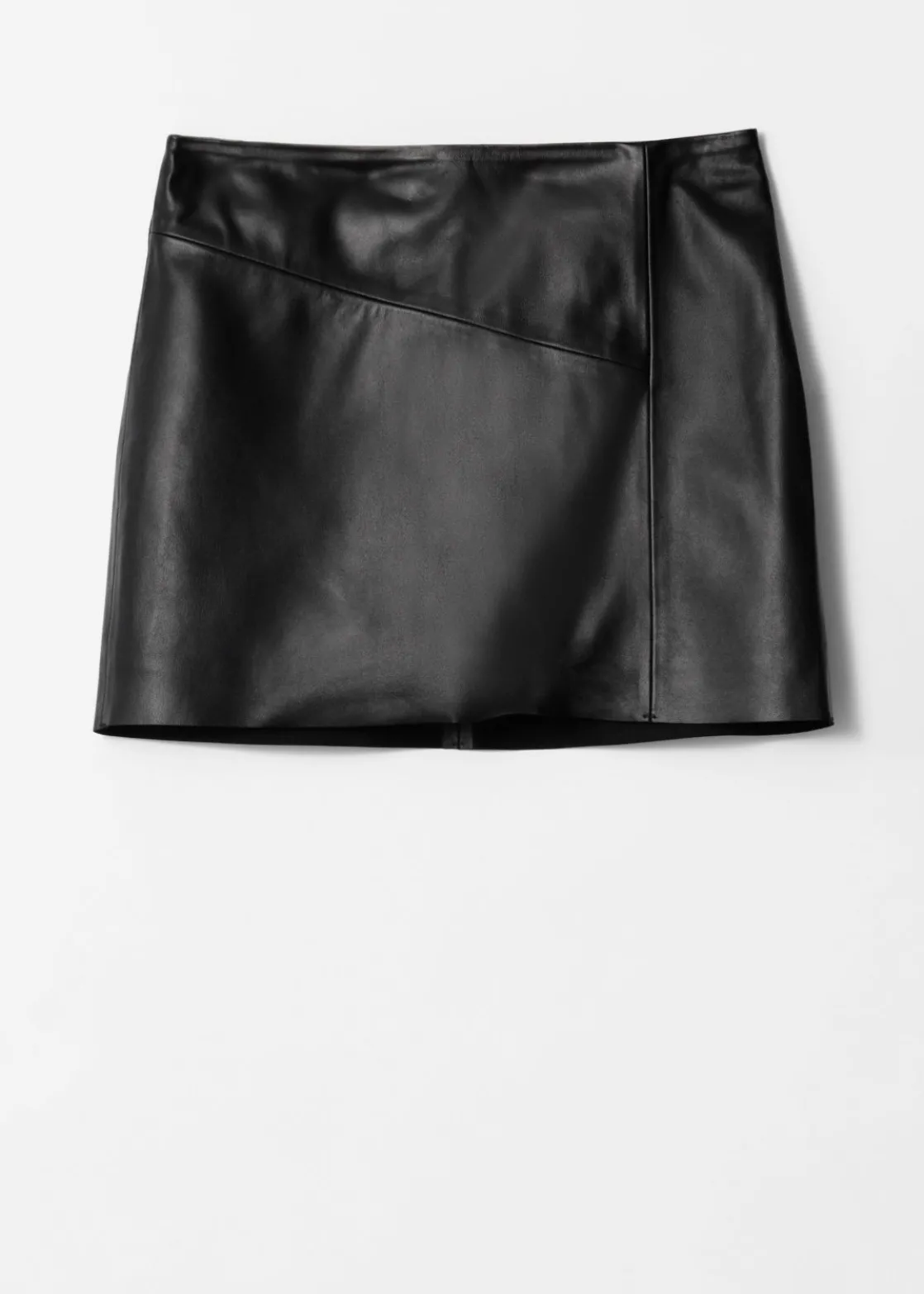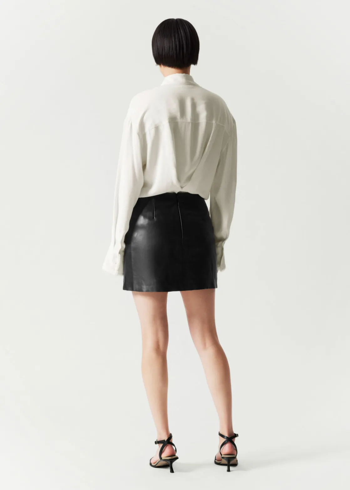Leather mini skirt finished with a raw-edge hemline. Secured with a zipper at the back.