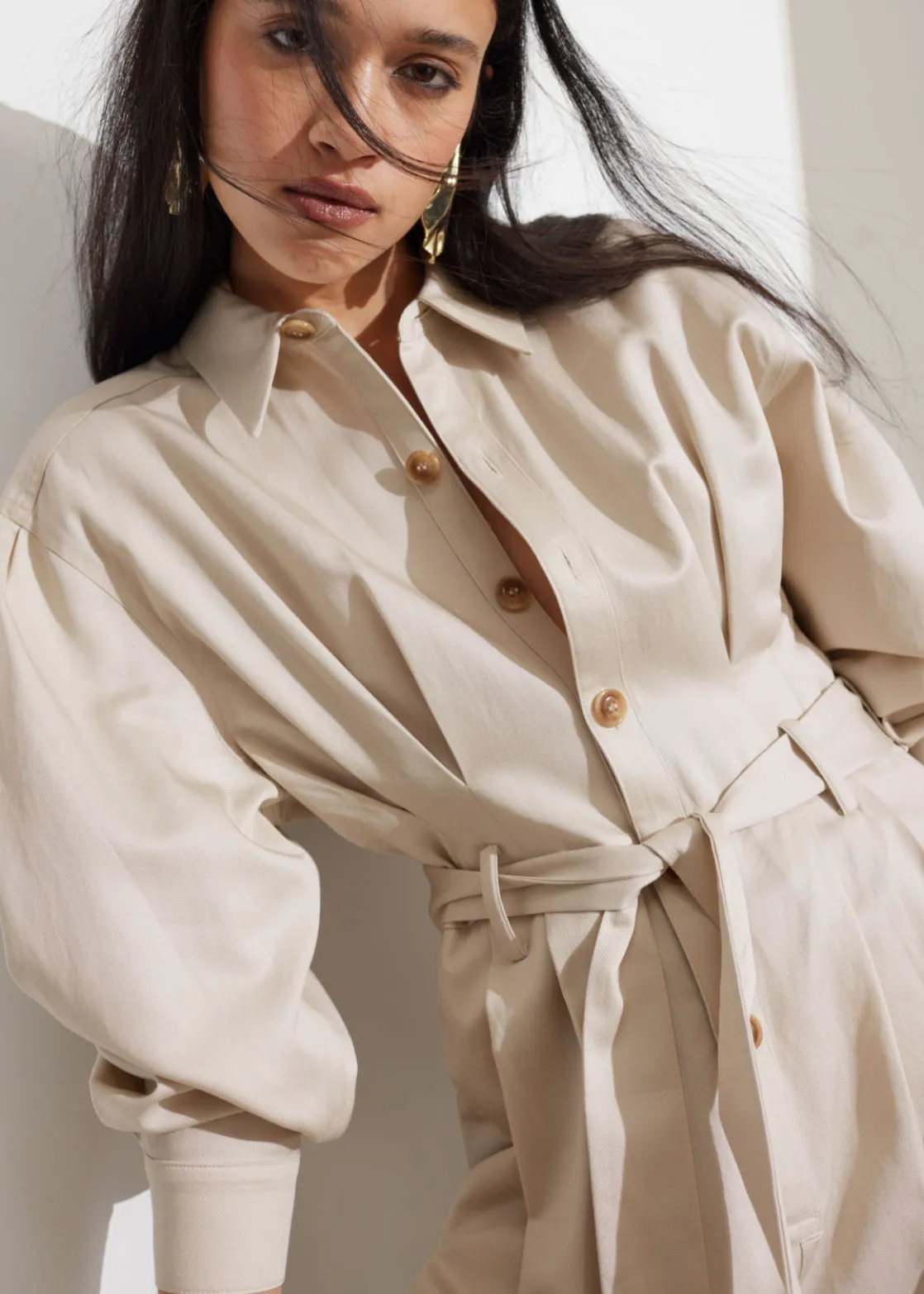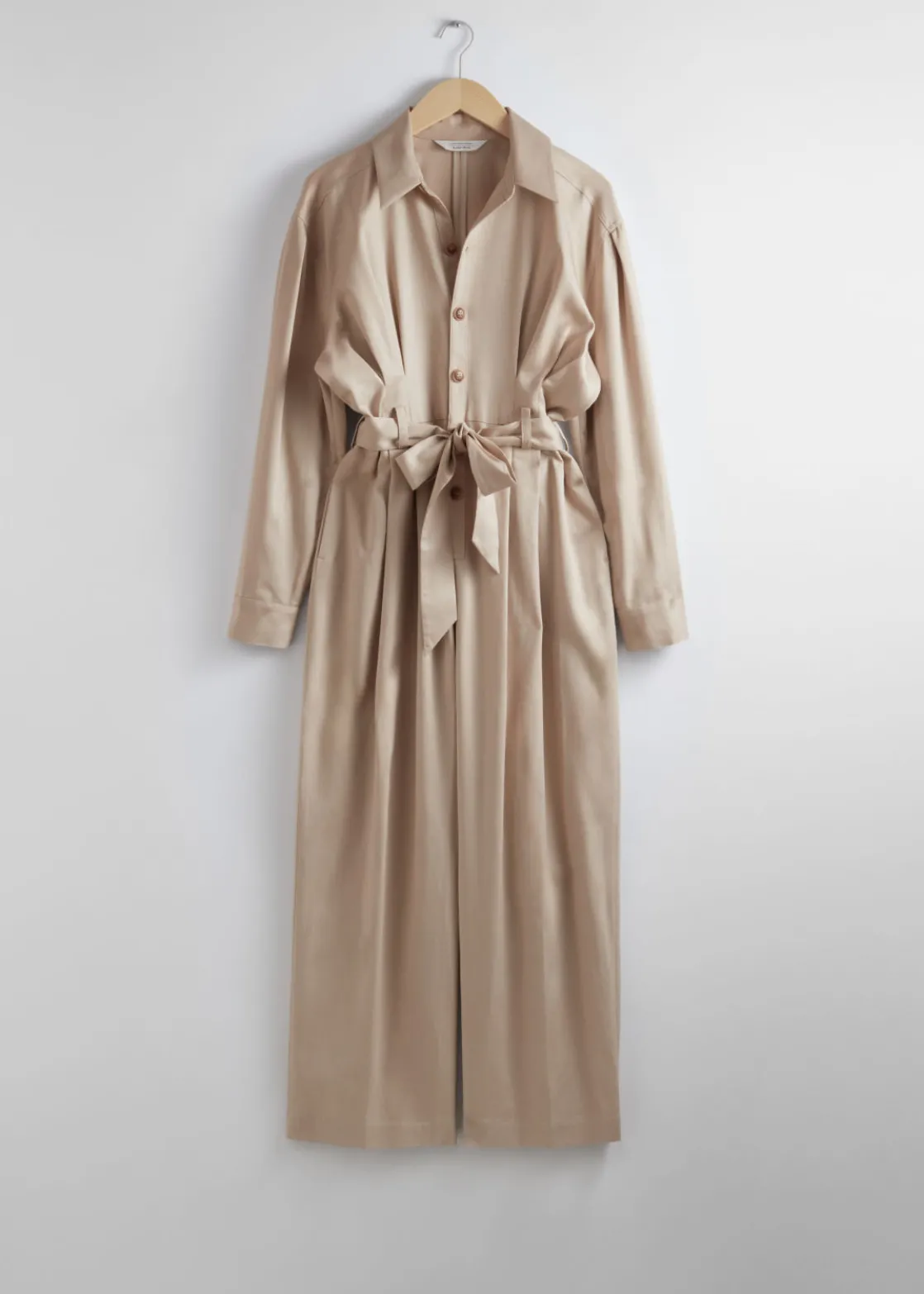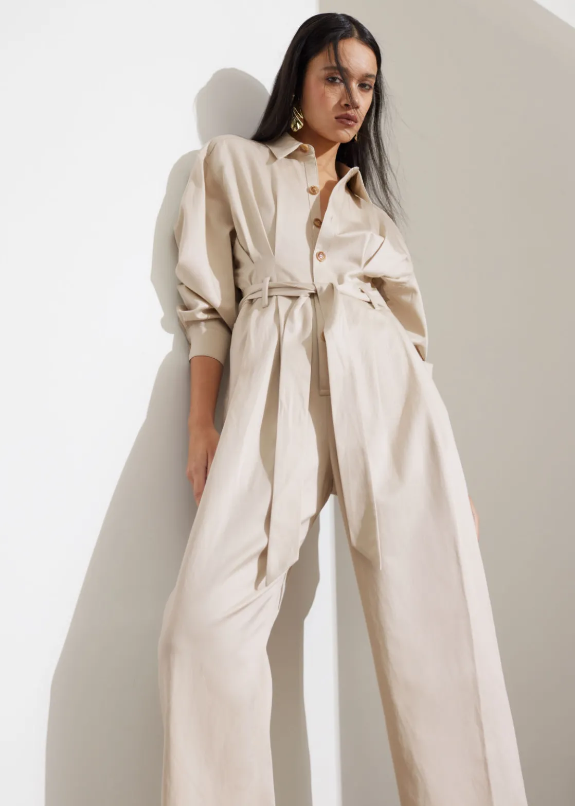Collared jumpsuit featuring a straight silhouette. Secured with a tonal self-tie belt.