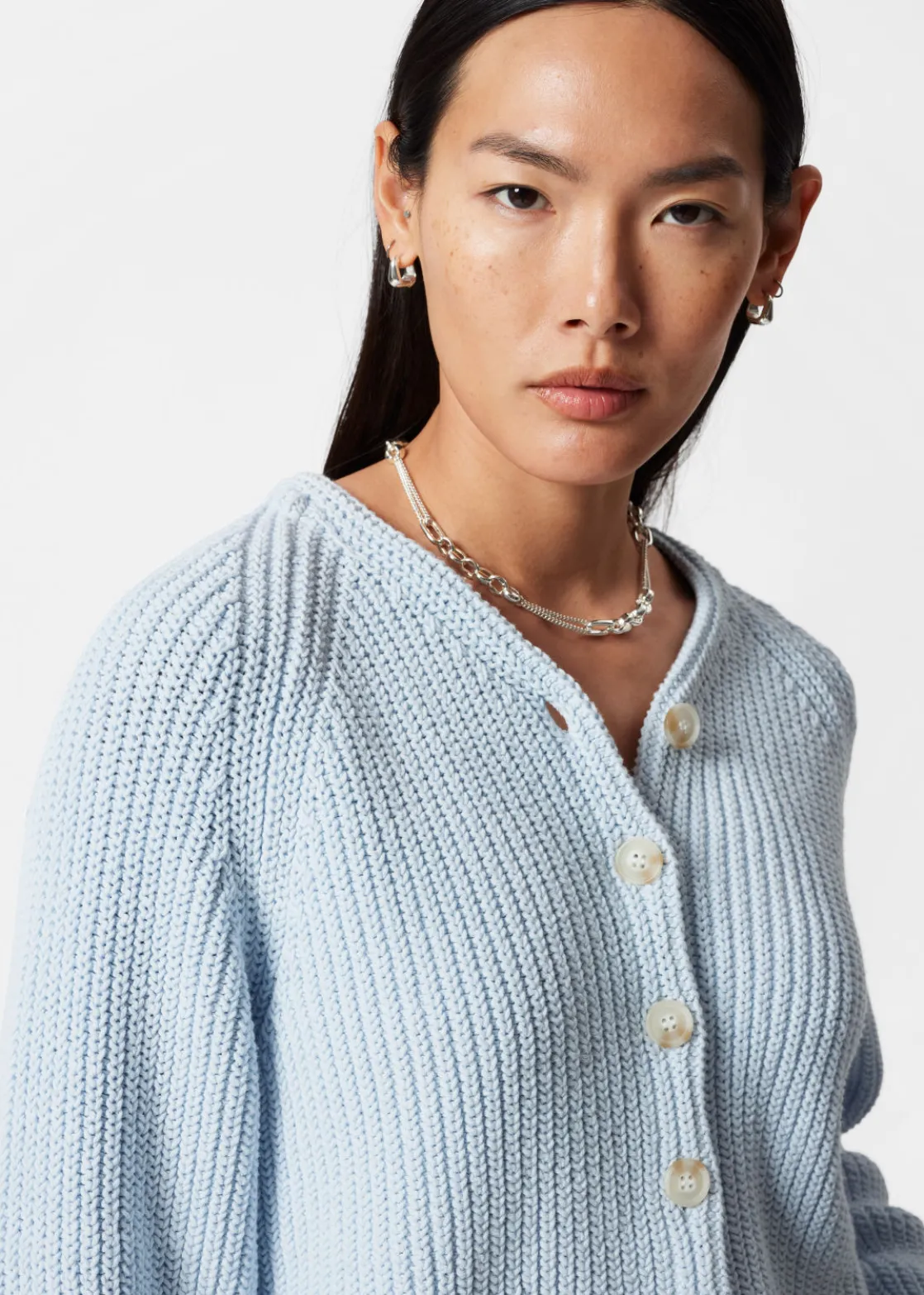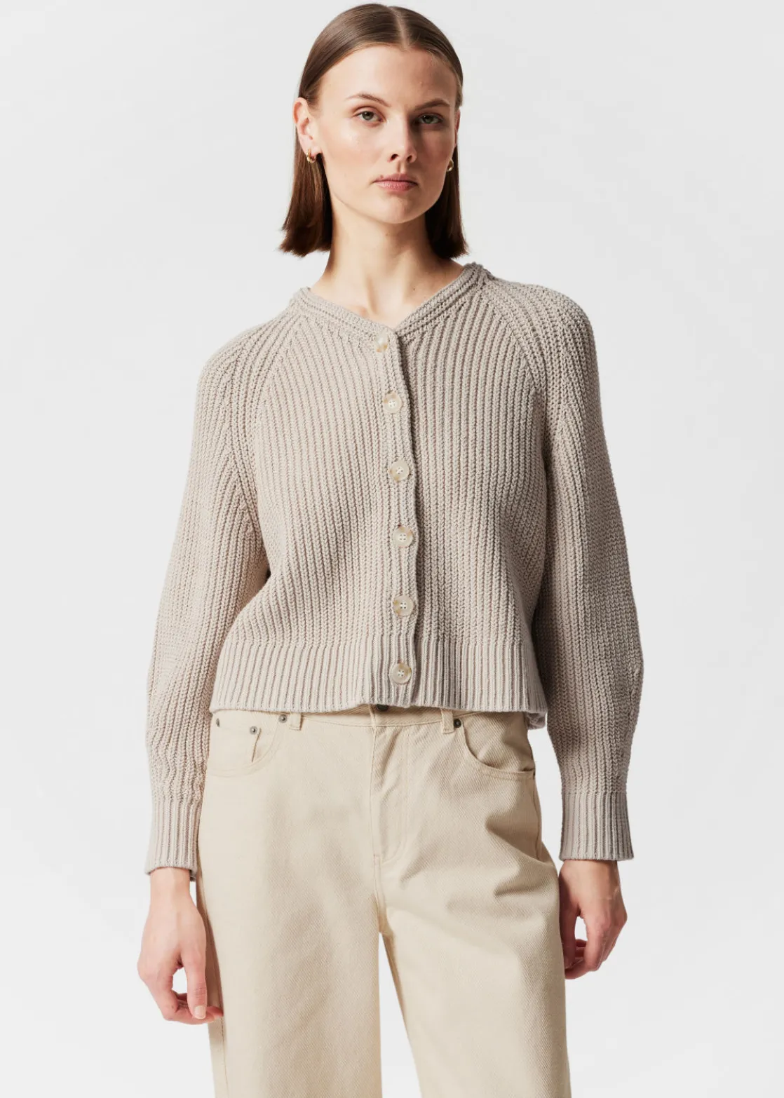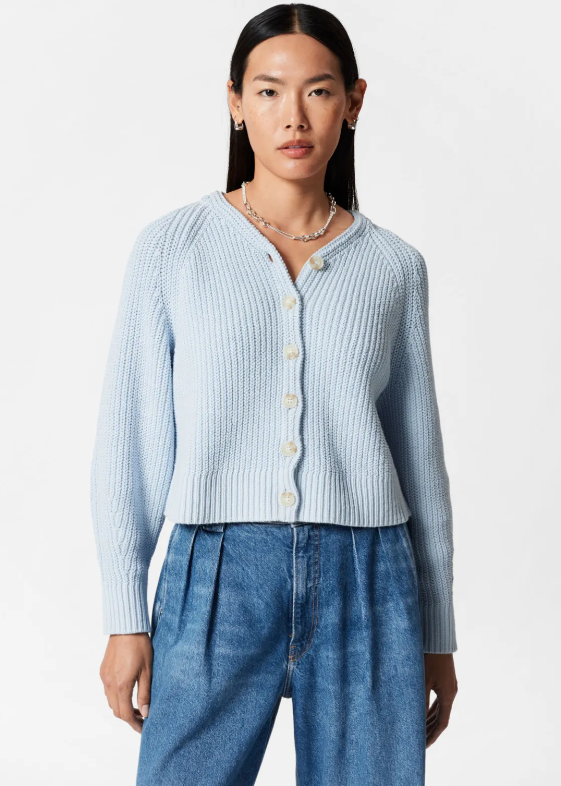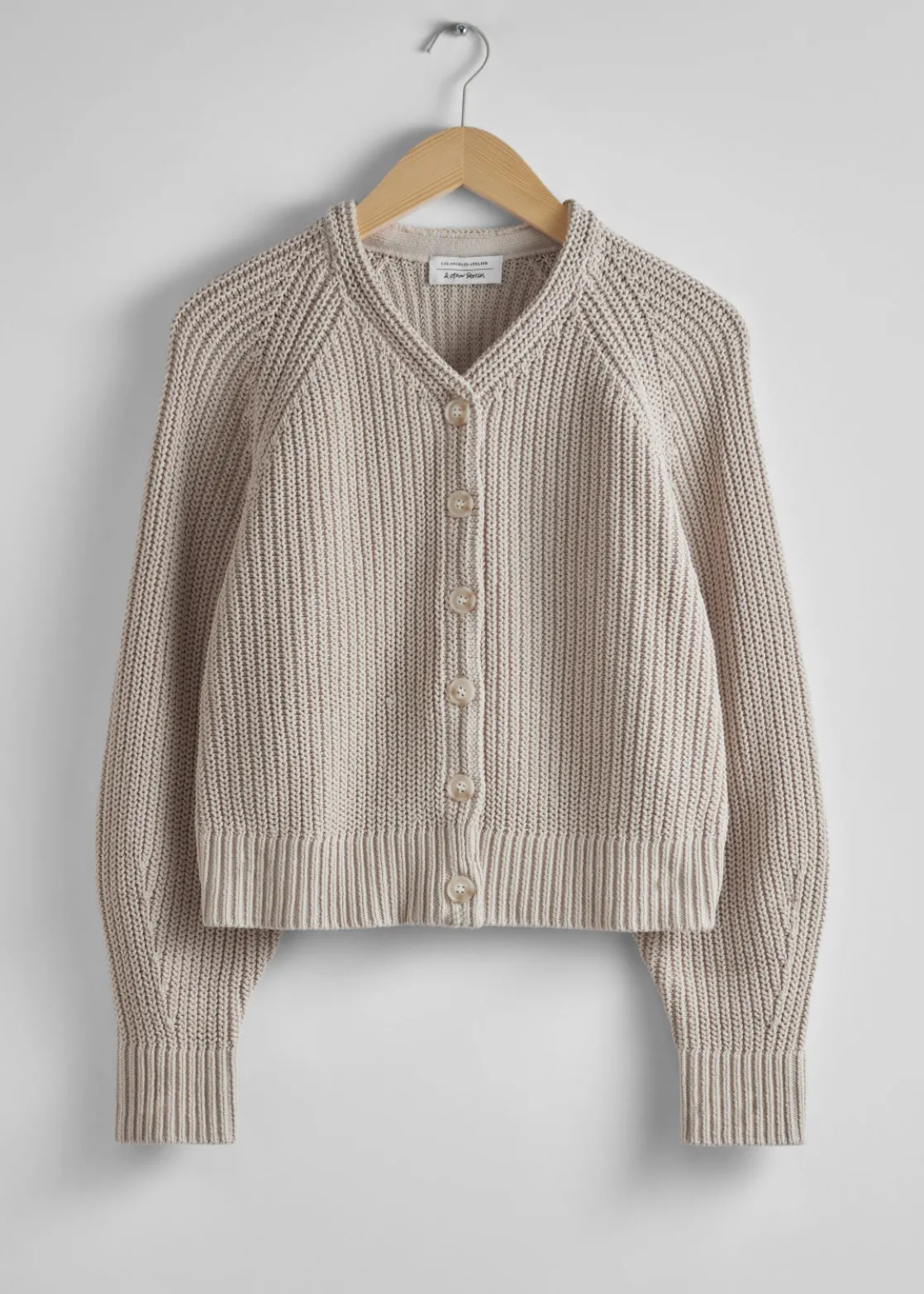 Long-sleeve v-cut knit cardigan with a ribbed finish.