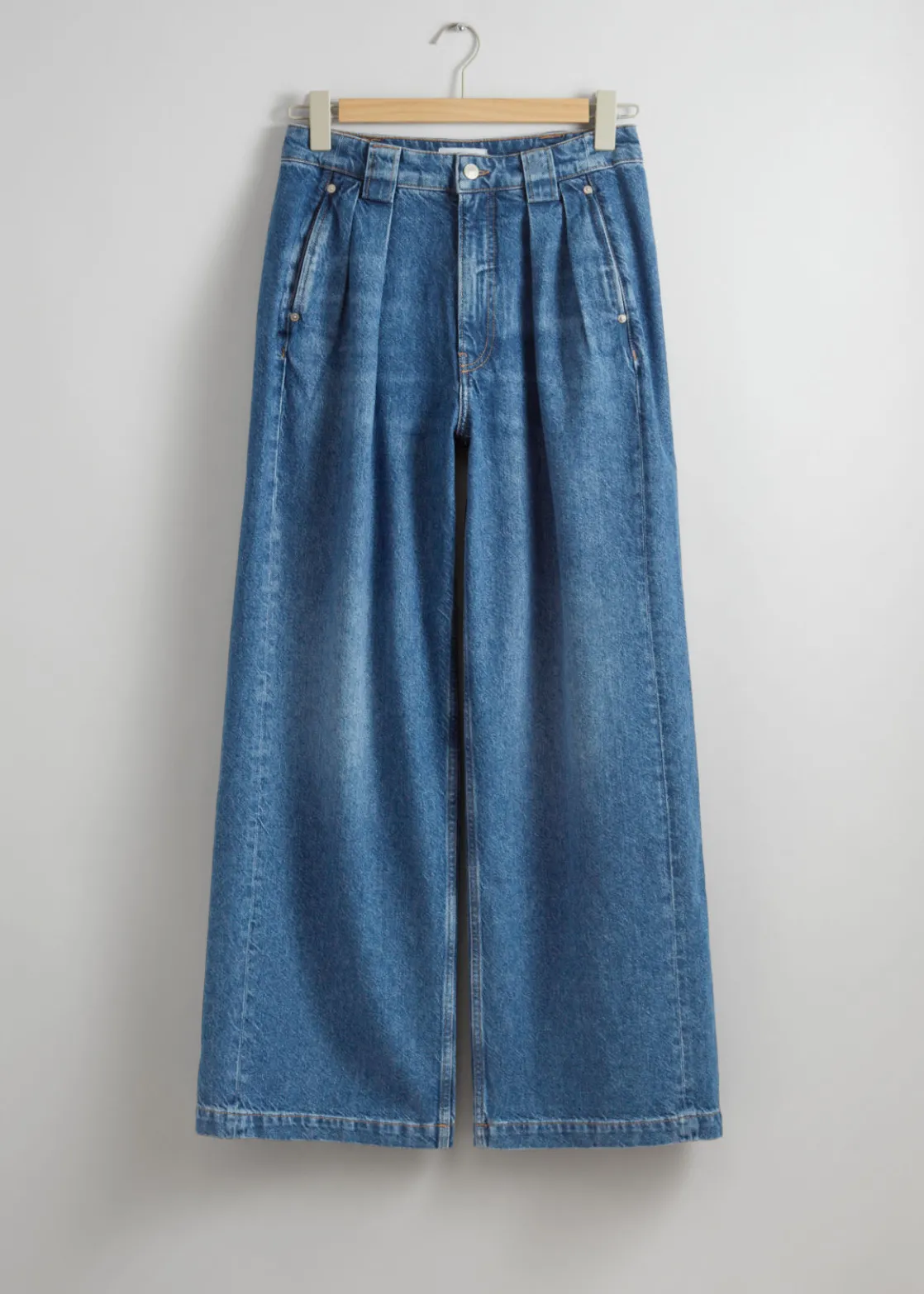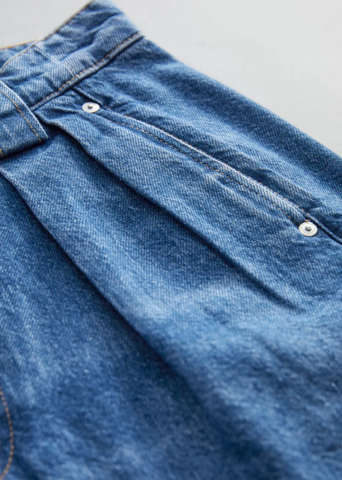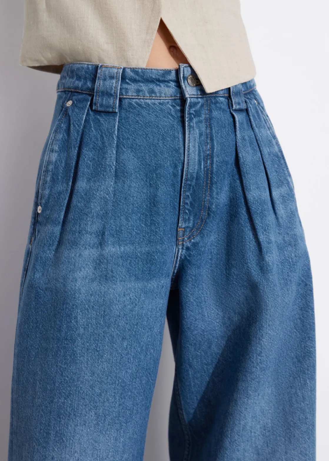 4-pocket denim jeans featuring a relaxed, wide silhouette. Finished with pleated detailing at the top.