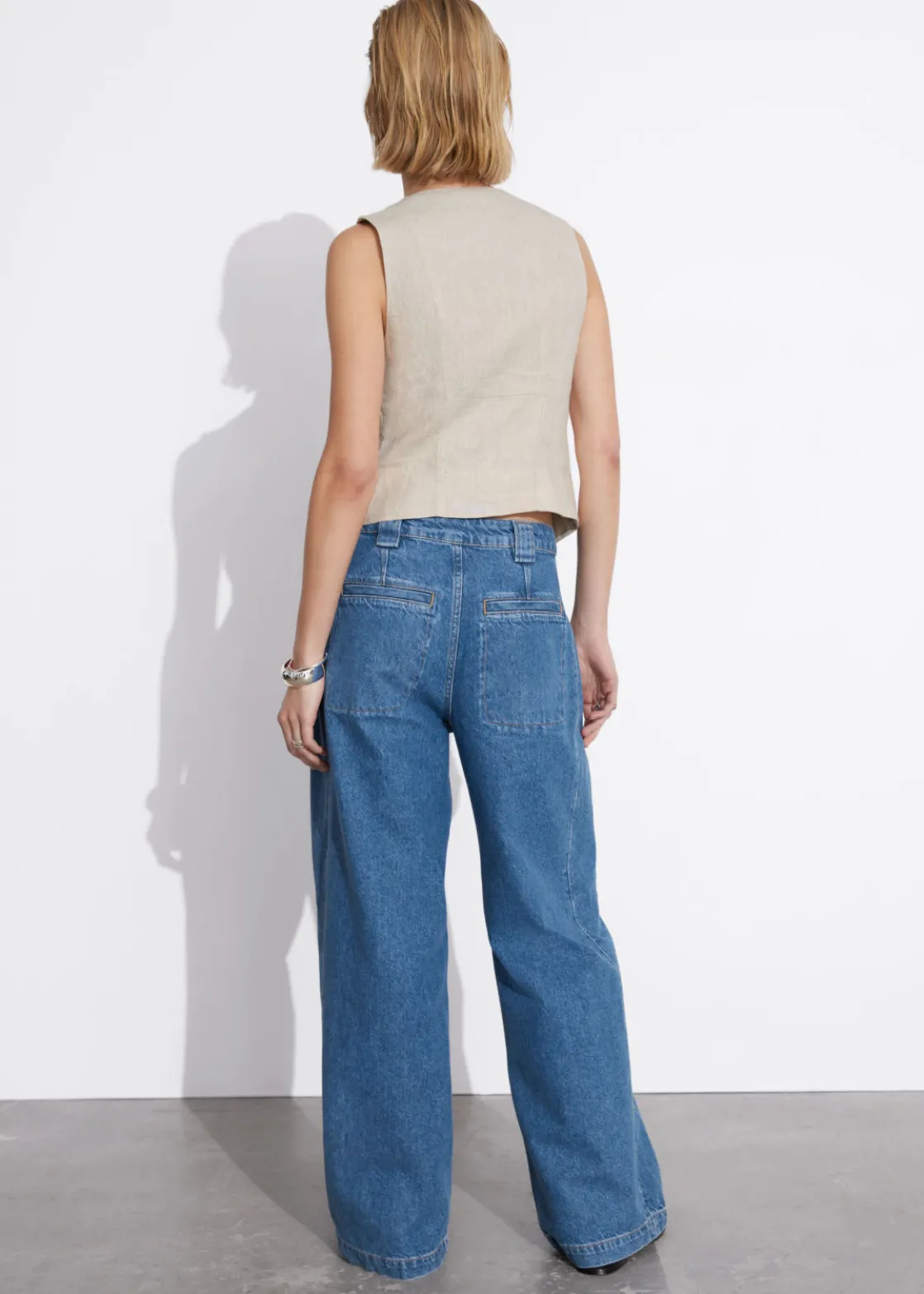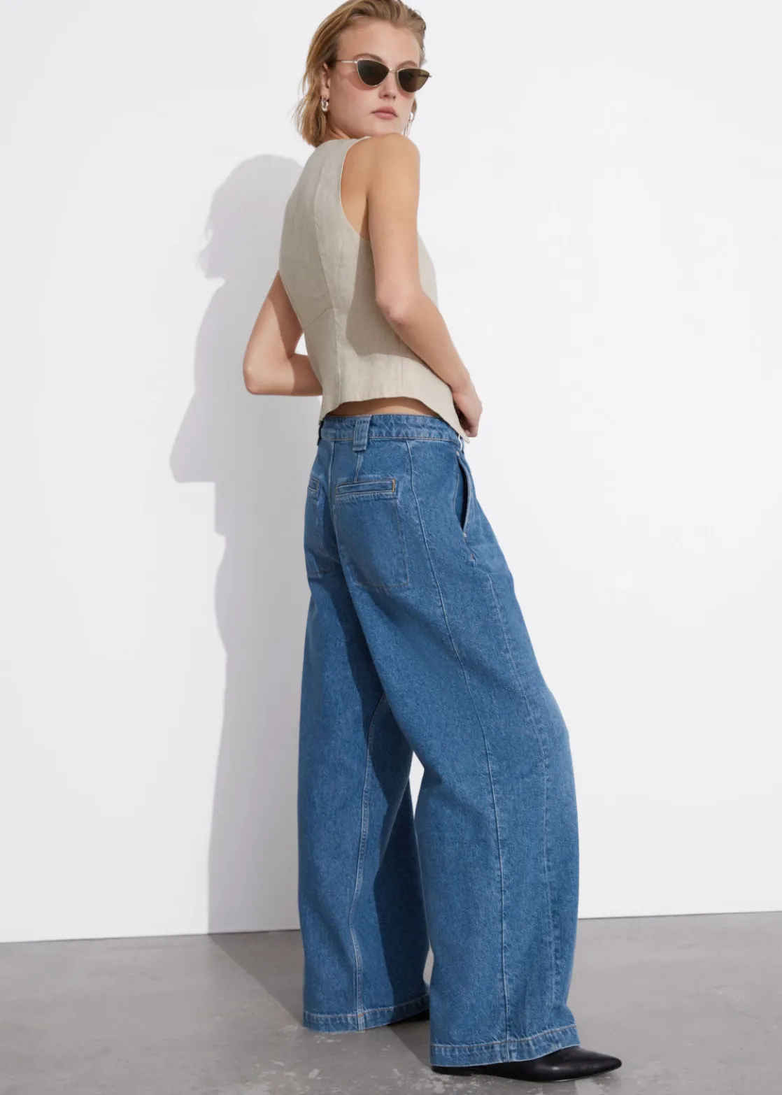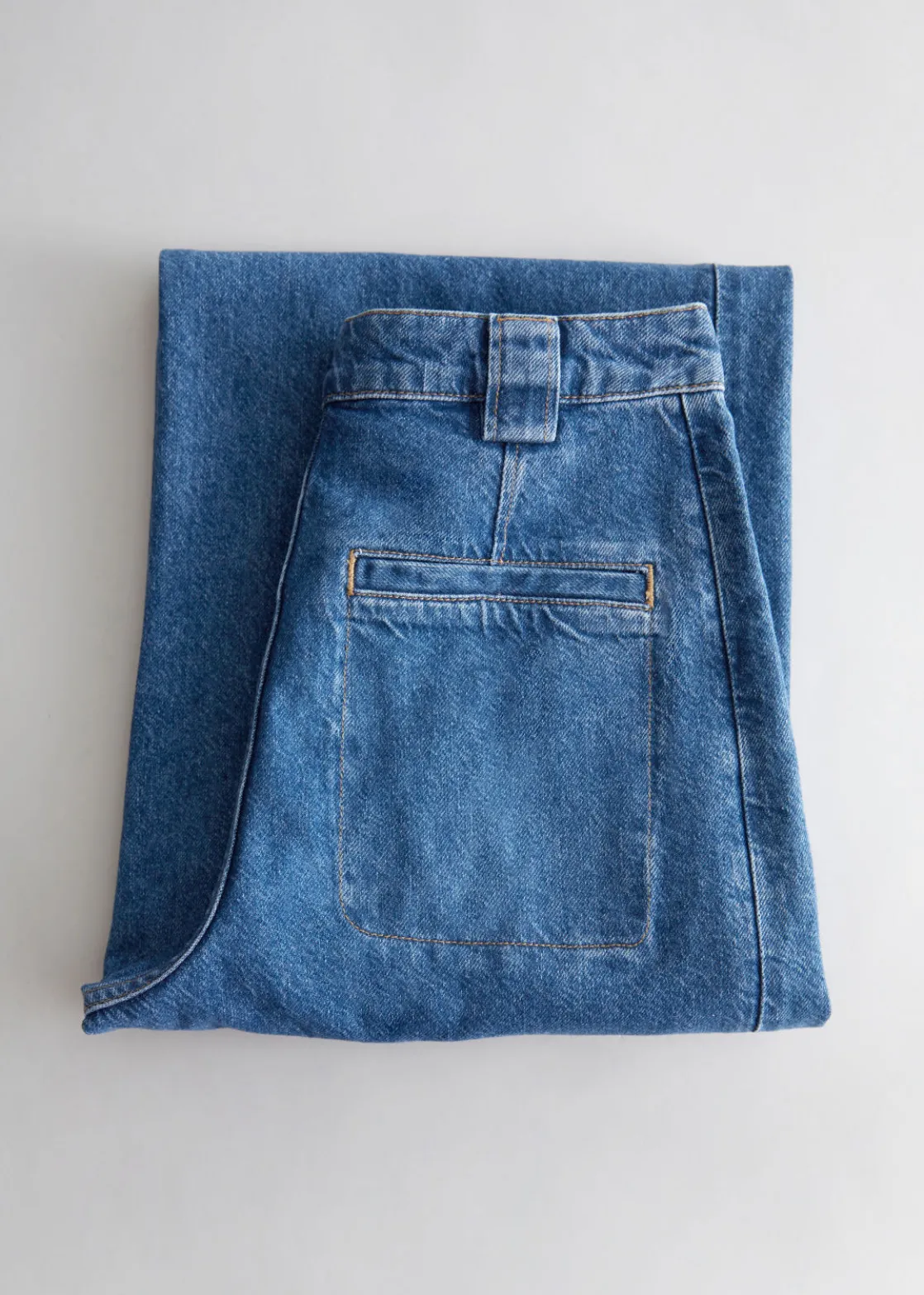 4-pocket denim jeans featuring a relaxed, wide silhouette. Finished with pleated detailing at the top.