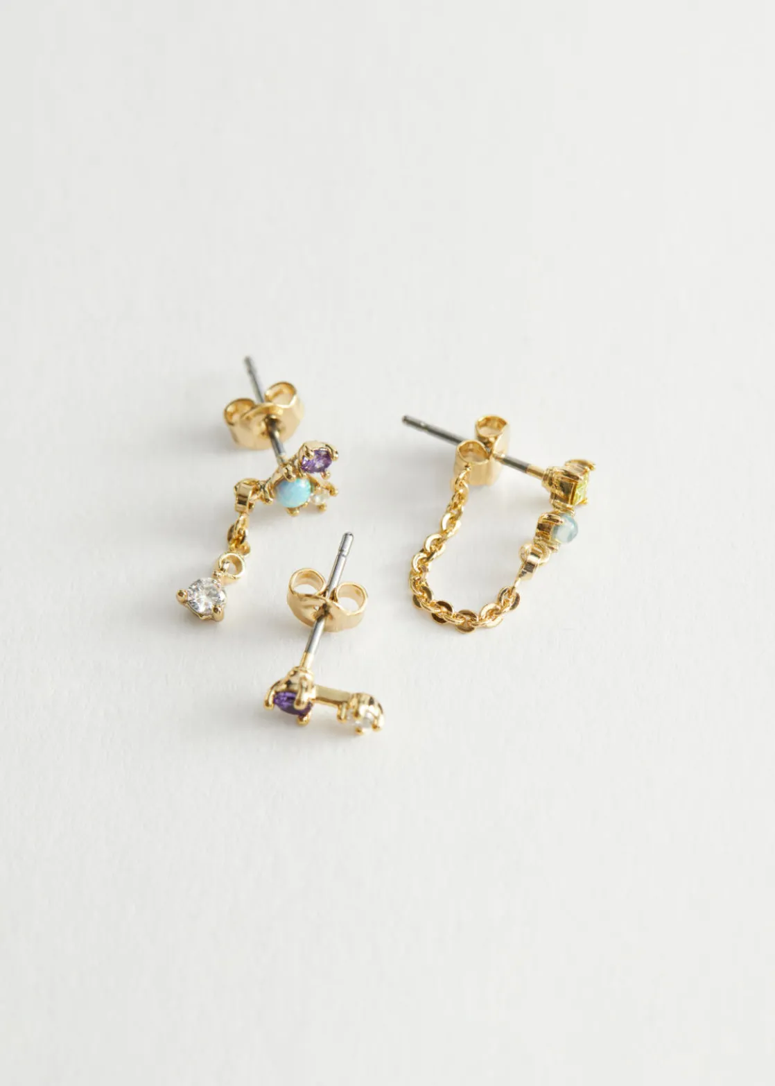 Chain Drop Earrings featuring rhinestones and gemstones with a classic butterfly closure.