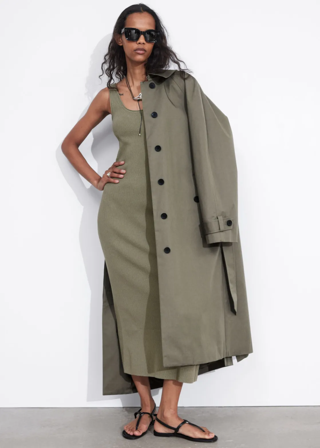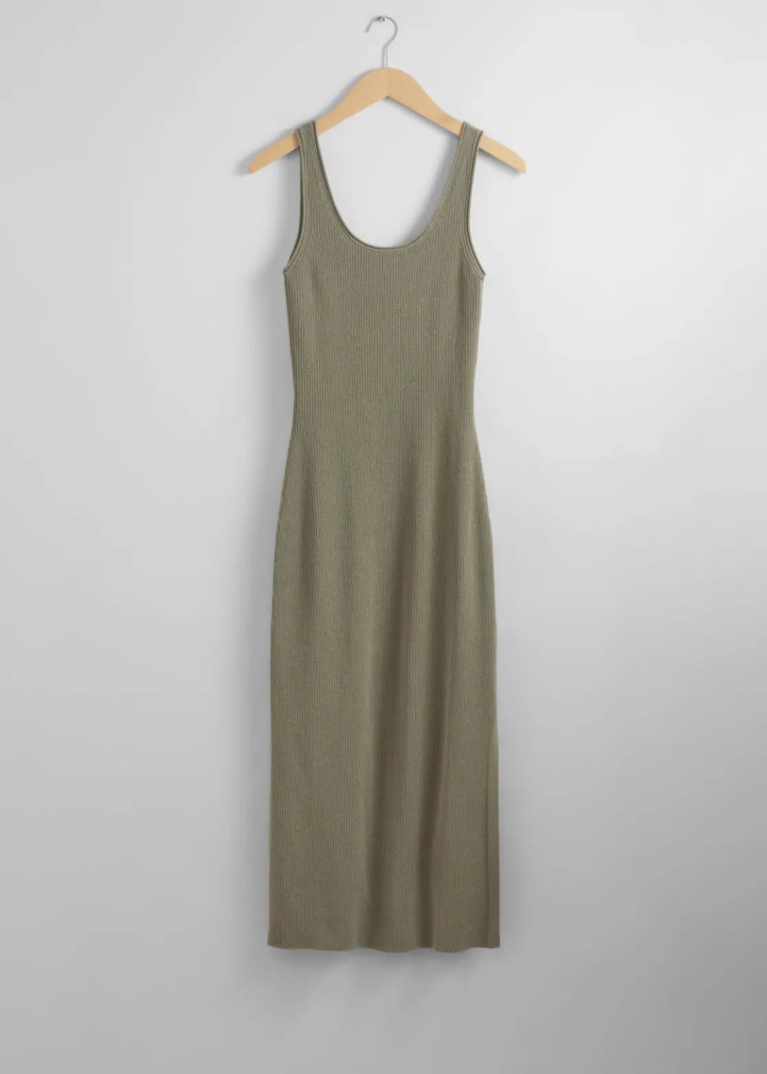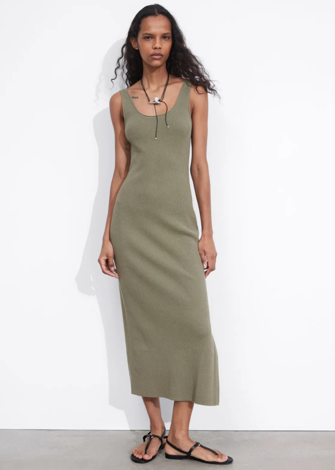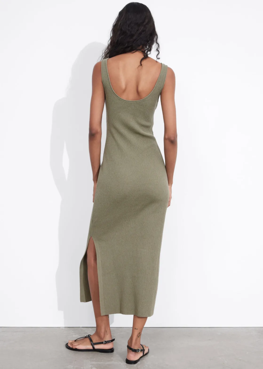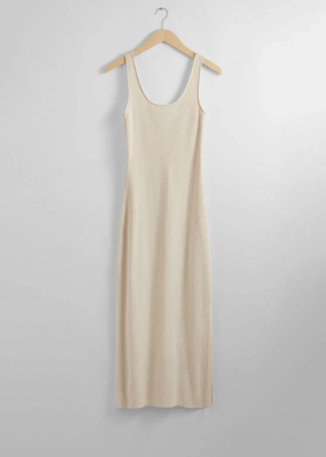 Tank midi dress detailed with a scoop neck and a side slit. Featuring a rib-knit finish.