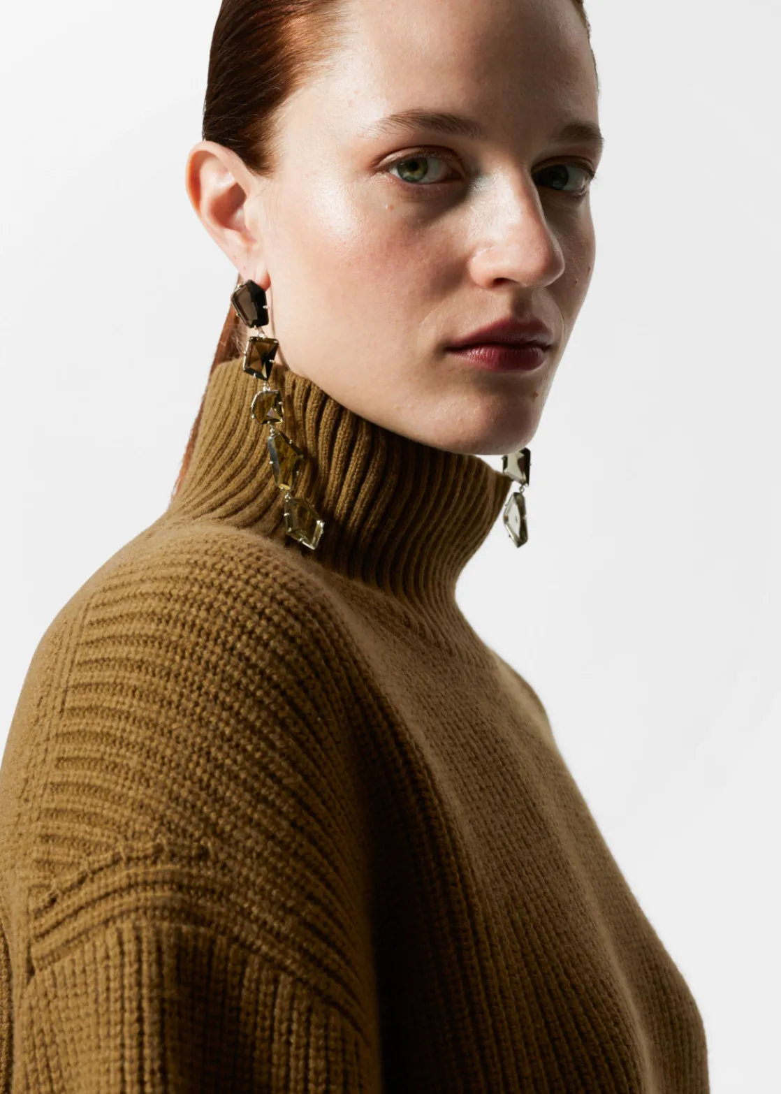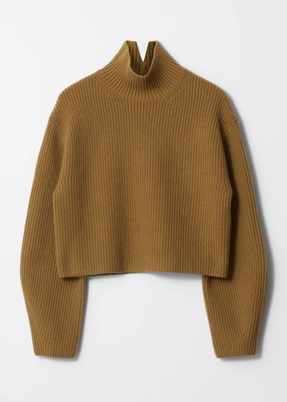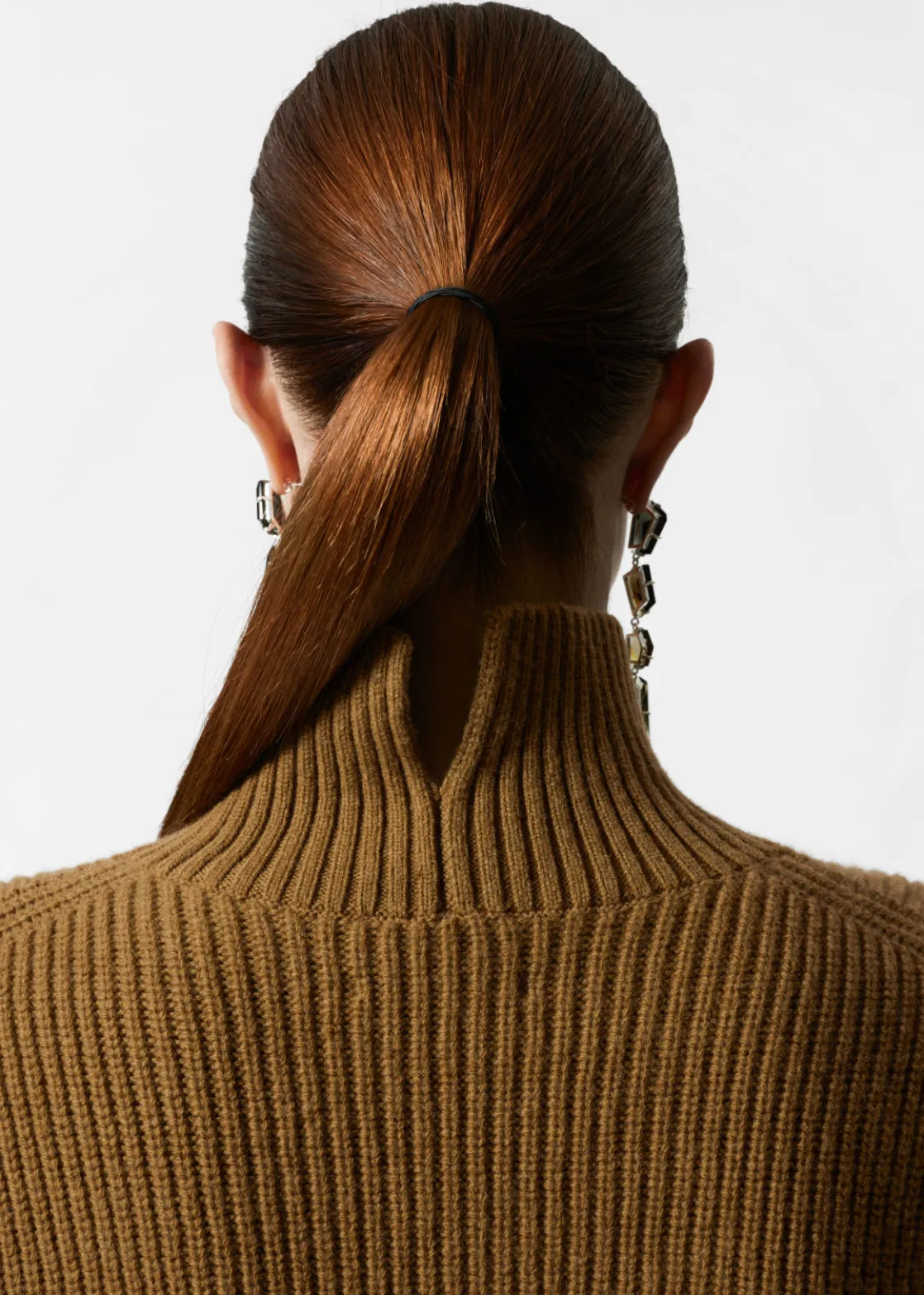 Rib-knit turtleneck jumper with softly rounded sleeves and a slit at the back of the neck.