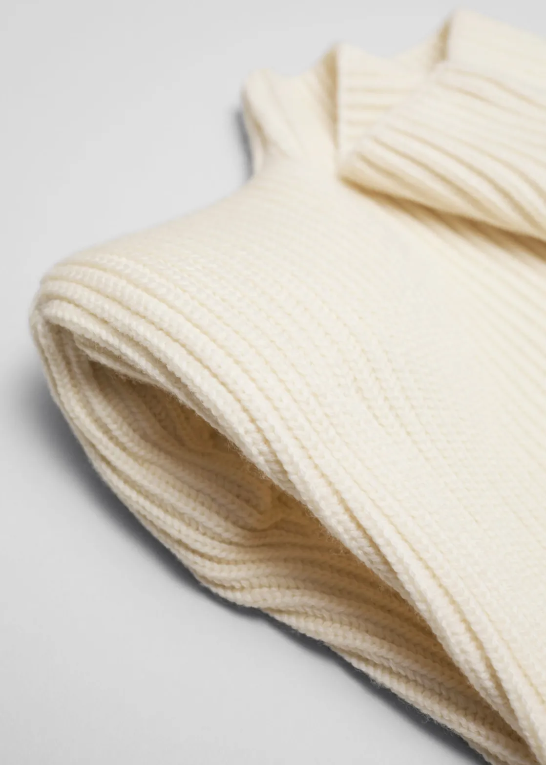 Mock-neck wool-knit bib with a ribbed finish, enhanced by lightly padded shoulders.