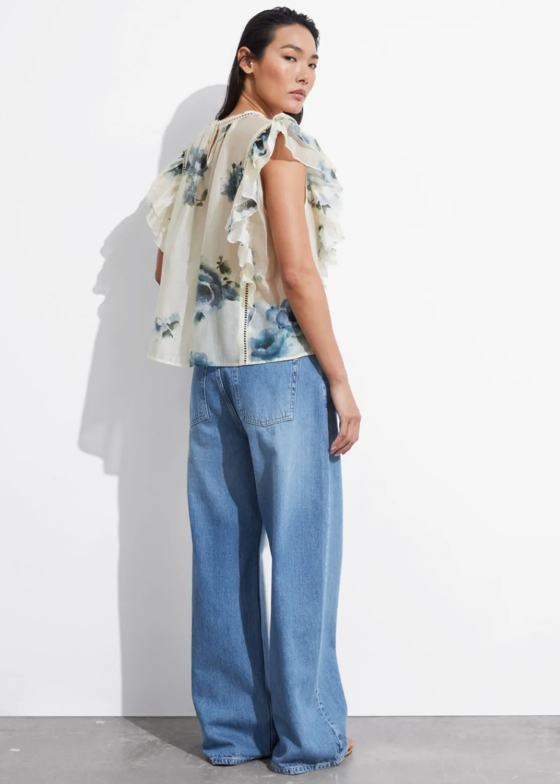 Top traced with layered ruffles along the shoulders and sides. Finished with a pleated chest.