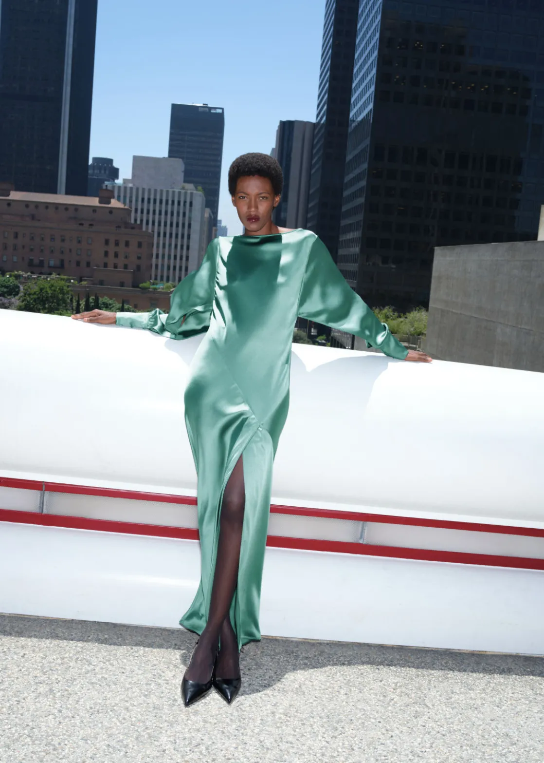 Satin maxi dress featuring a waterfall fold at the back and a slit detail at the side.