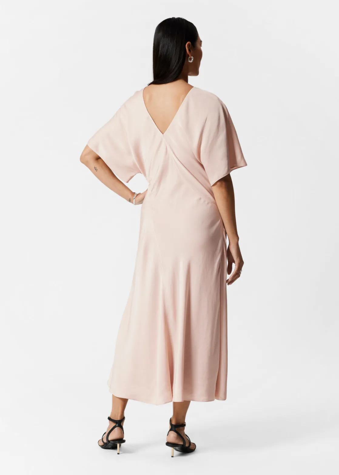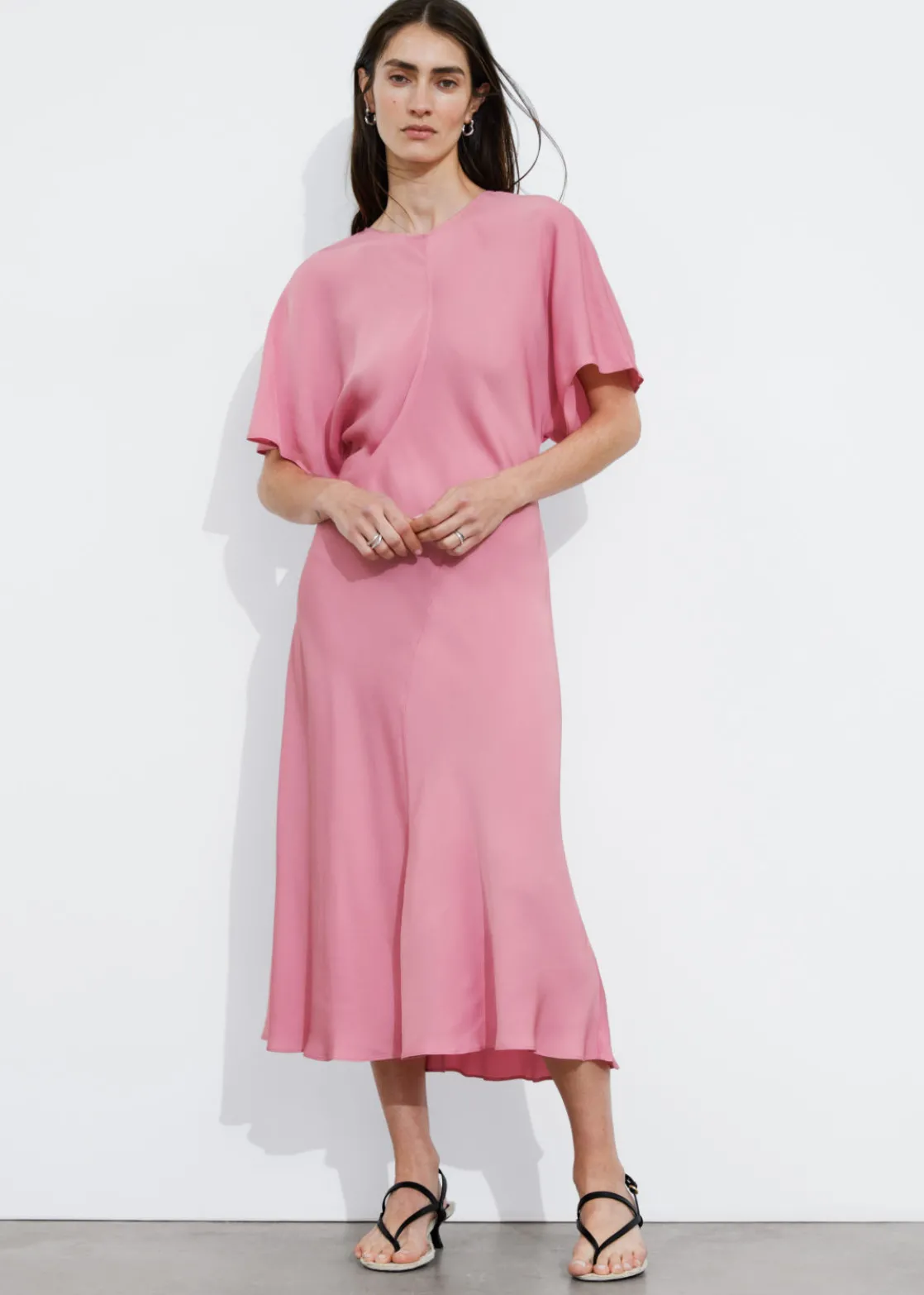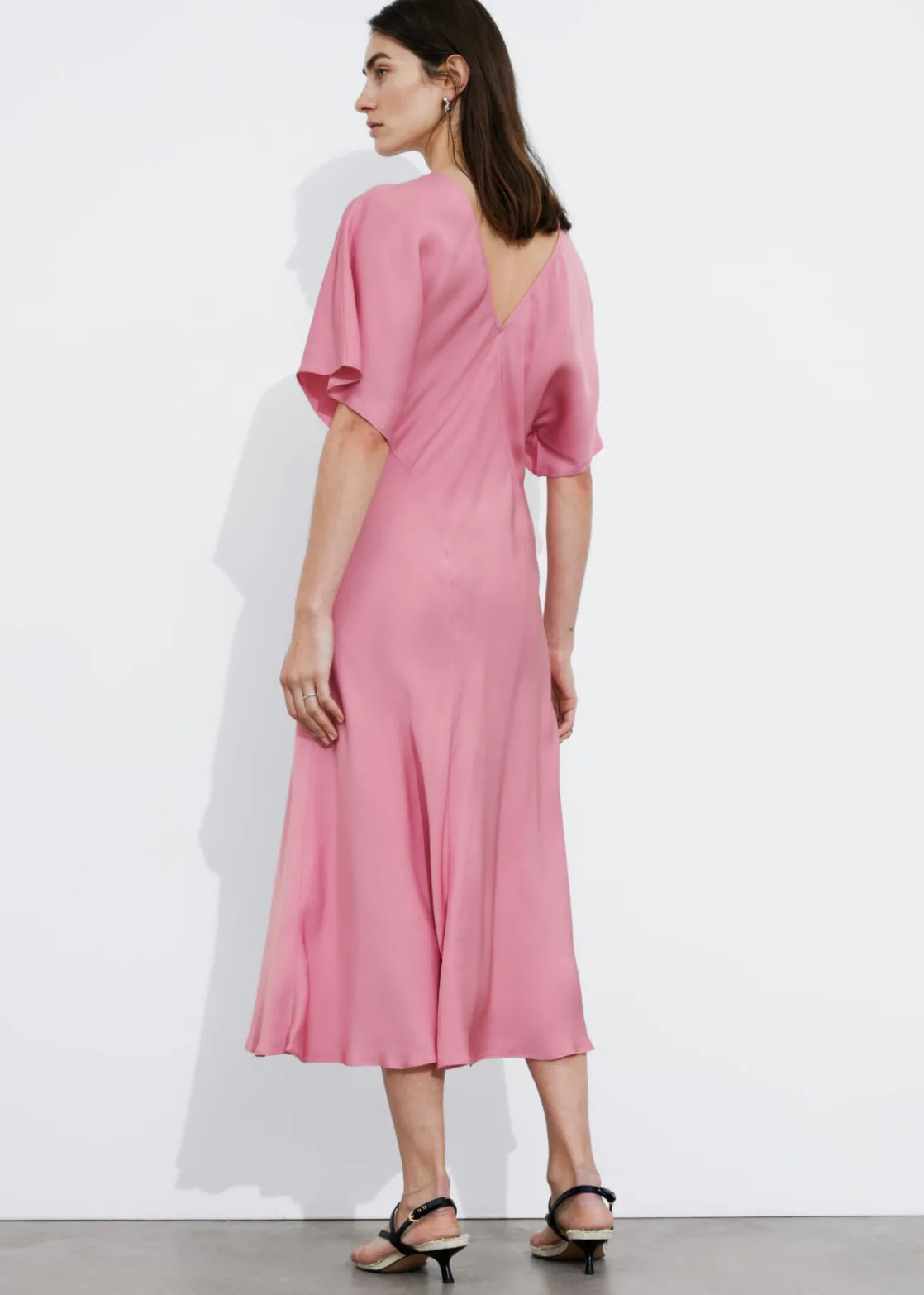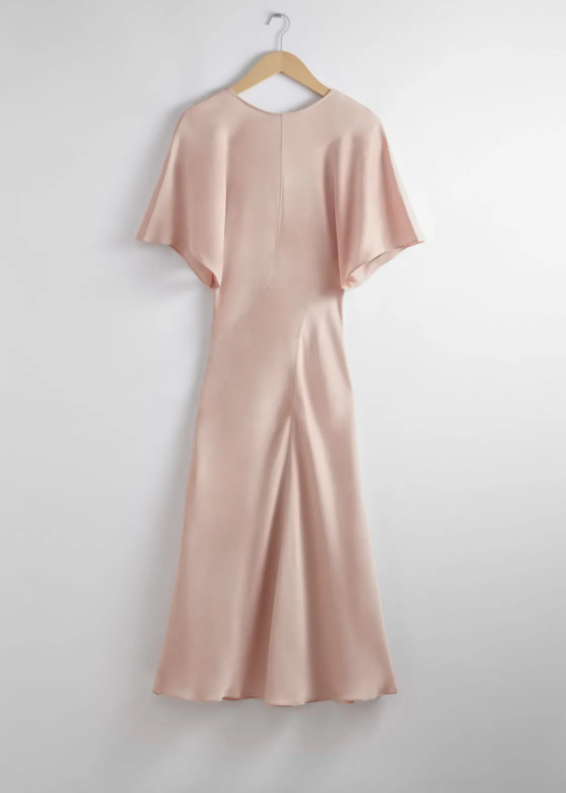 Satin midi dress featuring flutter sleeves and curved, exposed seams for a gently draped finish.