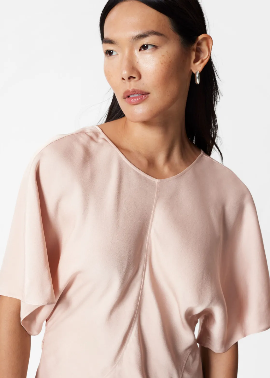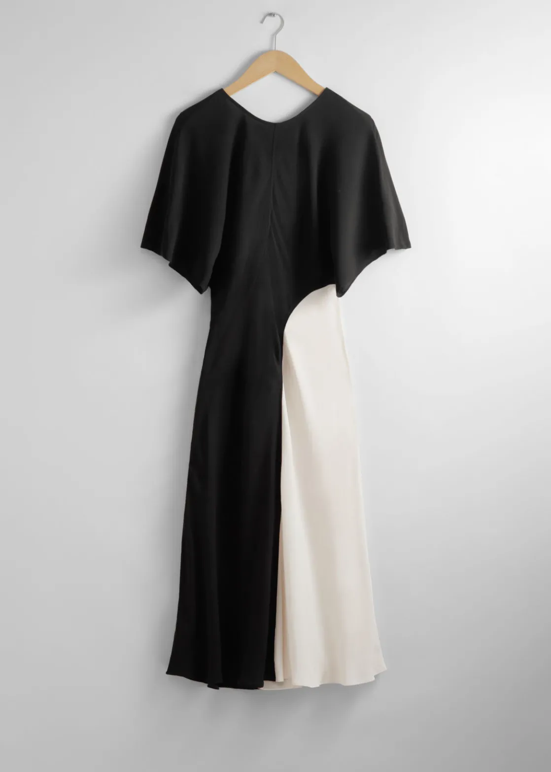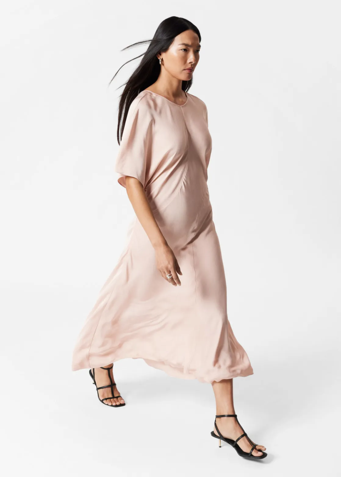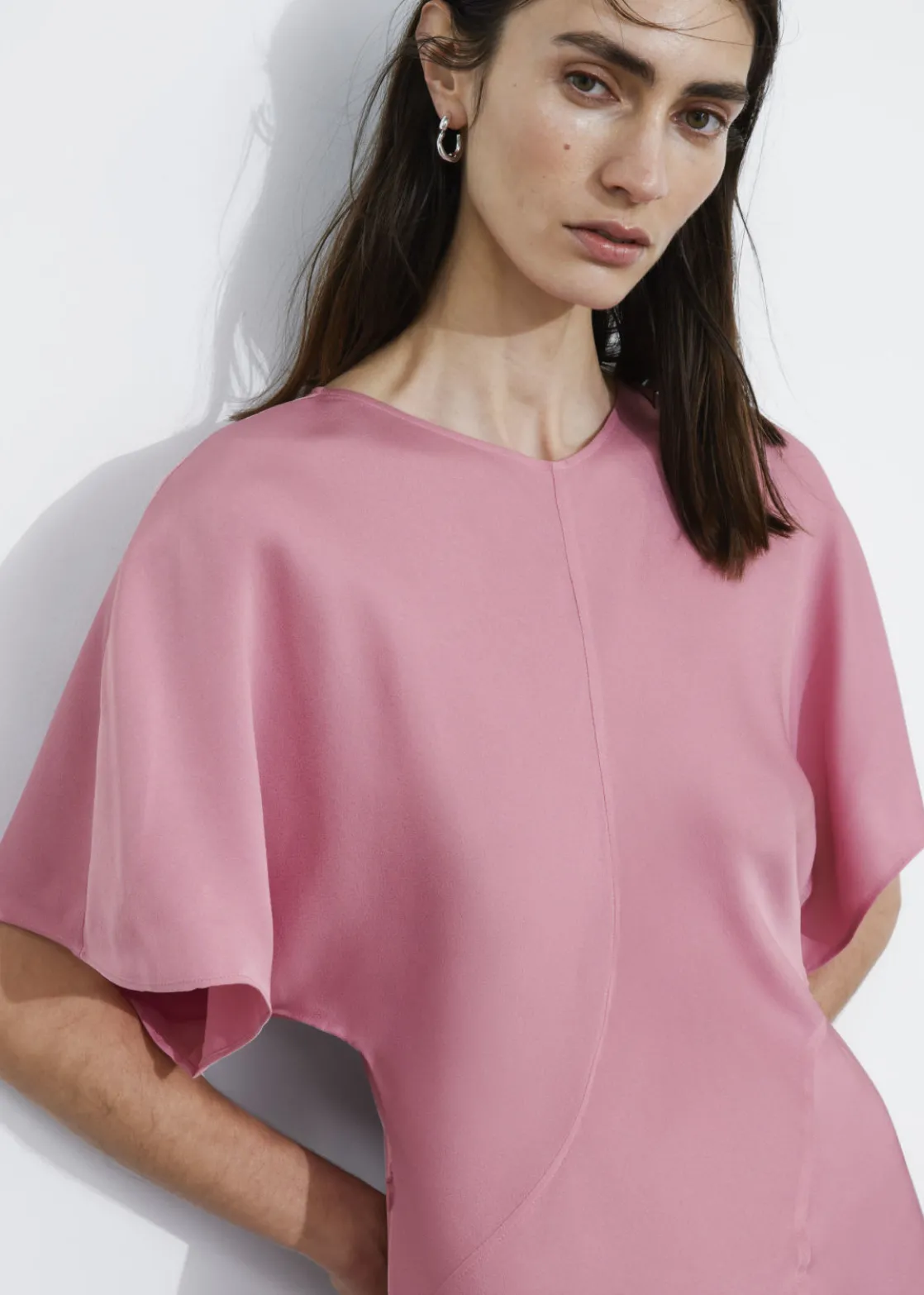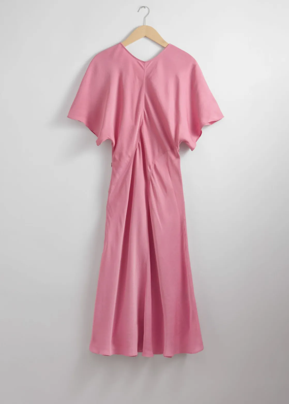 Satin midi dress featuring flutter sleeves and curved, exposed seams for a gently draped finish.