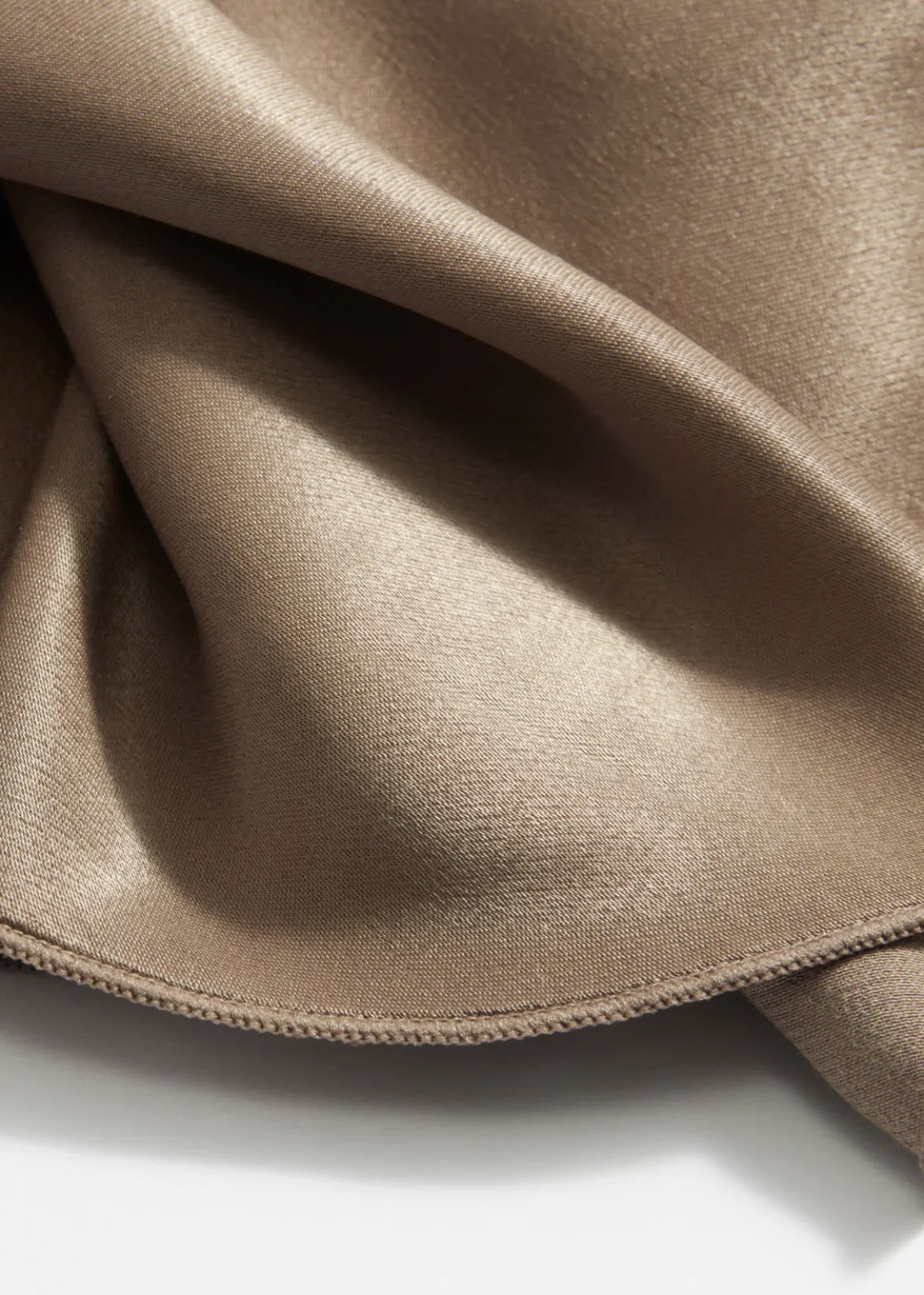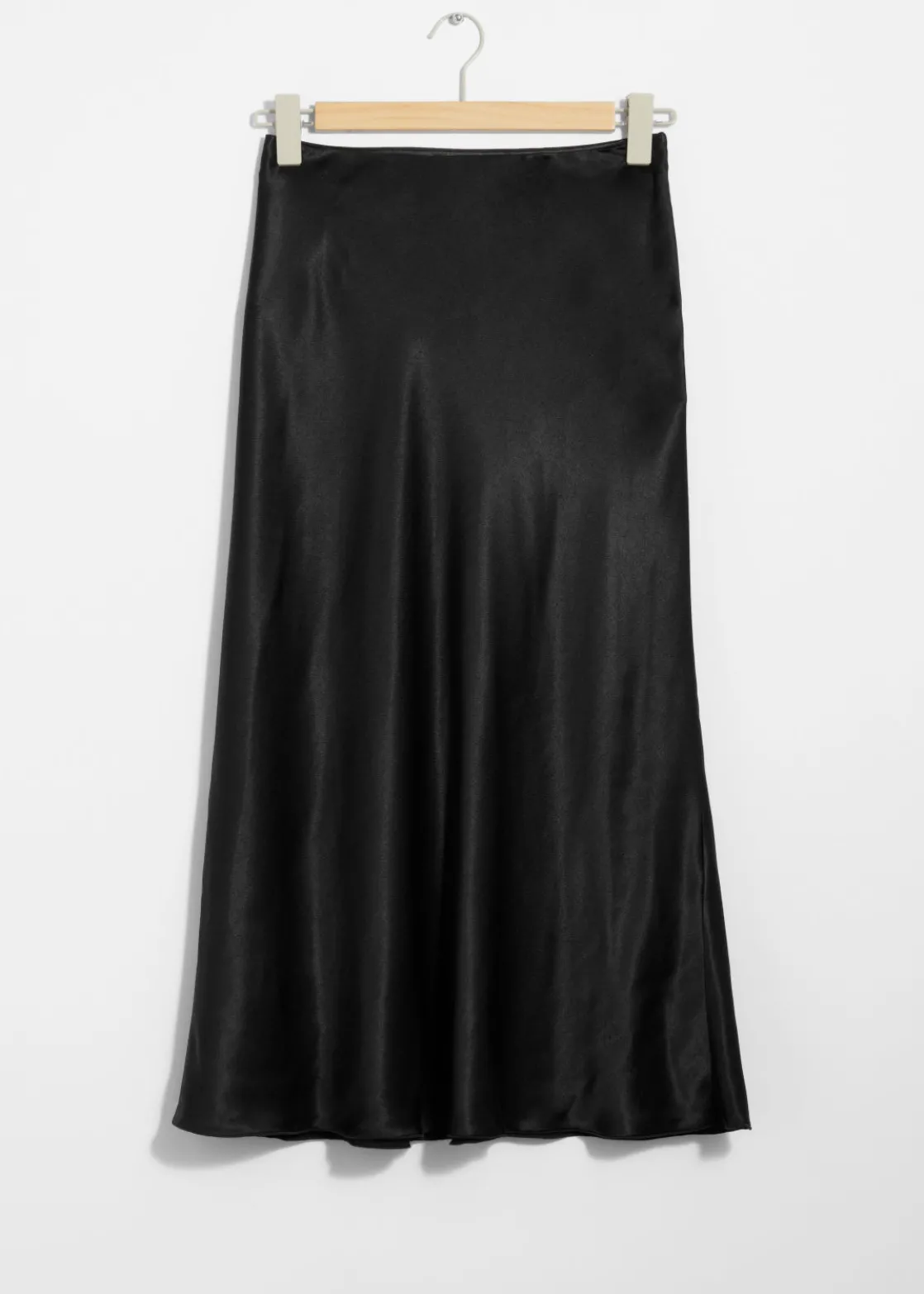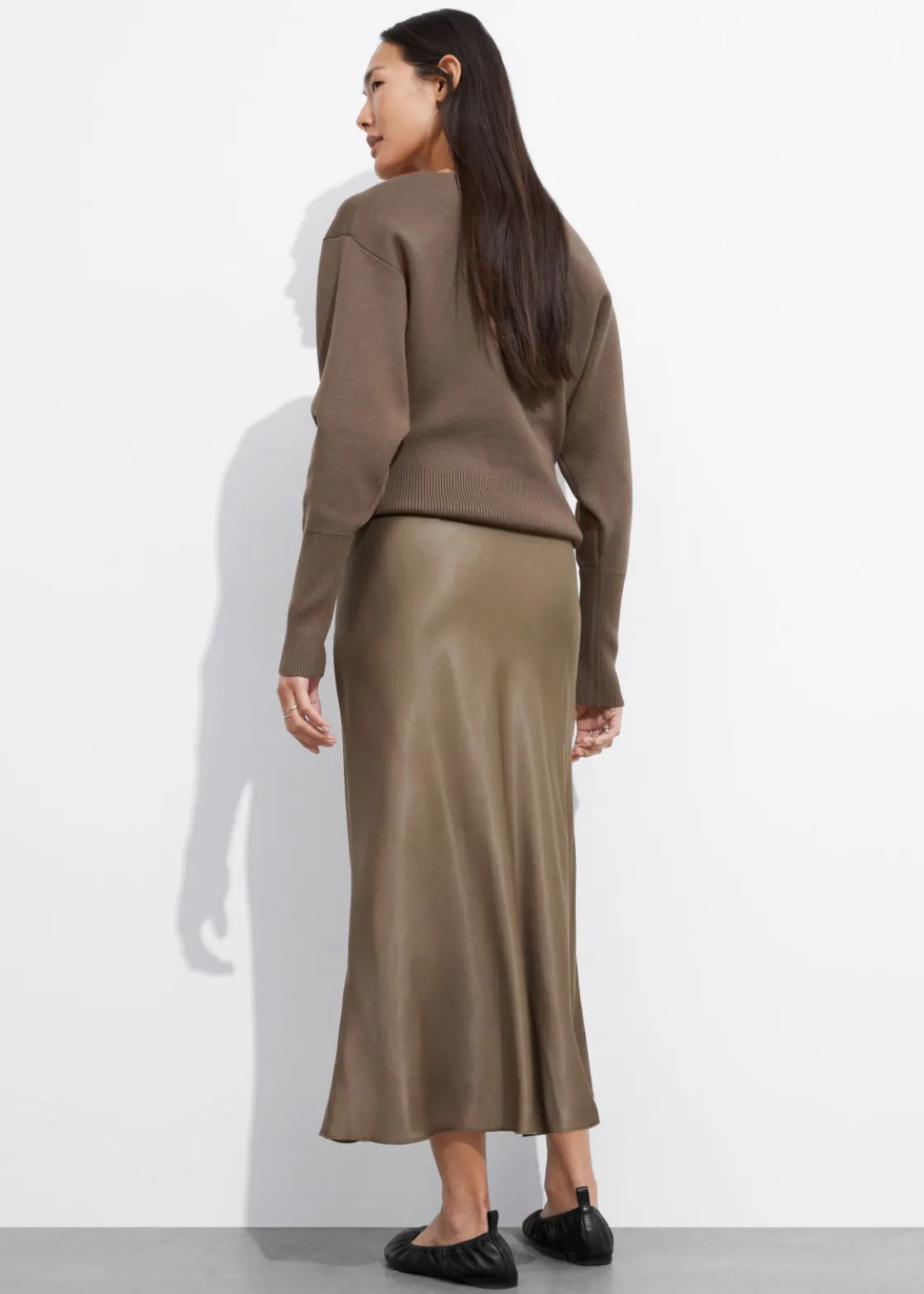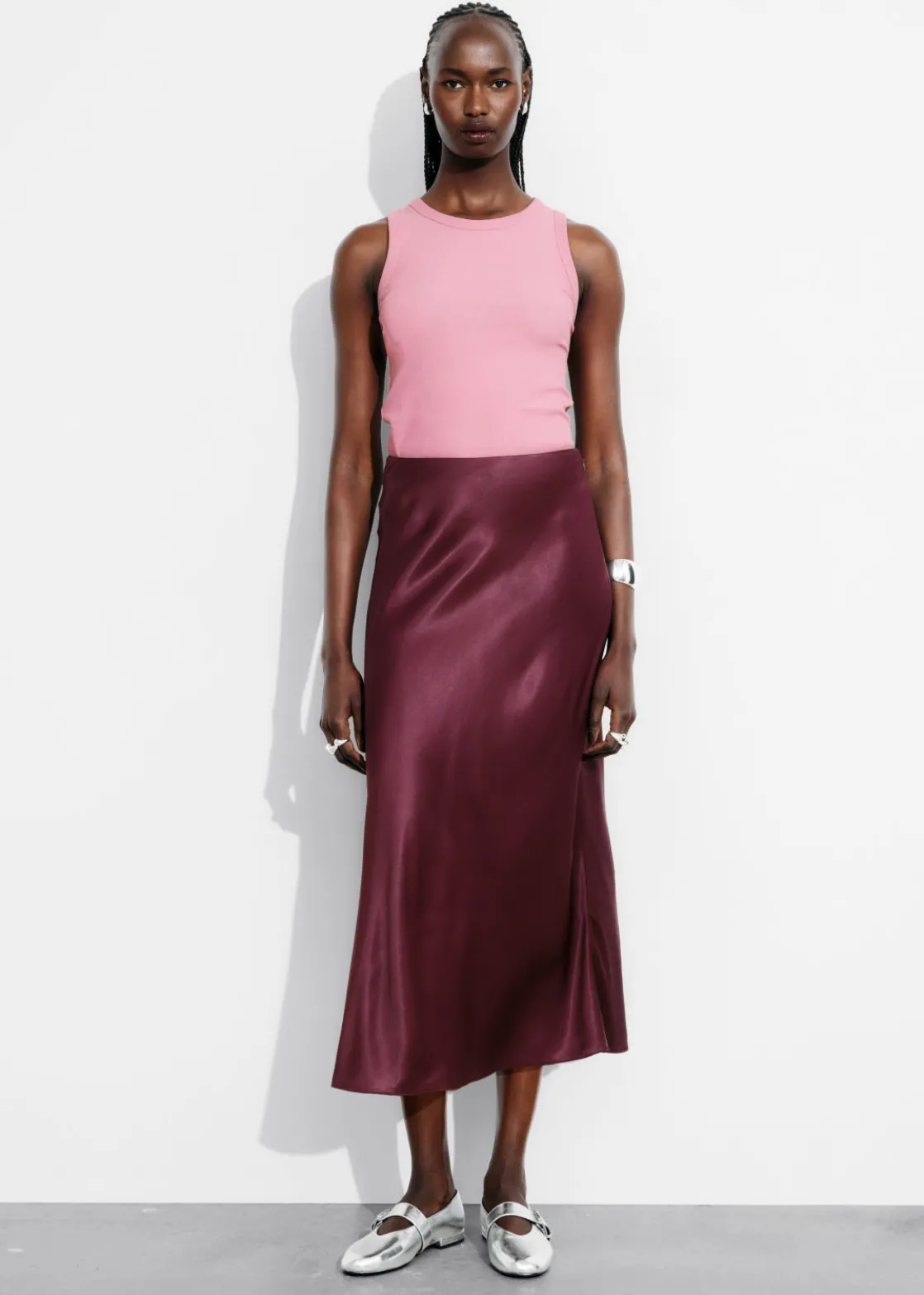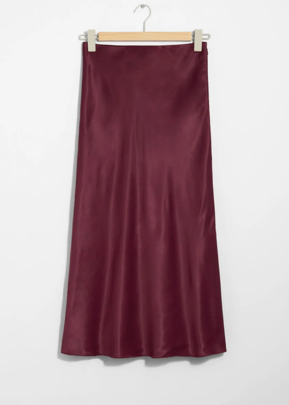 High-waist midi skirt with a glossy satin finish. Secured with a zipper at the side.